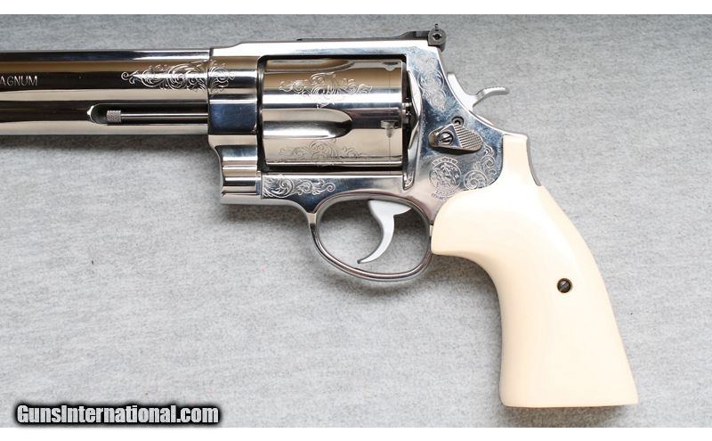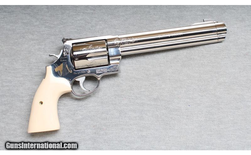 Description: Smith & Wesson Model 500 African Big Game Limited Edition Double Action Revolver with Case Appears as new, no noticeable marring of wood or metal. .500 magnum revolver with 8 3/8" compensated barrel with full length underlug, adjustable sights, intricate engraving and factory grips. "One of Fifty" (see photo of S&W factory letter) marked on right side of frame as well as a gold image of a leopard. Includes display case, factory letter, case key, manual, extra front sight, lock, and two safety keys. .500 S&W Magnum SOLD Chambers: Revolver Metal Condition: As new Wood Condition: Grips are as new Bore Condition: Bright Barrels: 8 3/8 Triggers: Double and single action Butt Pad: Factory grips Sights: Adjustable Item Location: Kansas City, KS |