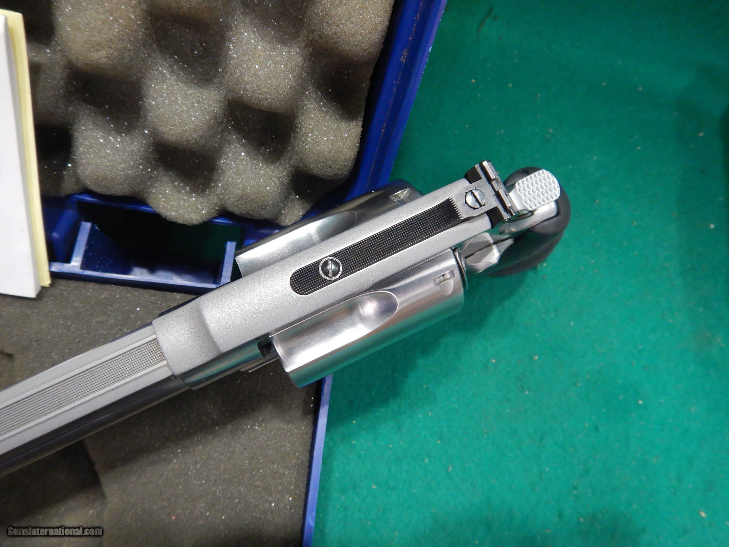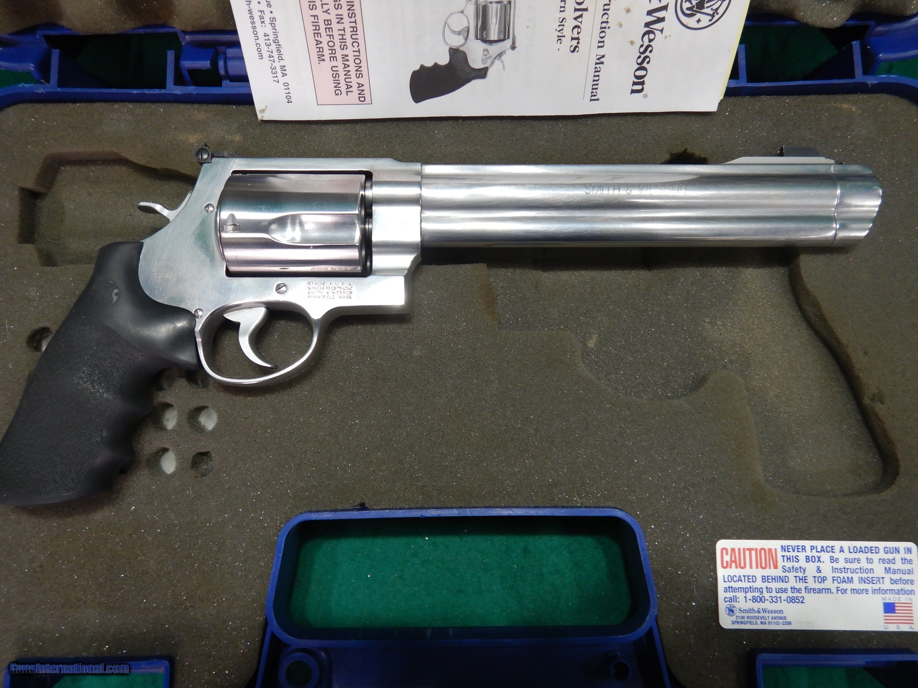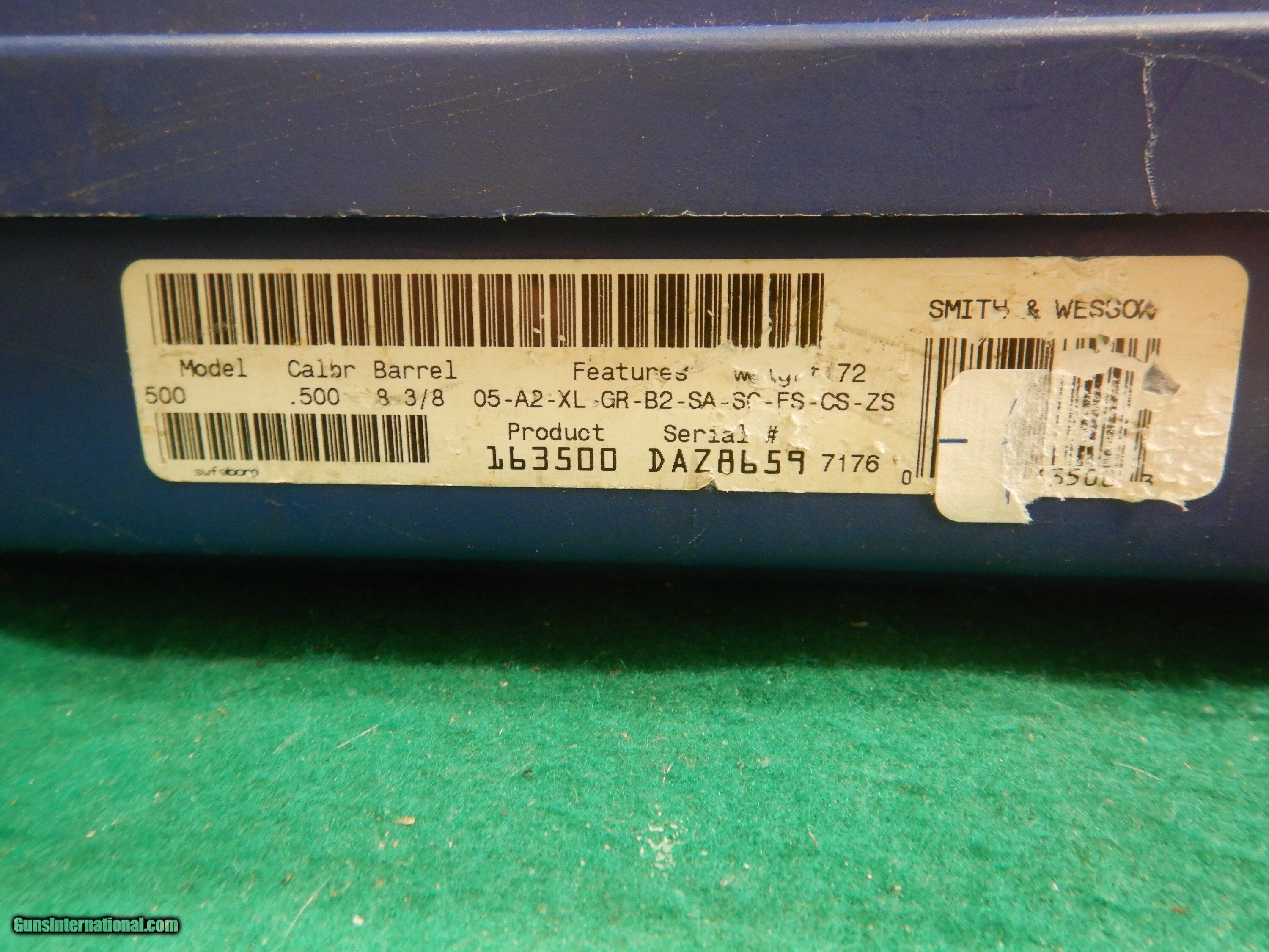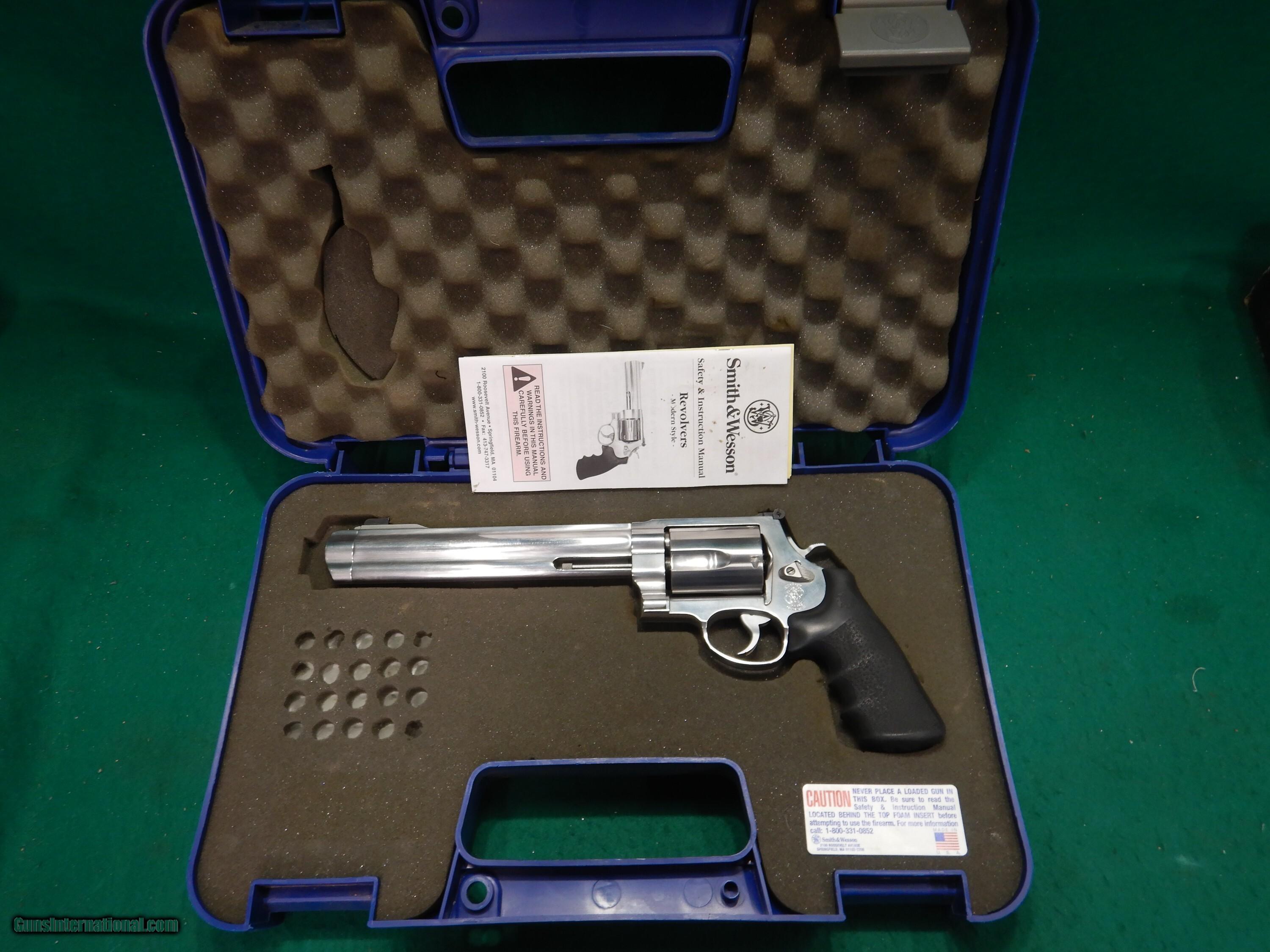 Description: Smith & Wesson Model 500 Magnum Revolver 163500. S/N: DAZ8659. Pre-owned, unfired, and like new in original box with paperwork. In 2003 the gunsmiths and engineers at Smith & Wesson wanted to deliver maximum power for serious handgun hunters. The power they sought required an entirely new frame, the massive "X-Frame™," and was the basis for the new Model S&W500™, the most powerful production revolver in the world. This ushered in the era of the "big gun" and was only the beginning. For ultimate power and velocity there's nothing even close to an X-Frame model handgun. Product Features:
