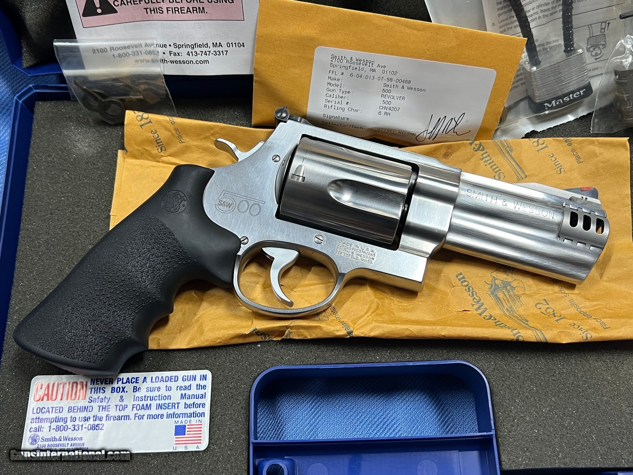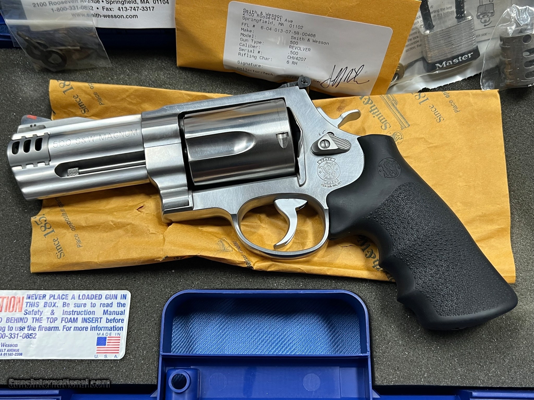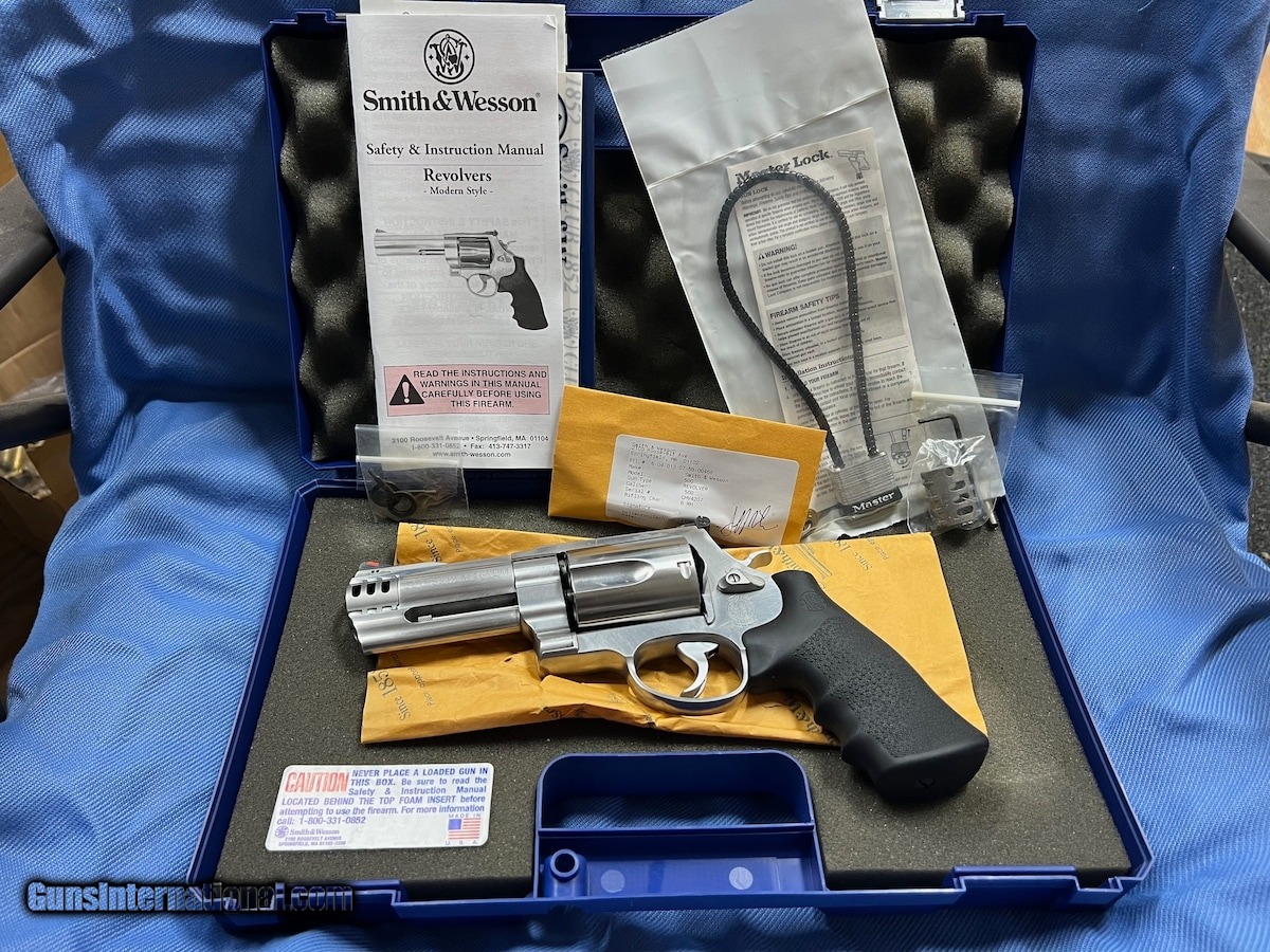 Description: Guns Listing ID: 510860 SMITH & WESSON MODEL 500 in 500 S&W Magnum. Stainless SA/DA, X-frame, 5 shot cylinder, 4\" barrel with white outline adjustable rear sight, red ramped front sight, and Smith & Wesson Rubber Grip.This gun comes with two interchangeable compensators ( 1 for lead bullets / 1 for jacketed bullets ). It also comes with the original hardcase, Internal lock keys and a child safety lock. This is a pre-owned revolver that has been shot. SOLD Manufacturer: SMITH & WESSON Model: S&W500 Caliber Info: 500 SMITH & WESSON MAGNUM Condition: Used - Non-Certified Barrels: 4" barrel Finish: STAINLESS |
