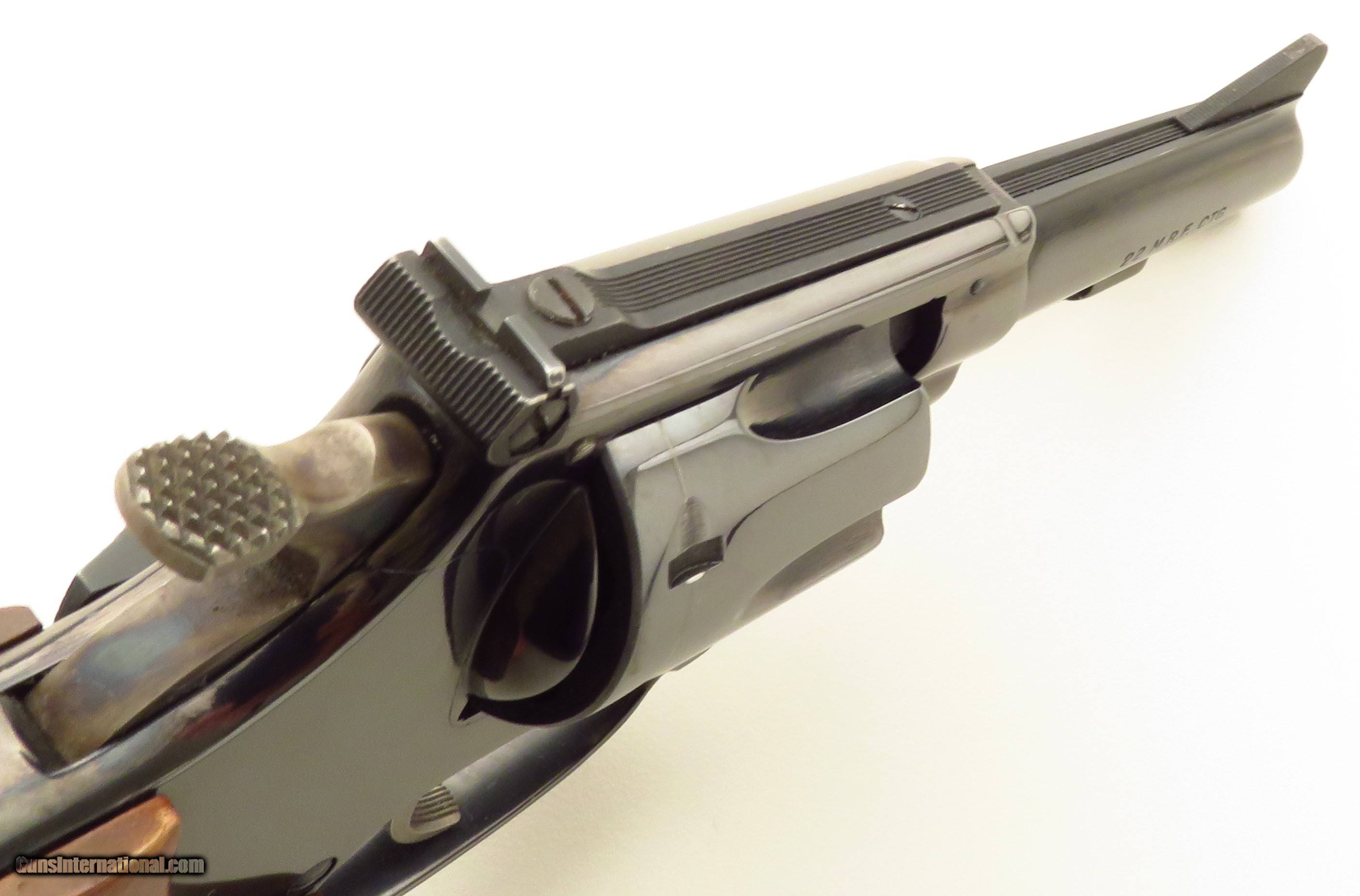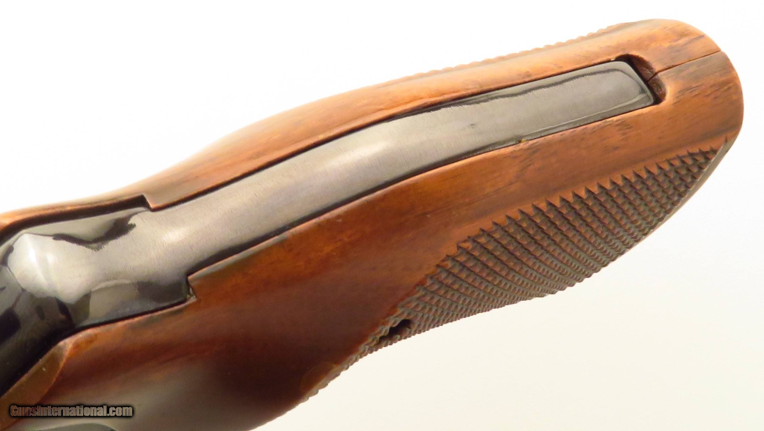 Description: Smith & Wesson Model 51 (no dash) .22 Magnum. Made circa 1971, M33096 has a 3.5-inch barrel (pinned, integral serrated rib, serrated blade front sight), adjustable rear sight, color case hammer (narrow, checkered spur), recessed cylinder, color case trigger (narrow, serrated face) square butt and Herrett grips. No box, papers or original grips are present. CONDITION: The bore is strong and bright. Mechanics are solid. Clearly seldom fired, metal finish is at least 95 percent. The price is firm. $1,250 plus shipping. Handgun Caliber: .22 WMR (.22 Magnum) Price: $1,250.00 Shipping: $40.00 Contact Seller |