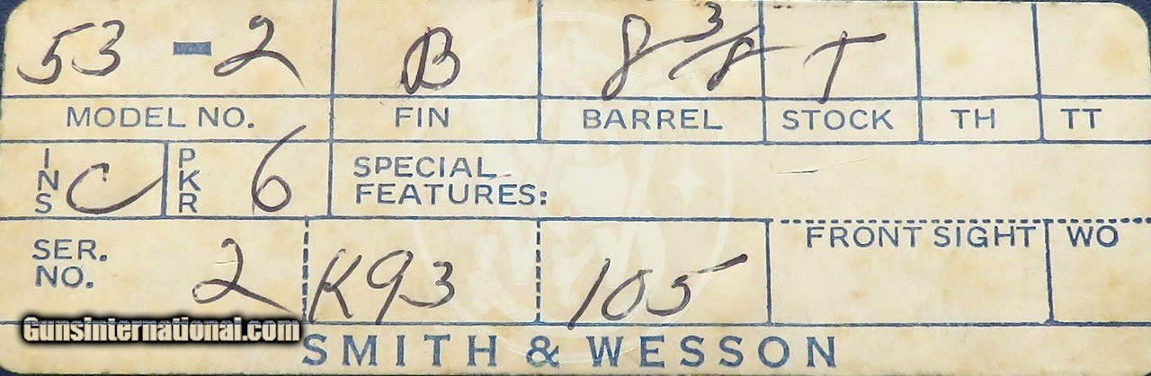 Description: Smith & Wesson Model 53-2 .22 Remington Jet & .22 LR cylinders. Made circa 1972, serial 2K93105 has an 8.375-inch pinned barrel (integral serrated rib, blade front sight with red insert). Features include an adjustable rear sight (white outline), color case hammer (wide/target with checkered spur and rimfire/centerfire toggle), recessed cylinder, color case trigger (wide/target with serrated face), square butt and checkered target grips. CONDITION: The bore is outstanding, strong and bright. Trigger pulls are very smooth. The cylinder rotates without stutter, locks tightly and release is smooth. Metal finish is at least 98 percent. Grips are at least 99 percent. .22 LR CYLINDER: The recessed .22 LR cylinder stands at approximately 99 percent condition. INCLUSIONS: The original box with correct end label, five Jet cartridge adaptors, cleaning rod/brush, long "tapered wiper" and cardboard insert "cut out" for the extra cylinder recess. The price is firm and layaway is available. $2,500 plus shipping. SOLD Handgun Caliber: .22 Remington Jet (.22 Jet, .22 Centerfire Magnum) |