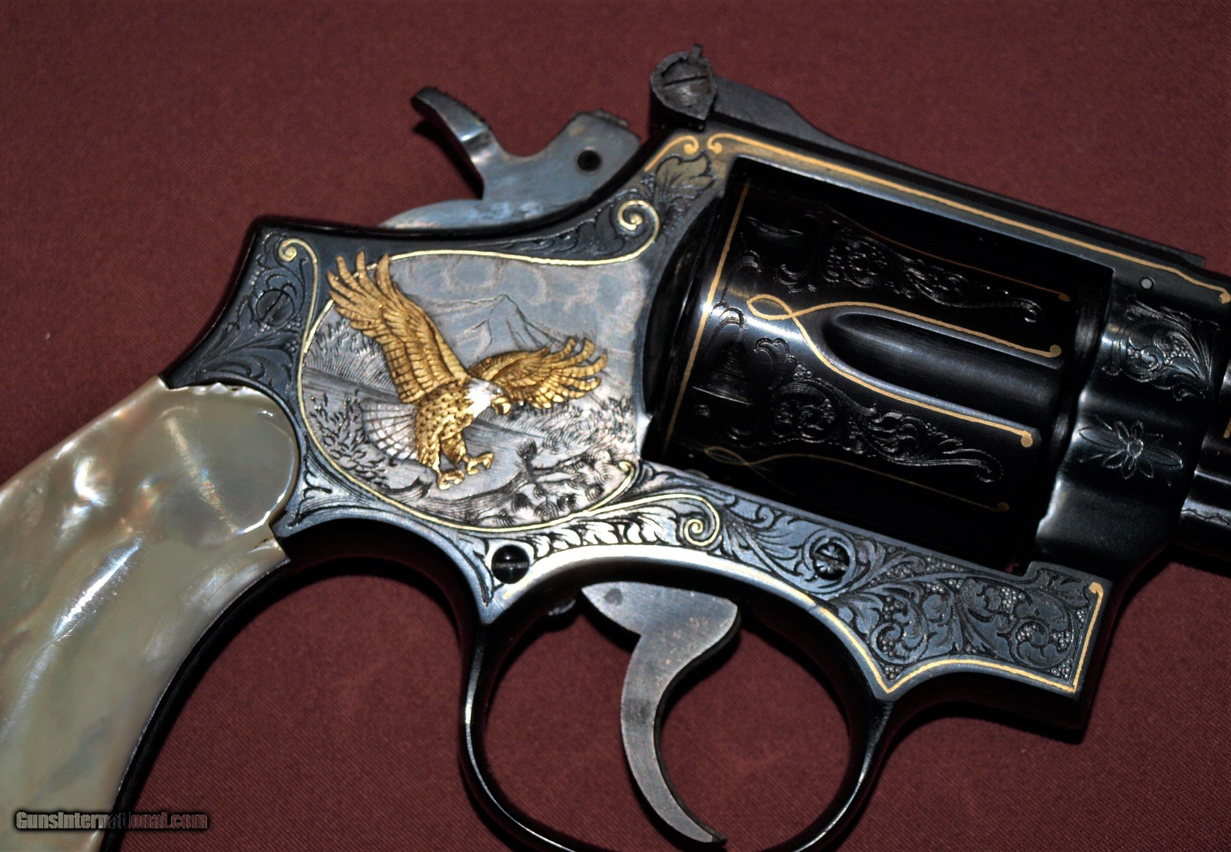 Description: SMITH & WESSON -Angelo Bee Engraved Offered here for your perusal is this Engraved SMITH & WESSON model 53-2 Revolver chambered for Remington .22 Jet that has been beautifully engraved by Master Engraver Angelo Bee. He has almost fully engraved this revolver in classic banknote style highlighted with flowing scroll work and punch dot shadowing and that also features real gold and silver inlay caricatures and real gold inlay borders. The lettering in SMITH & WESSON and 22 MAGNUM along the 6 inch barrel are also gold inlaid. The left side depicts a Golden Eagle landing and the right side shows an Owl swooping down on a running rabbit is incredible detail. This masterpiece is signed by the engraver A.BEE. This revolver was manufactured in 1972. The barrel is pinned and the cylinder recessed to accomdate the included .22 L.R. steel inserts. The stocks are genuine mother of pearl. $30.00 shipping, $100.00 fully insured. Don't miss this opportunity to own a top of the line collectable S&W revolver. For sale and ships only to an FFL within the U.S.A. Payment expected within 8 working days. NO PAYPAL! SOLD Manufacturer: SMITH & WESSON Model: Model 53-2 Caliber Info: 22 Rem Jet Barrels: 6 Inch |
