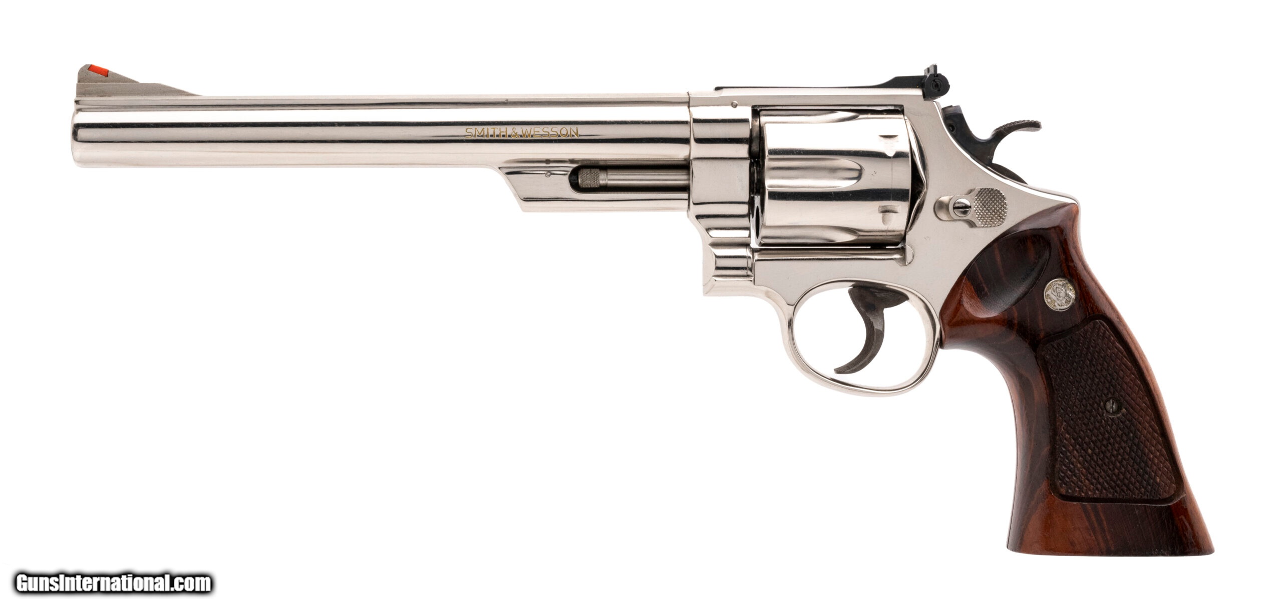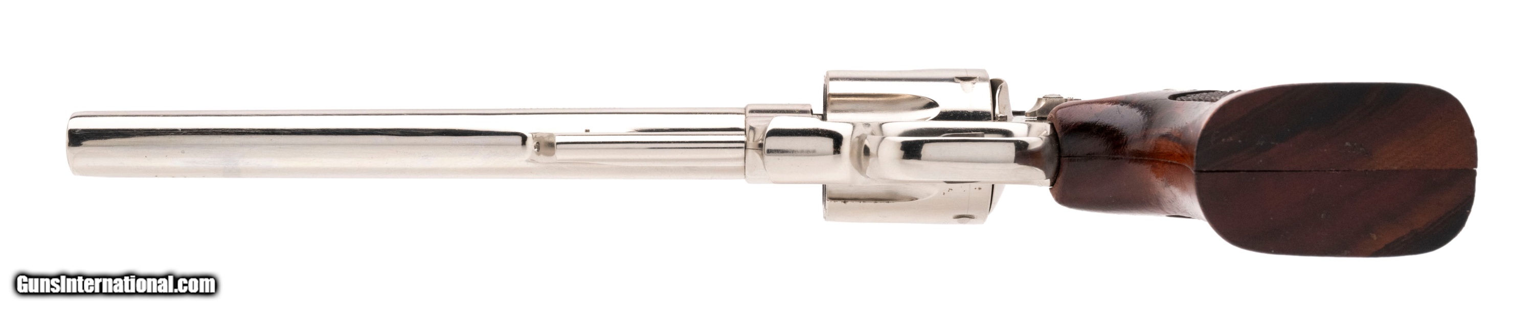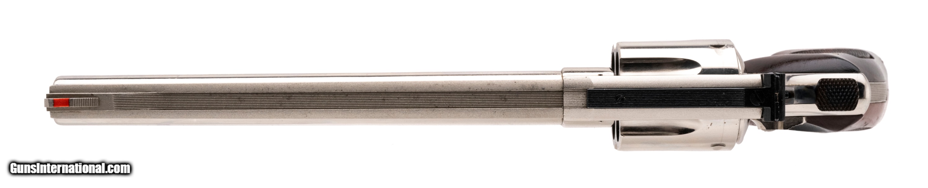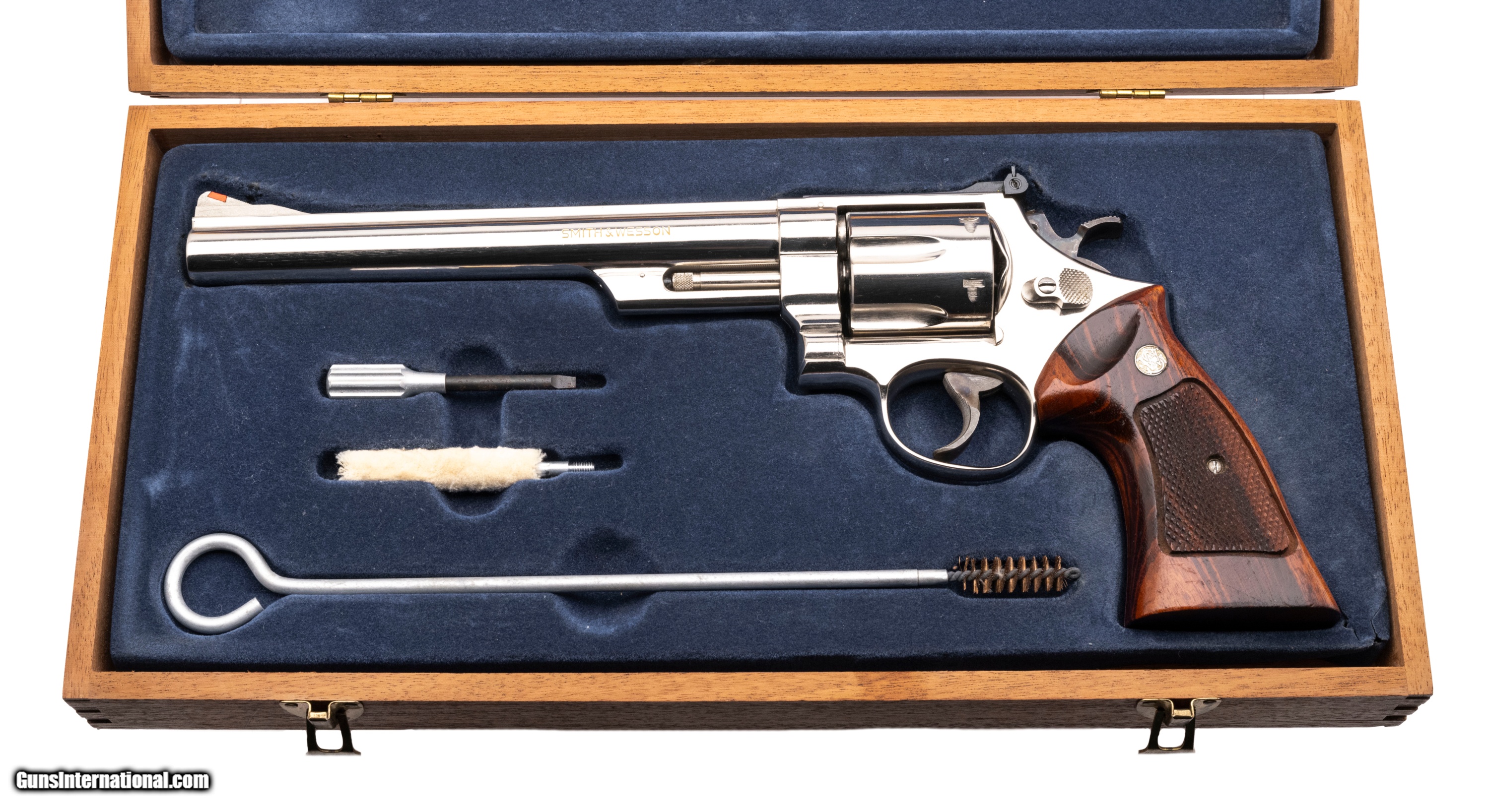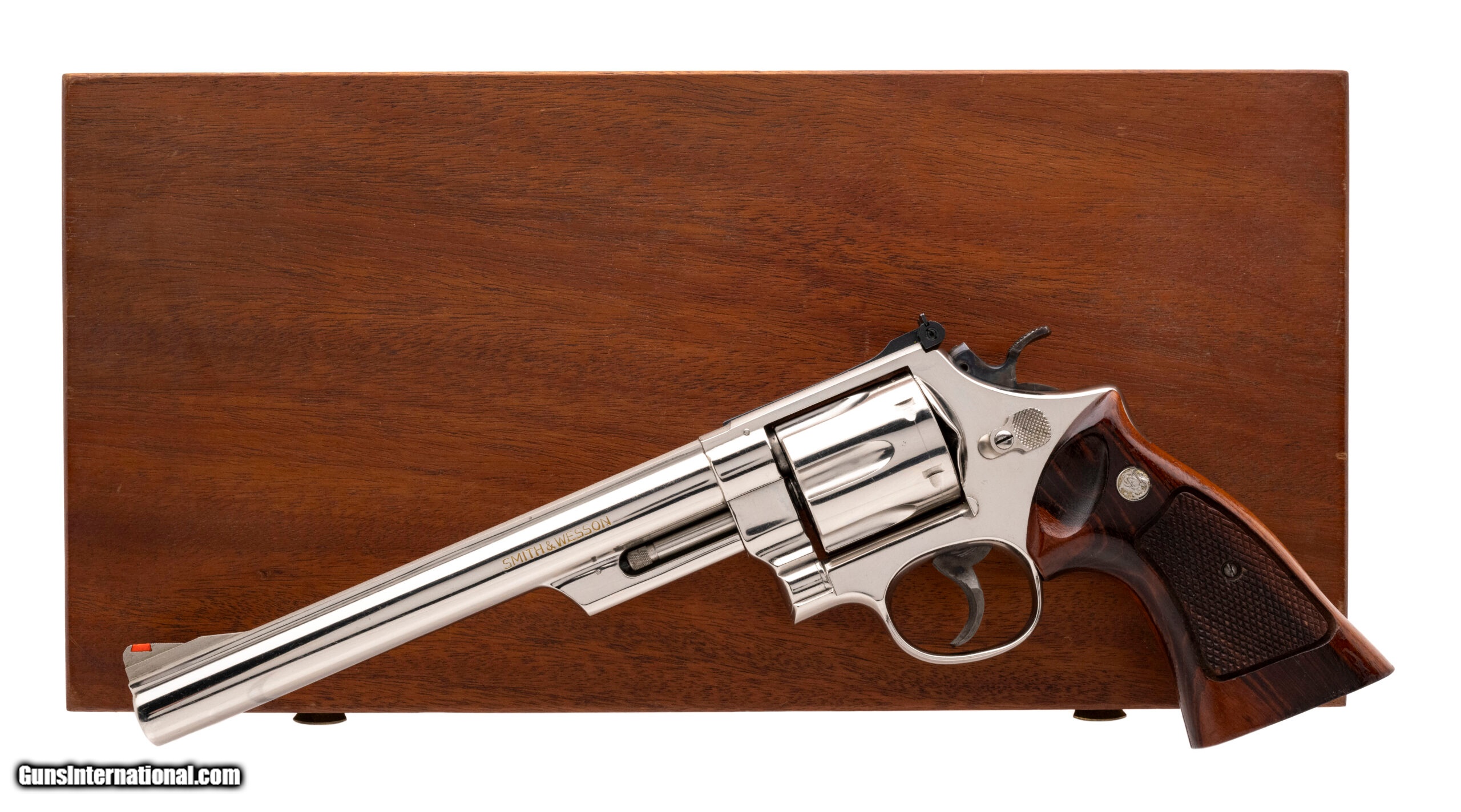 Description: "SN: N451659. 1970's vintage .41 Mag with an 8.375"" barrel. N-frame revolver with nickel finish, pinned barrel and recessed cylinder. Excellent condition with wooden presentation case and tools. SOLD |