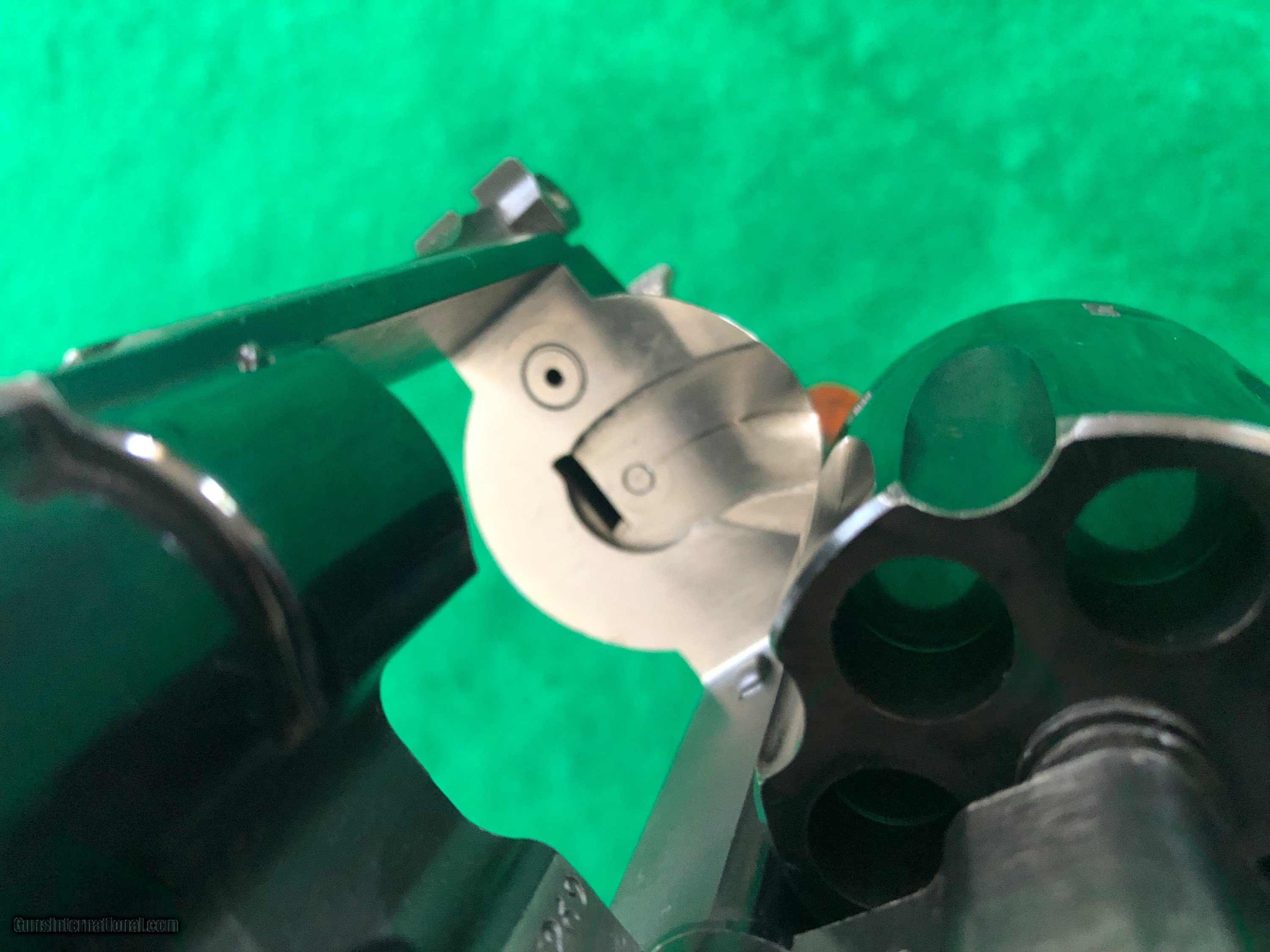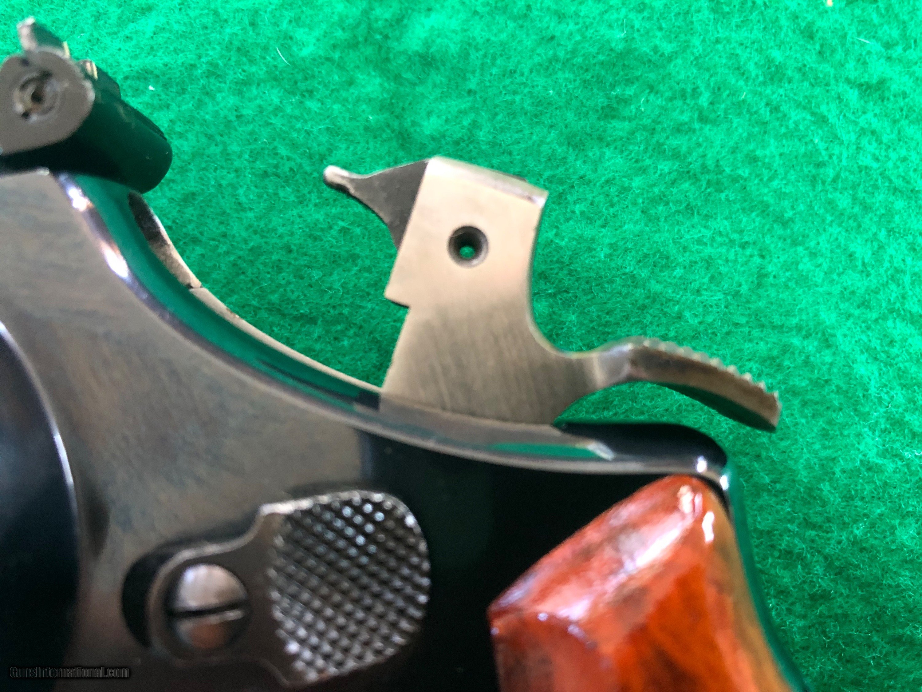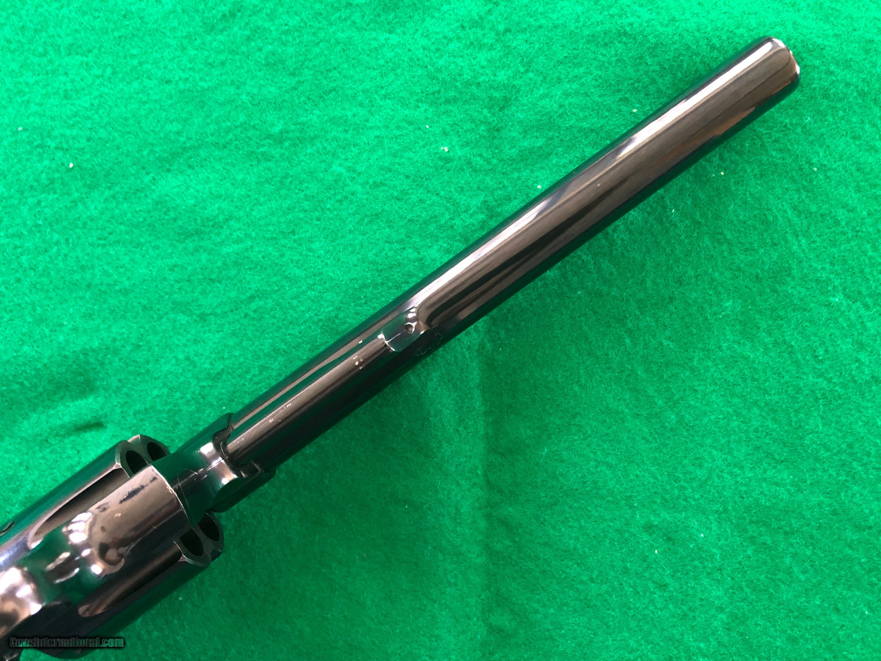 Description: Very nice condition, lightly used 41 Magnum revolver. Excellent bore, rifling, chambers. Typical Bob Chow revolver action job, including smoothing-up the internals, polish the sides of the hammer and trigger and the recoil shield. How many revolver action jobs did Chow do? Probably not too many. Needless to say, the action is wonderfully smooth. Smith & Wesson Model 57 no dash 8-3/8" barrel Ser# N1452xx made 1973 (What looks like streaking in the pics is the typical challenge with photos of glossy Smiths. Its just oil we can't completely wipe off) Pinned barrel, recessed/counterbored cylinder, Target Hammer, Trigger, Grips. Minor scattered nicks, few small blemishes in the finish, but you got to look close real to see them. CA sales OK by face-to-face PPT in the SF East Bay Area. All others, FFL needed to ship. Email or call for more info. SOLD Handgun Caliber: .41 Remington Magnum |