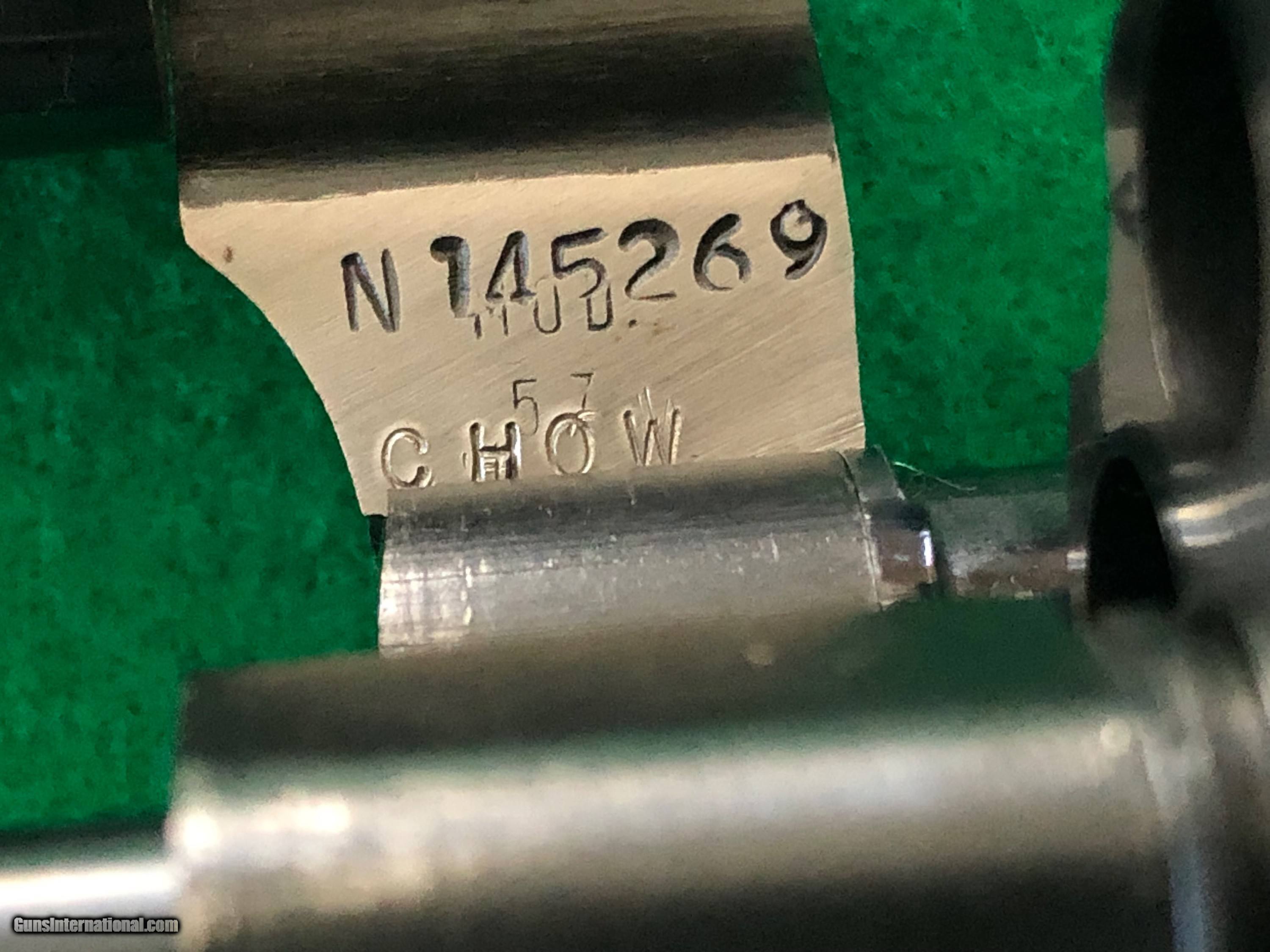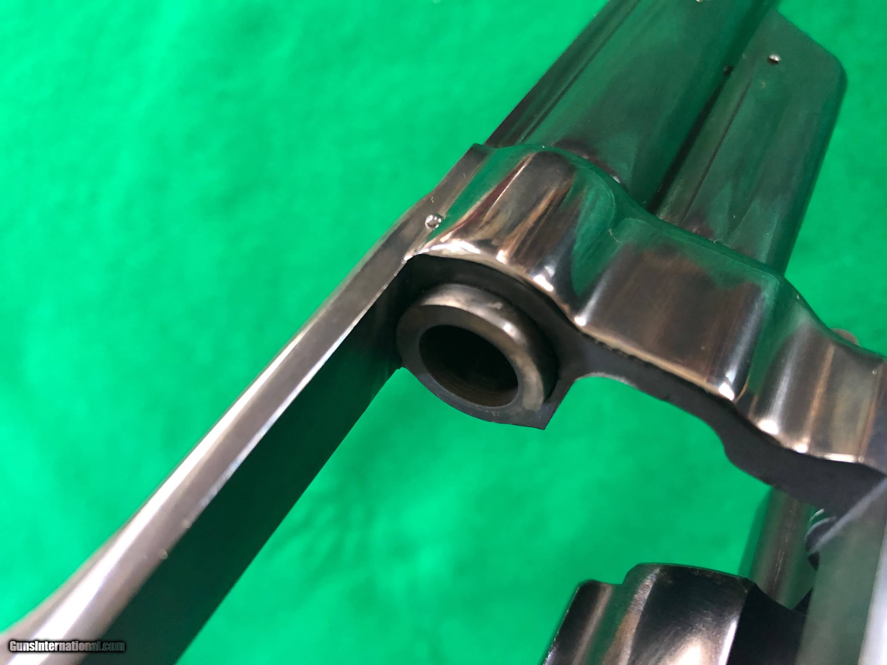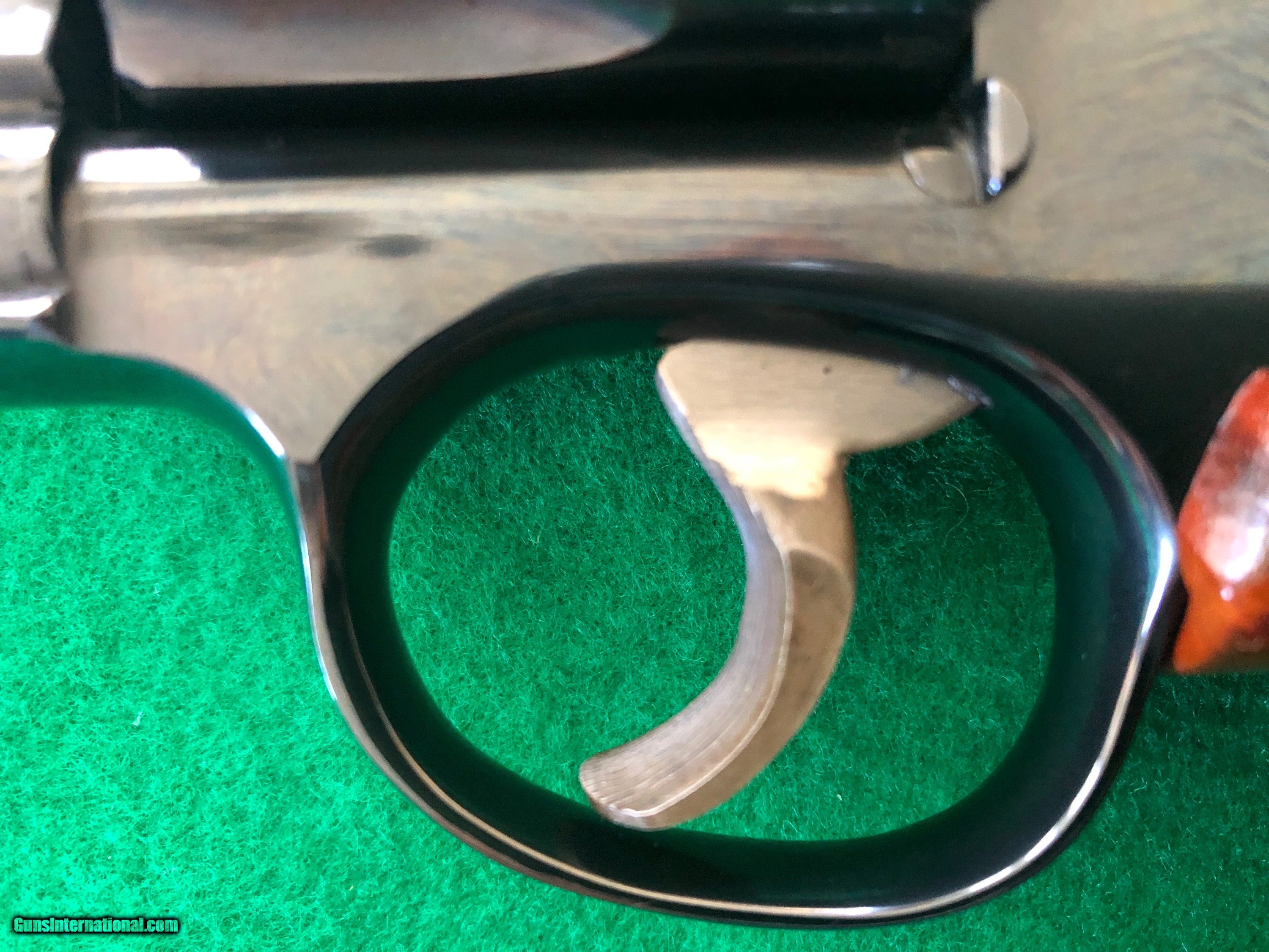Description: Very nice condition, lightly used 41 Magnum revolver. Excellent bore, rifling, chambers. Typical Bob Chow revolver action job, including smoothing-up the internals, polish the sides of the hammer and trigger and the recoil shield. How many revolver action jobs did Chow do? Probably not too many. Needless to say, the action is wonderfully smooth. Smith & Wesson Model 57 no dash 8-3/8" barrel Ser# N1452xx made 1973 (What looks like streaking in the pics is the typical challenge with photos of glossy Smiths. Its just oil we can't completely wipe off) Pinned barrel, recessed/counterbored cylinder, Target Hammer, Trigger, Grips. Minor scattered nicks, few small blemishes in the finish, but you got to look close real to see them. CA sales OK by face-to-face PPT in the SF East Bay Area. All others, FFL needed to ship. Email or call for more info. SOLD Handgun Caliber: .41 Remington Magnum |