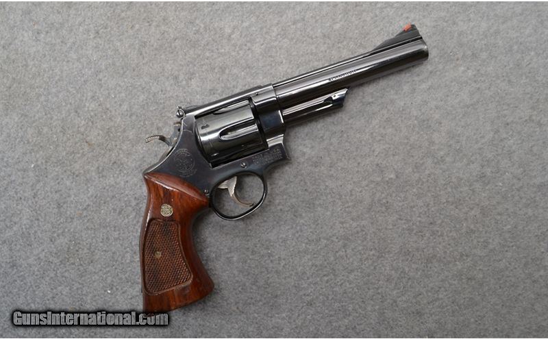 Description: Smith & Wesson model 57 in .41 Remington Magnum. Six inch barrel in front of a six-round cylinder. Blued finish on firearm is in great shape with a few minor scratches noted throughout. None appear to go through the finish. Some blue wearing noted at the muzzle end. Bore is shiny with strong rifling. Some fouling noted. Double Action/Single Action trigger. Partial checkered wood grip in good shape. Some normal wear noted along with a few scratches, but none seem to go through the finish. .41 Remington Magnum SOLD Chambers: Six-round cylinder. Metal Condition: Polished blued finish is in good shape. Some wear of the bluing noted at the muzzle end. Some minor scratches noted about the frame. None appear to go through the finish. Wood Condition: "Partial checkered wood grip in good shape. Some normal wear noted along with a few scratches, but none seem to go through the finish. Bore Condition: Bore is bright with strong rifling. Some minor fouling noted. Barrels: 6" barrel. Triggers: Double Action/Single Action trigger. Stock Dimensions: 11" overall length. Butt Pad: Wood grips with partial checkering on both sides of grip. Weight: 3 lb Sights: Rear sight adjustable for windage and elevation. Front sight blade with red tip insert. Item Location: Mitchell, SD |