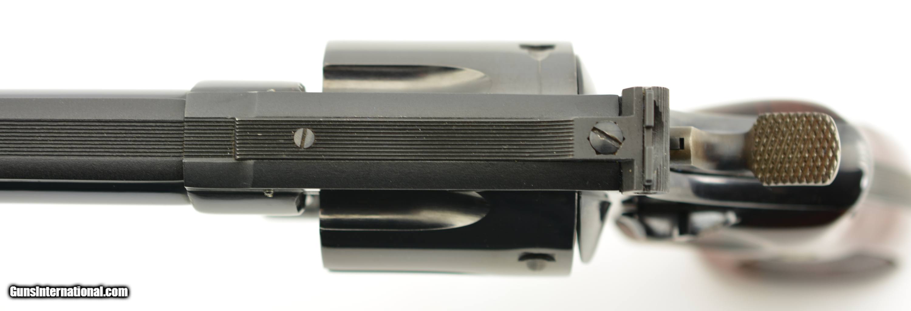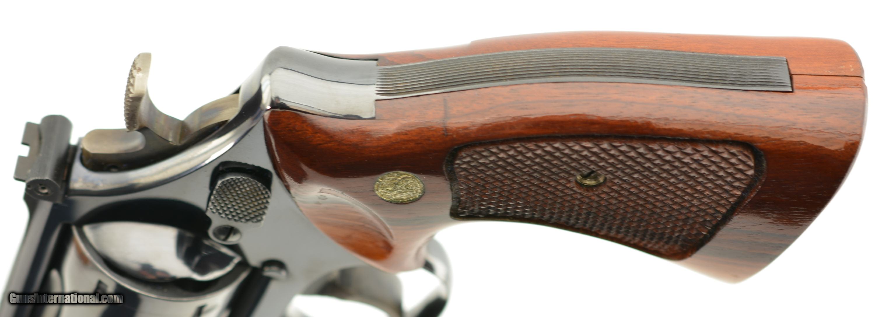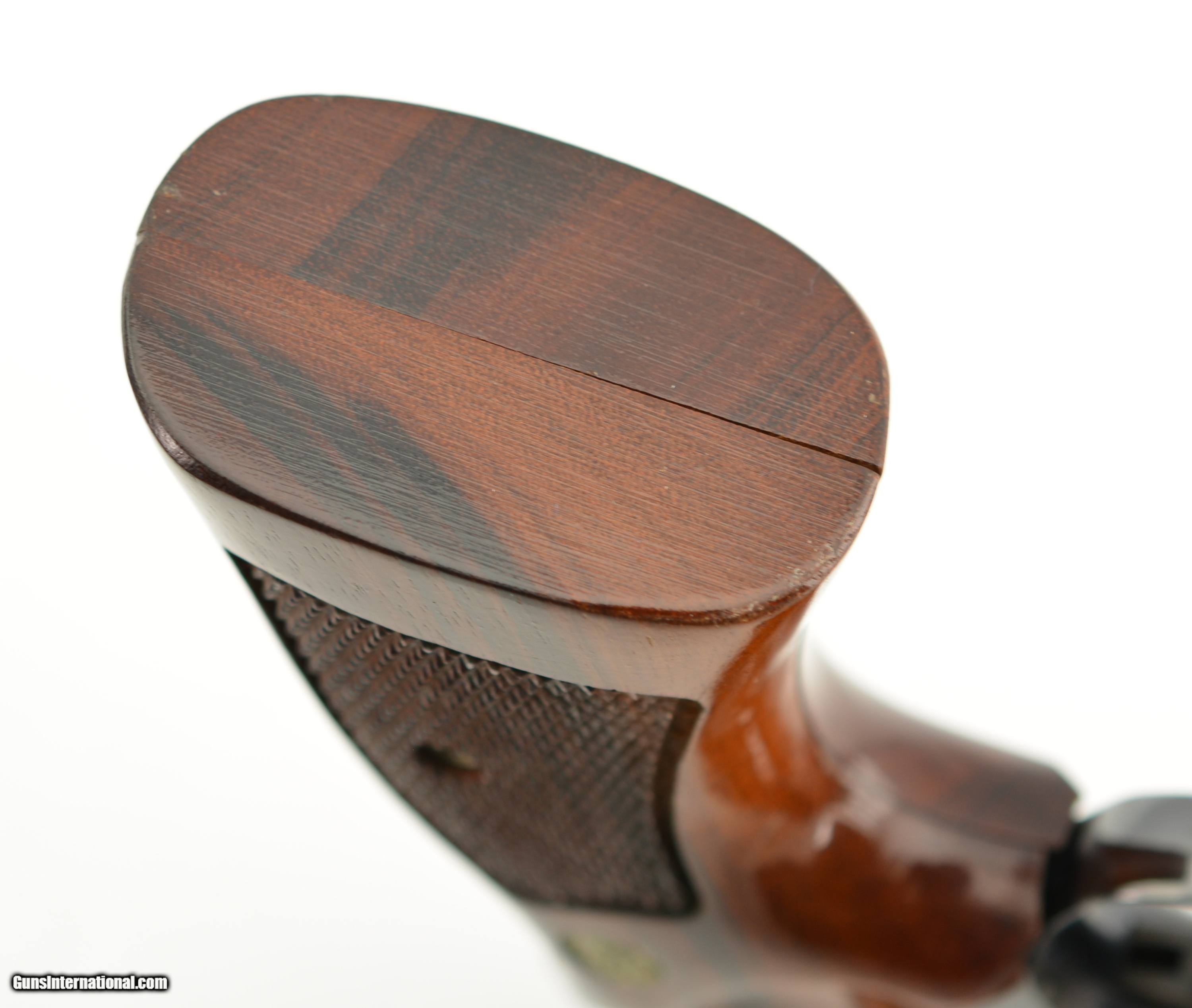 Description: Serial #S319038, .41 Magnum, 8 3/8" barrel with an excellent, bright bore. This is a ca. 1969 revolver, made between the deletion of the diamond-center grip, and the introduction of the N-prefix. The metal retains 98-99% of the original blue finish with some trace silvering at the muzzle, and a mild turn-ring on the cylinder. The target trigger and hammer retain a commensurate amount of their original color case-hardening, while the Goncalo Alves grips are in excellent condition with hardly any wear, or flattening of the points. The revolver is housed in an original S&W wooden case with cleaning rod, bore brush, bore mop, and screwdriver. The interior lining has deteriorated over time, but the revolver still rates excellent condition. FFL or C&R SOLD Curio/Relic: Yes Manufacturer: S&W Model: 57 Serial Number: S319038 Caliber Info: .41 Mag Gauge Info: .41 Mag |