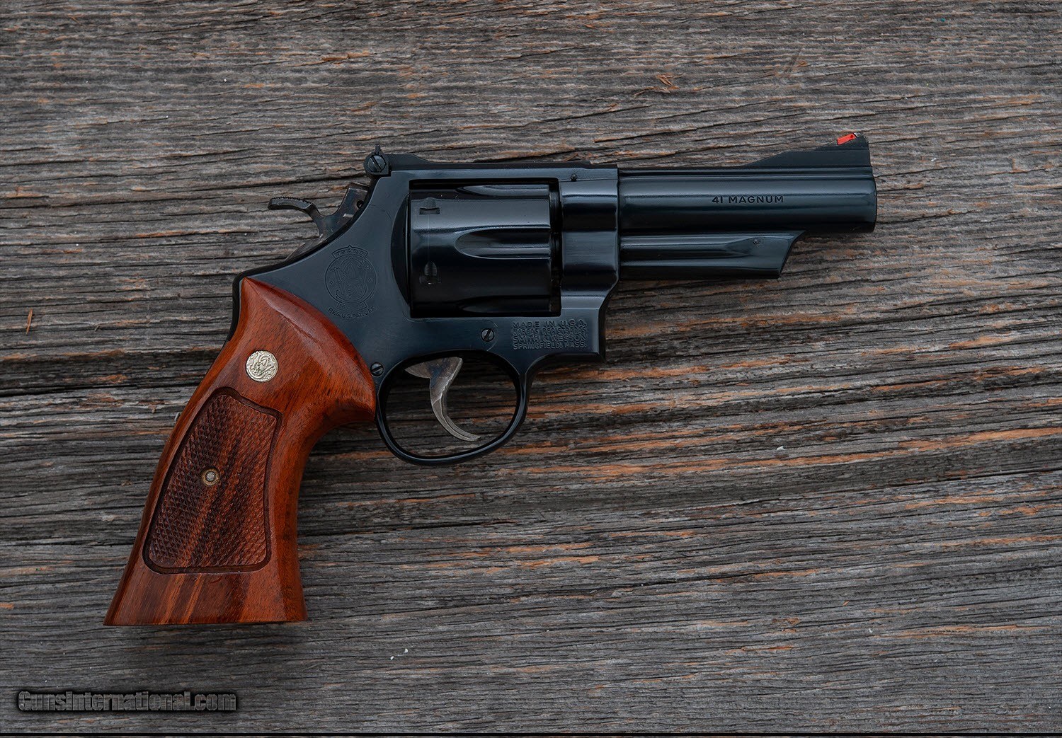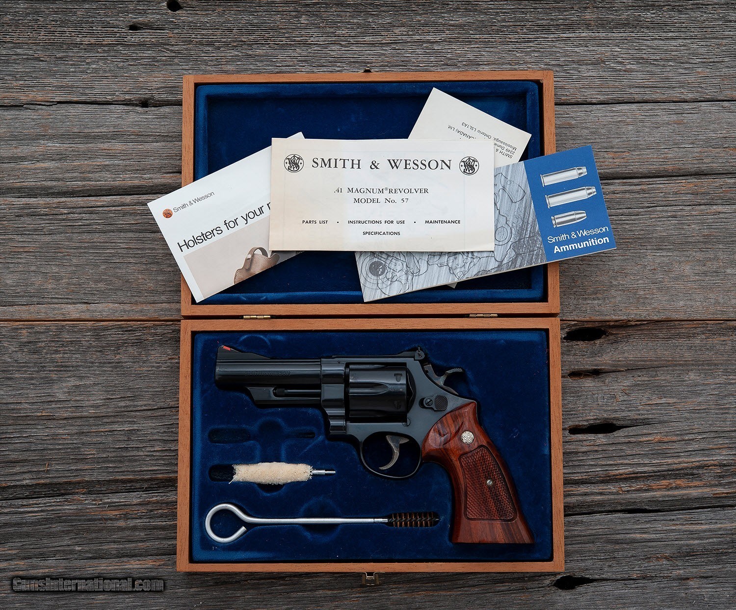 Description: Smith & Wesson - 57 - .41 Mag - Item Number: SMIN431067 Barrel length: 4 Finish: Blue Lop: NA Lbs: |/23| Ozs: 14 Overall condition: Very Good Stock condition: Very Good Metal condition: Very Good Stock:Original Metal:Original Type of Case: Maker's Wood Case Manufactured in: USA Comments: If you are looking for a Gorgeous Model 57... This Would Be The One. HG-23 SOLD |