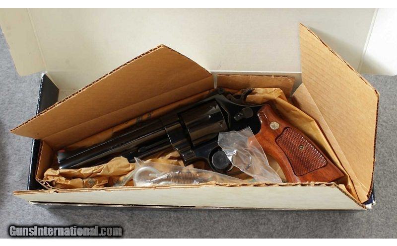 Description: In the early 1960s the .41 Remington Magnum cartridge was developed as a police round. The idea was to have round that didn't have the draw backs of the .357 which tended to over penetrate and not have the recoil of the more powerful .44 Remington Magnum cartridge. Smith & Wesson introduced the Model 57 and the combat purposed model 58 in 1964. This Smith & Wesson Model 57-1 (manufactured sometime between 1984 and 1986) looks to have been a safe queen and shows little to no use. It would be a great addition to any collection. .41 Remington Magnum SOLD Metal Condition: Excellent with a light turn line on the cylinder and a blemish on the left side above the trigger guard Wood Condition: Excellent Bore Condition: Excellent Barrels: 6 inch barrel Triggers: Target trigger with target hammer and target stocks with speed loader cutout Weight: 48 oz. Sights: Micro click adjustable rear sight with white outline and ramped front blade with red insert Item Location: Lehi, UT |