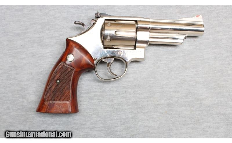 Description: Smith & Wesson Model 57 chambered in .41 Magnum. This is a large-frame, double-action revolver with a six-round cylinder. The gun won favor with civilian target shooters and hunters. It was originally designed as a weapon for law enforcement agencies. It was introduced in April 1964. The model 57 is built on the same frame as the popular model 29. This nickel–plated revolver has a 4-inch barrel, a red insert front sight with a white outline adjustable rear iron open sight, a target trigger, a target hammer, and oversized wooden target grips. .41 Remington Magnum SOLD Metal Condition: Excellent Wood Condition: Excellent Bore Condition: Bright Barrels: 4 Inches Triggers: Target Trigger Sights: Adjustable rear and red-insert front sight Item Location: La Vista, NE |
