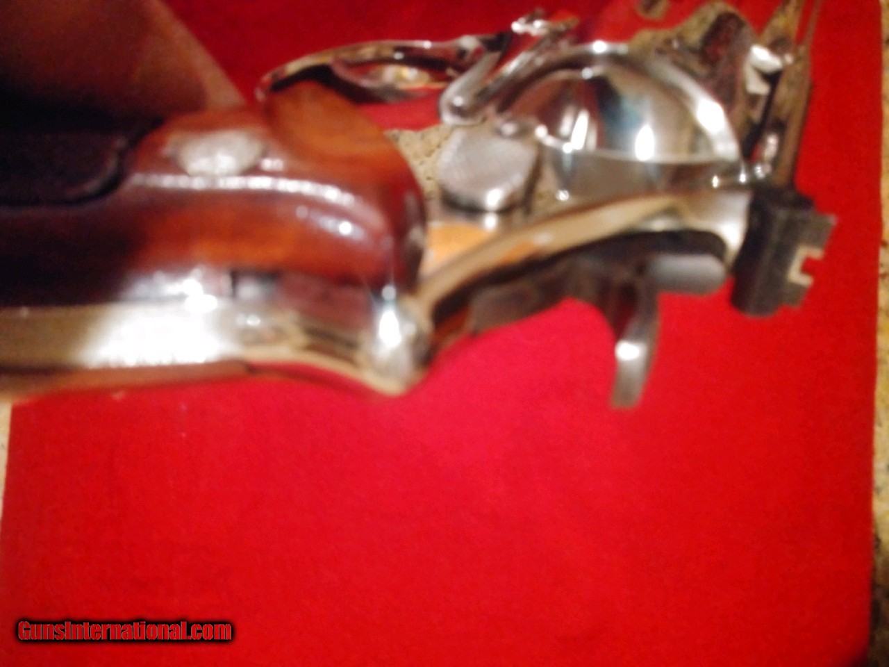 Description: Sold Sols Sold Sold. Made in 1980 this Model 57 has seen very little use at all. Simply outstanding 42 yr. old pistol. Bright shinny Nickel with zero hazing. Nice grips Bore is bright and shinny. It's a Triple "T", pinned and recessed cylinder. You can start to see a faint turn line if you put on reading glasses! I have been collecting Smith's for 20yrs now but it's time to let some go instead of pulling them out of the safe, wiping them down, telling them I love them and then putting them back. The price includes shipping in the US only. There is no box or paperwork but those items can be bought just to let you know. Look gentleman I don't take credit cards. SOLD Handgun Caliber: .41 Remington Magnum Manufacturer: Smith Wesson Model: 57 Serial Number: N787976 Barrel Length: 6 Condition: Excellent Metal Condition: Excellent Wood Condition: Excellent Bore Condition: Excellent Action: D/A Finish: Nickel Sights: Micro Adjustable Manufacture Date: 1980 |