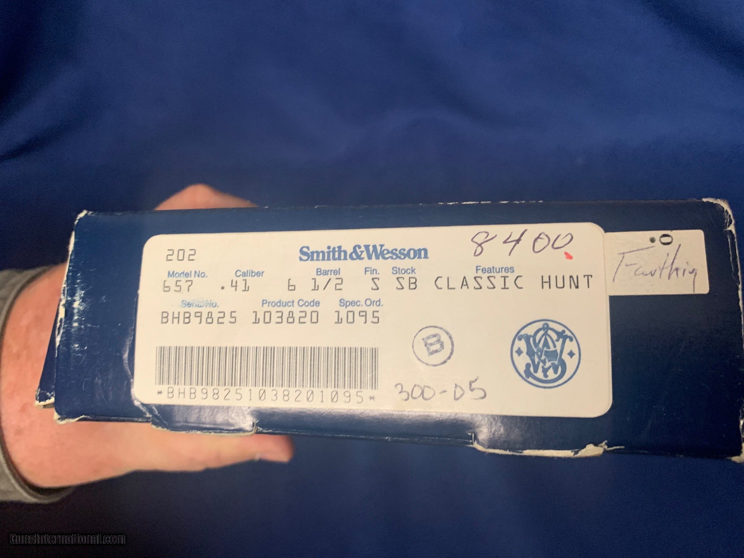 Description: Sale pending!!!!!!Smith & Wesson Model 657 41 cal. Classic Hunt 6 1/2 inch barrel As new in box 3 day inspection Shipping is $50 Priority Mail - Insurance optional Certified Checks or Money Order Ohio residents add 7.25% tax No California sales FFL required SOLD |