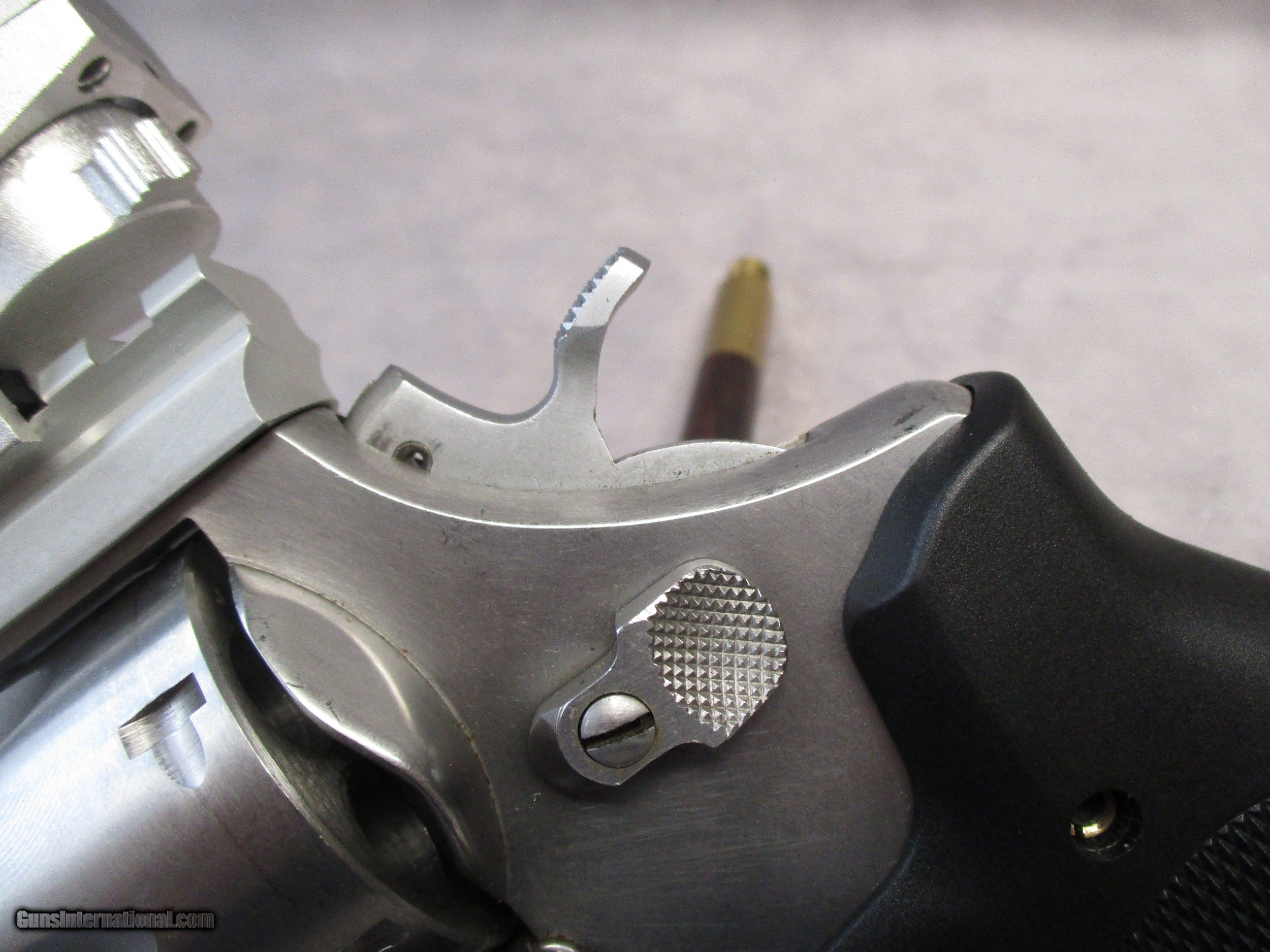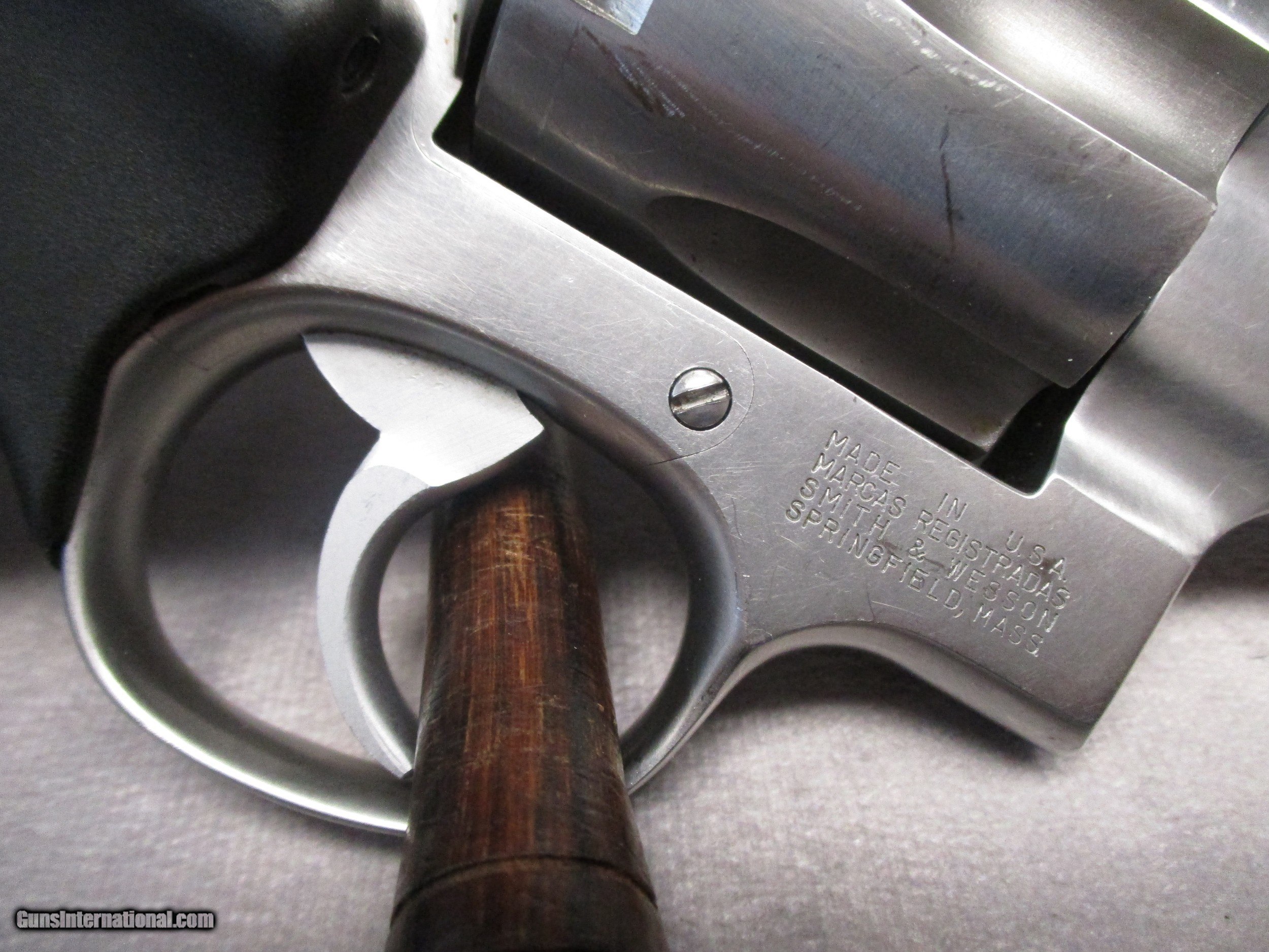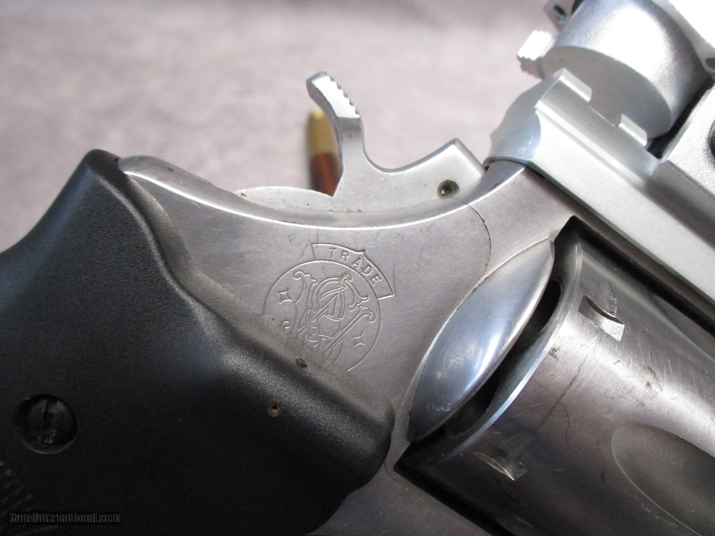 Description: This is one of Smith & Wesson’s less common models. The 657 was intended to allow the shooter to have a revolver that had far better resistance to rust and wear than the original carbon-steel Model 57, much like the 629 is to the Model 29. This is an early “No Dash” variation. According to the Standard Catalog of Smith & Wesson, 4th Edition it was made in 1986 and has the Product Code 103951. Features normally included are a 3-inch barrel, round butt, adjustable sights, .312-inch smooth combat trigger, and a .375-inch combat hammer. This one of course has been customized. The barrel has been Magna-ported. Instead of the original target stocks, this 657 comes with a set of Crimson Trace laser grips. The original rear sight has been replaced by a picatinny mount and an Nc Star red dot sight. The original is present and stored in the box. The Model 657, like the 629, has been used for everything from hunting to target shooting. It has also been used by law enforcement, although never on an “as issue” basis. This one is in good shape but has seen some use. The cylinder face has some powder burns although the bore is fairly clean. There are minor wear marks in the finish on the barrel, cylinder, and frame. None of these are deep but some can be felt with a bare fingertip. There is a nick in the cylinder over one chamber. The front face of the red dot sight’s lens is chipped on the right side when looking down the sight but it does affect sighting; please see the pictures. The box that comes with this revolver is not the original box but it is one of the modern Smith & Wesson hard cases. One noteworthy aspect of this beautiful firearm is that, unlike later S&W models, this one has no trigger lock. This is a desirable feature of the older S&W revolvers and the expression “pre-lock” is a common denotation of this feature. SOLD Handgun Caliber: .41 Special, .41 Remington Magnum Manufacturer: Smith & Wesson Model: 657 Serial Number: ANE5111 Bore: Rifled Chambers: 6 Ejectors: Manual, simultaneous 6-round ejection Barrel Type: Magna-Ported Action: Double/Single Action Triggers: 0.3125 inches (7.94 mm), smooth Stock: Crimson Trace Laser Grips Finish: Satin stainless Sights: Nc Star Red Dot Manufacture Date: 1986 Case: S&W box |
