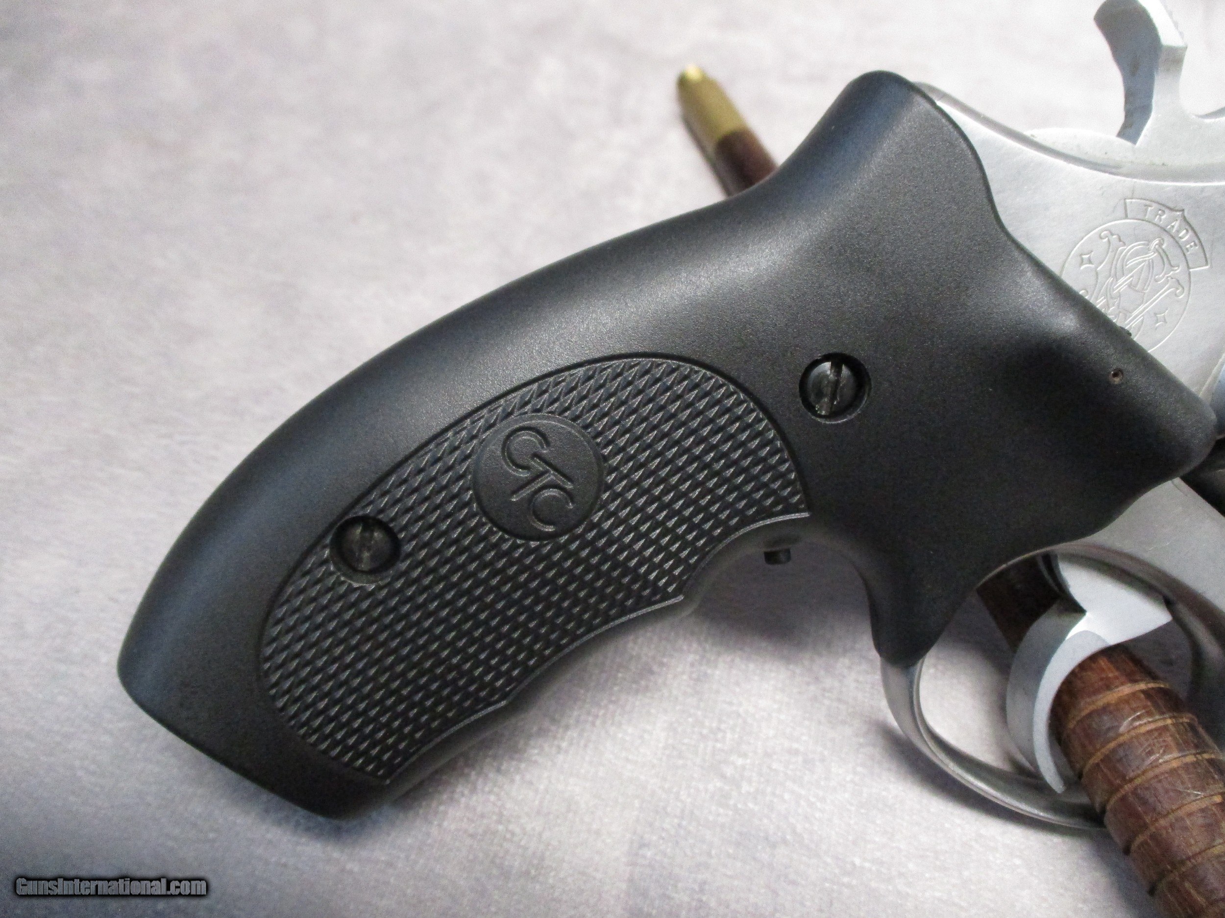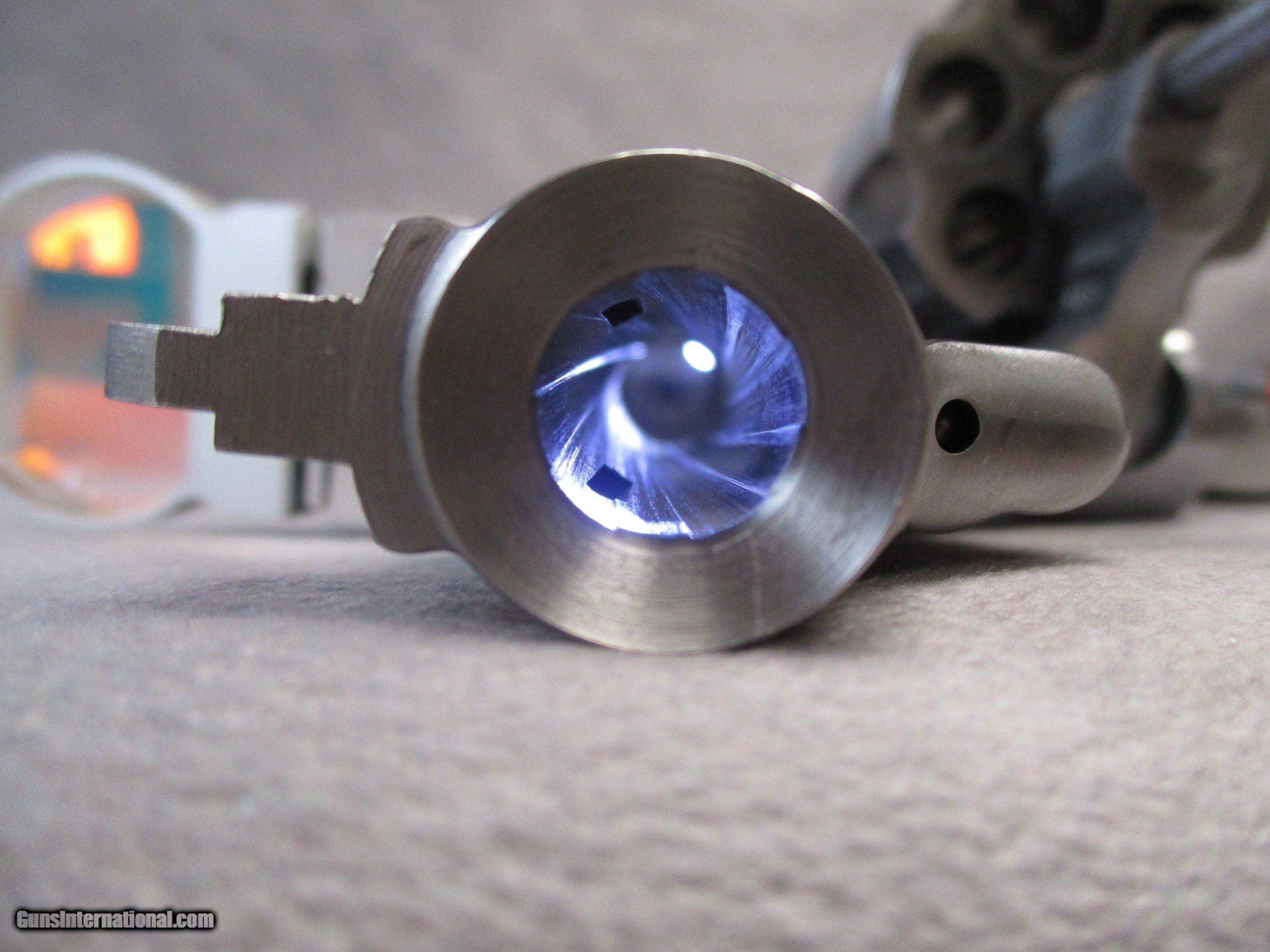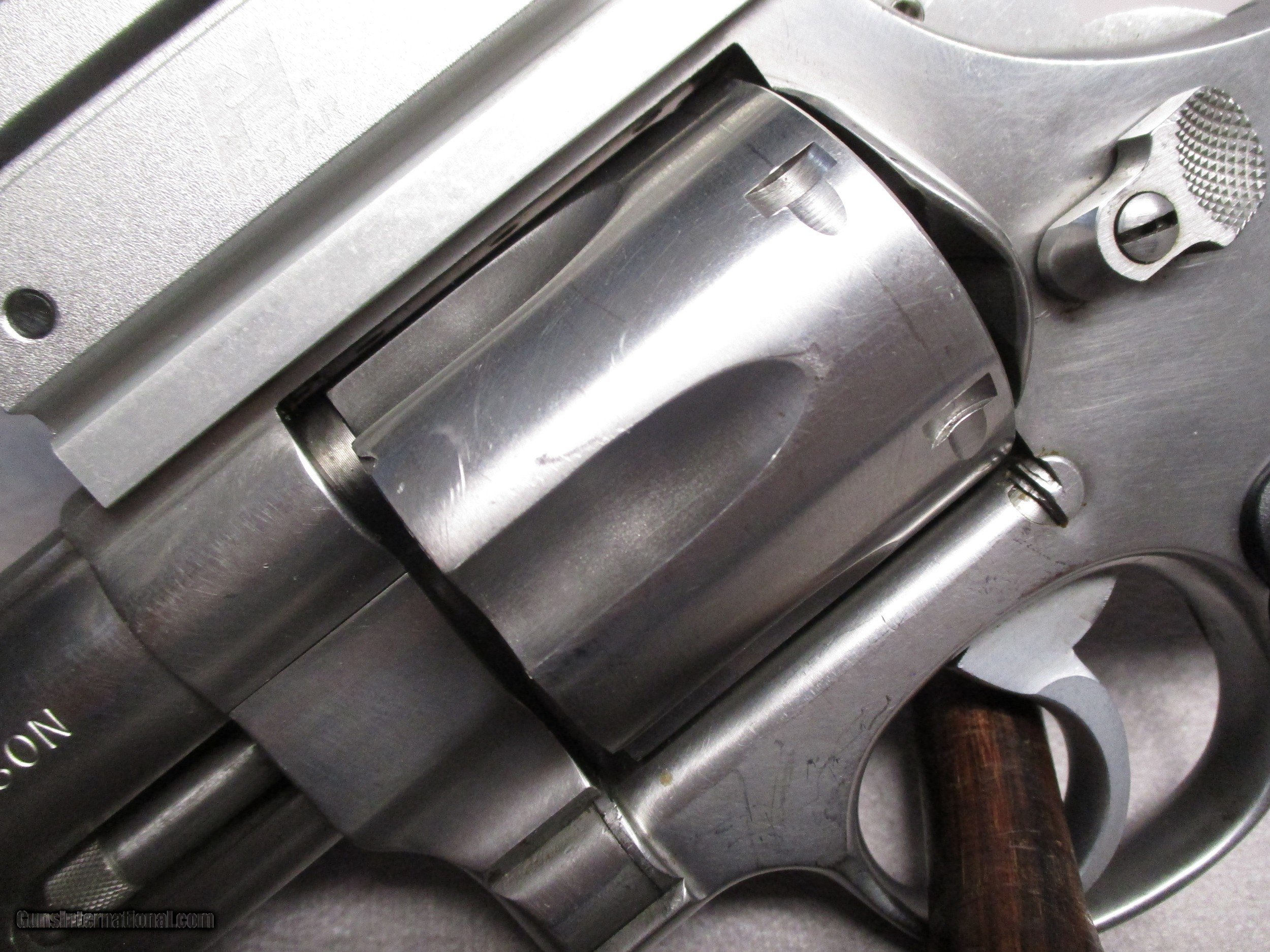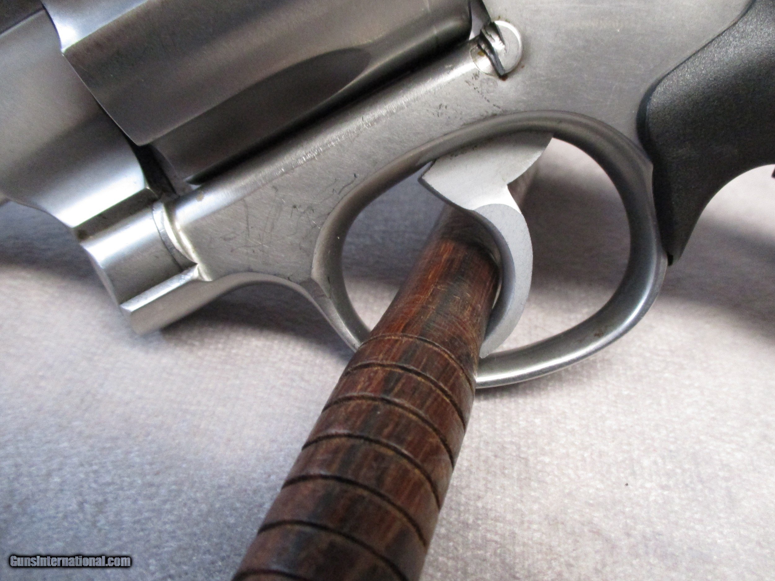 Description: This is one of Smith & Wesson’s less common models. The 657 was intended to allow the shooter to have a revolver that had far better resistance to rust and wear than the original carbon-steel Model 57, much like the 629 is to the Model 29. This is an early “No Dash” variation. According to the Standard Catalog of Smith & Wesson, 4th Edition it was made in 1986 and has the Product Code 103951. Features normally included are a 3-inch barrel, round butt, adjustable sights, .312-inch smooth combat trigger, and a .375-inch combat hammer. This one of course has been customized. The barrel has been Magna-ported. Instead of the original target stocks, this 657 comes with a set of Crimson Trace laser grips. The original rear sight has been replaced by a picatinny mount and an Nc Star red dot sight. The original is present and stored in the box. The Model 657, like the 629, has been used for everything from hunting to target shooting. It has also been used by law enforcement, although never on an “as issue” basis. This one is in good shape but has seen some use. The cylinder face has some powder burns although the bore is fairly clean. There are minor wear marks in the finish on the barrel, cylinder, and frame. None of these are deep but some can be felt with a bare fingertip. There is a nick in the cylinder over one chamber. The front face of the red dot sight’s lens is chipped on the right side when looking down the sight but it does affect sighting; please see the pictures. The box that comes with this revolver is not the original box but it is one of the modern Smith & Wesson hard cases. One noteworthy aspect of this beautiful firearm is that, unlike later S&W models, this one has no trigger lock. This is a desirable feature of the older S&W revolvers and the expression “pre-lock” is a common denotation of this feature. SOLD Handgun Caliber: .41 Special, .41 Remington Magnum Manufacturer: Smith & Wesson Model: 657 Serial Number: ANE5111 Bore: Rifled Chambers: 6 Ejectors: Manual, simultaneous 6-round ejection Barrel Type: Magna-Ported Action: Double/Single Action Triggers: 0.3125 inches (7.94 mm), smooth Stock: Crimson Trace Laser Grips Finish: Satin stainless Sights: Nc Star Red Dot Manufacture Date: 1986 Case: S&W box |