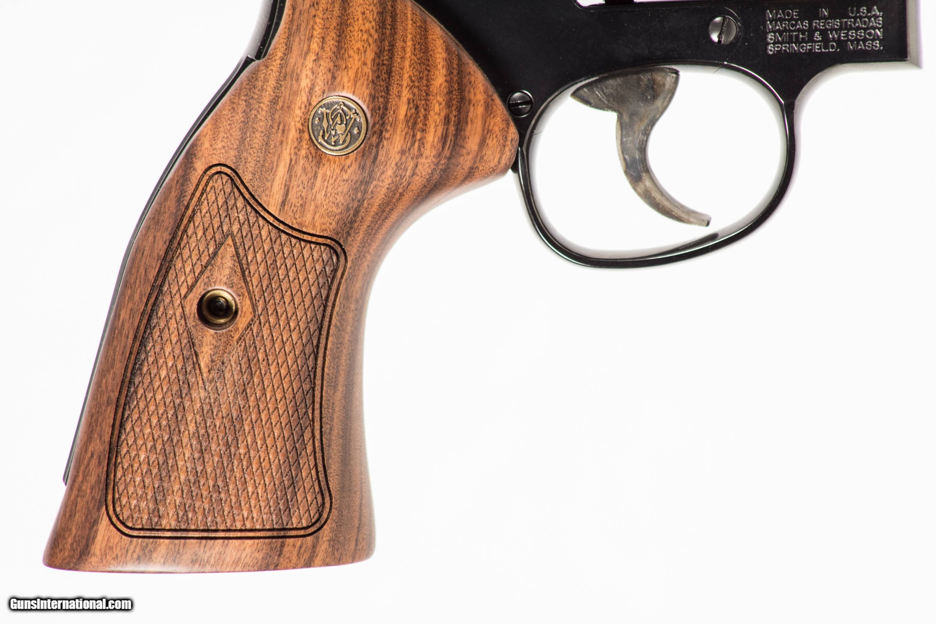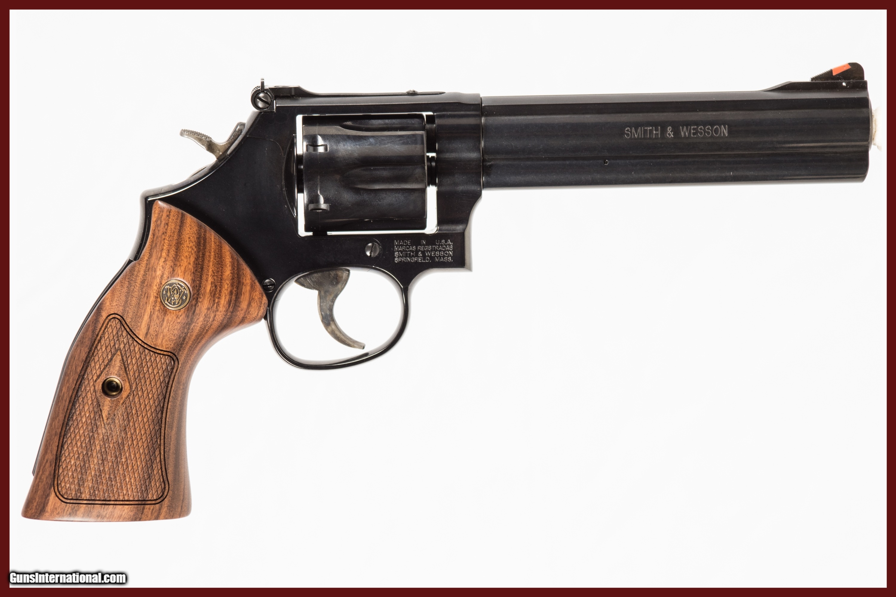 Smith & Wesson 586-8 chambered for 357 Magnum with a 6 inch barrel bright & shiny bore checkered wood grips and an adjustable rear sight. This firearm is in excellent condition and is covered by Dury's Lifetime Warranty.