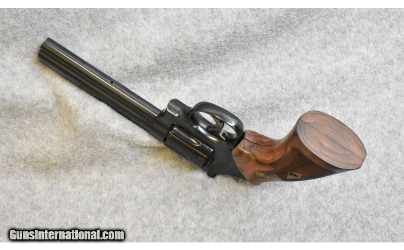 Description: SOLD Caliber Info: .357 Magnum Metal Condition: excellent condition, very slight wear ring on the cylinder Wood Condition: excellent condition Bore Condition: bright and sharp Barrels: 6 inch Triggers: single, smooth narrow trigger, narrow hammer Stock: checkered wood grips with S&W medalions Weight: 3 lbs Sights: fixed front blade with orange insert, adjustable white outline U notch rear Extras: comes with the factory blue plastic hard case Item Location: Kansas City, KS |