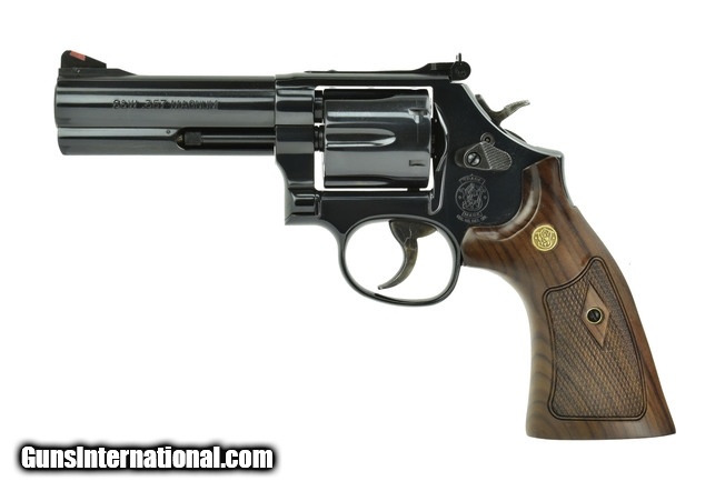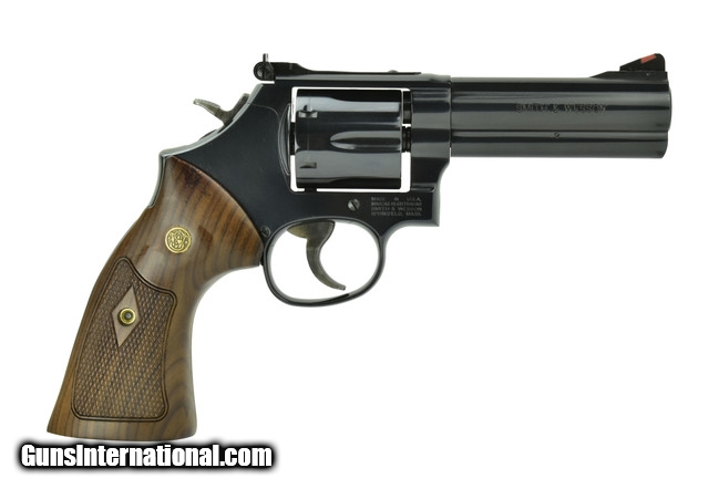 Description: Smith & Wesson 586-8 .357 Magnum caliber revolver. 4” Model with deluxe wood grips and blued finish. New.
