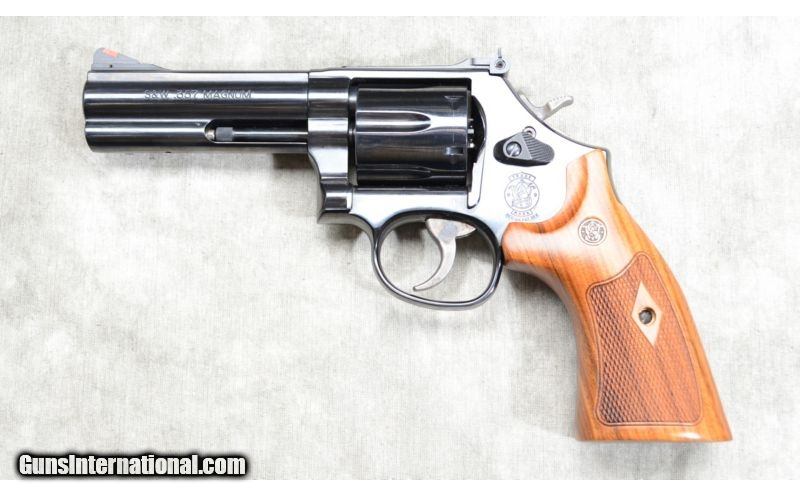 Description: This everyday carry pistol features serrated ramp front sight with red insert, adjustable white outline rear sight, checkered walnut grips, four inch blue barrel and comes with the factory case. SOLD Caliber Info: .357 Remington Magnum. Chambers: 6 shot single/double action revolver. Metal Condition: Excellent. Very light turn line. Little evidence of firing. Wood Condition: Excellent. Bore Condition: Shiny and bright with little to no signs of use. Barrels: 4 inch, blue, with sights. Triggers: Factory single action and double action trigger. Stock: Checkered walnut grips with very rounded edges. Weight: 41 oz. Sights: Serrated ramp with red insert and adjustable notch. Extras: Case. Item Location: Rogers,, MN |