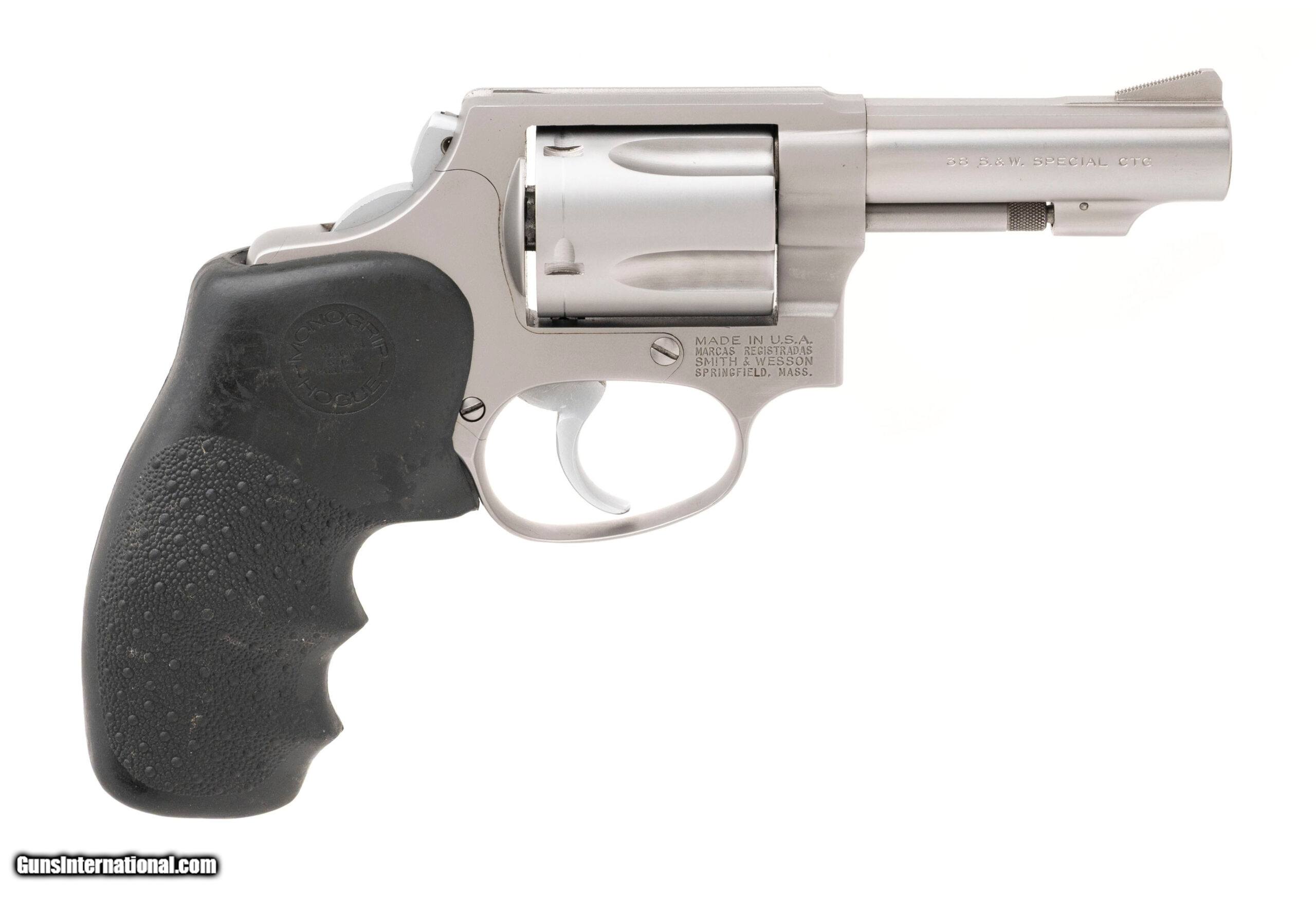 Description: "SN: BDW5914. 1980s vintage, .38 S&W Special with an 3"" barrel. Bore is bright with strong rifling. Rare stainless steel j-frame revolver with a bobbed hammer and Hogue grips. Very good condition with box, papers, and tools. SOLD |
