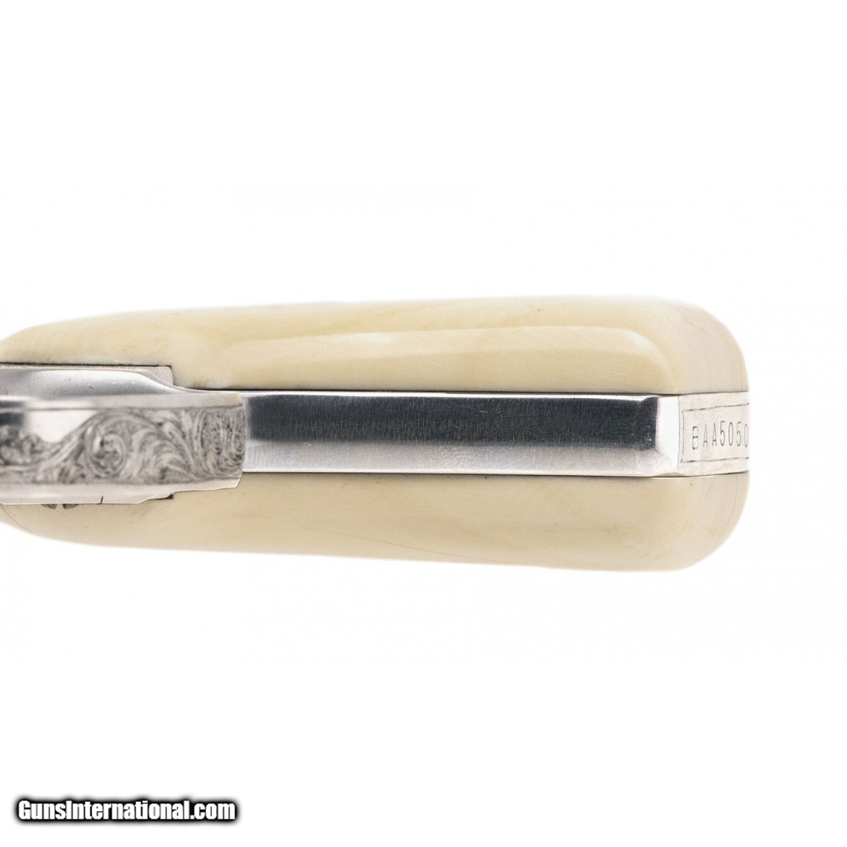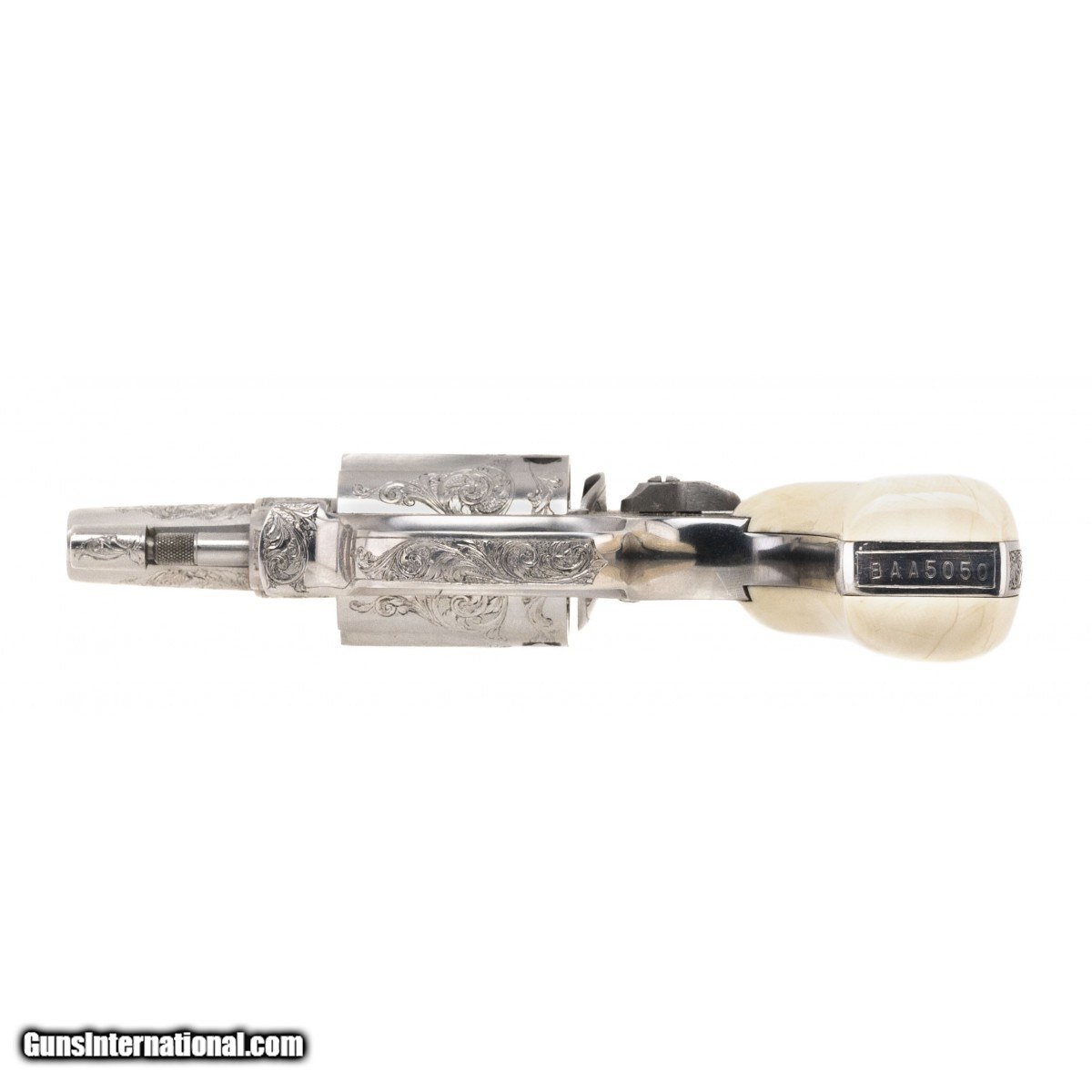 Stainless steel snubnose revolver engraved by Italian master engraver Paolo Barbetti in a fine foliate scroll. The grips are genuine ivory. A beautiful piece in excellent condition.