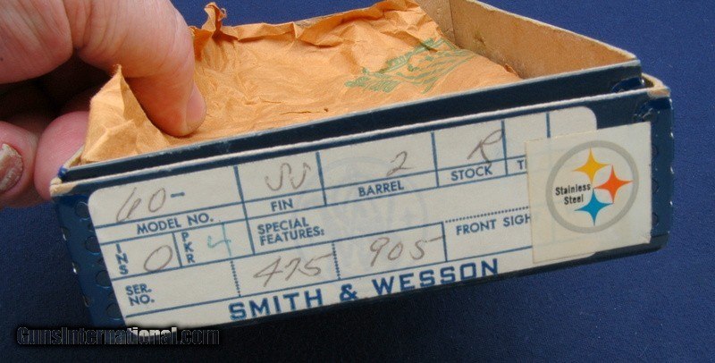 Description: Collector grade, impossible to upgrade this gun. It's just new. 1965 Production Model 60 no dash with diamond grips. Right grip is numbered to the gun. Original numbered box. Manual and unused warranty card in the box. Cleaning kit not there, but very easy to find. Turn line virtually non existent. Box is excellent as well. $40 shipping to the lower 48, 3% surcharge for using a CC. If you choose to pay with a personal check, we will hold the item for up to 10 days to make sure that it clears. Please expedite such pymts as we will hold an item on your word for 5 days. SOLD Handgun Caliber: .38 Special |