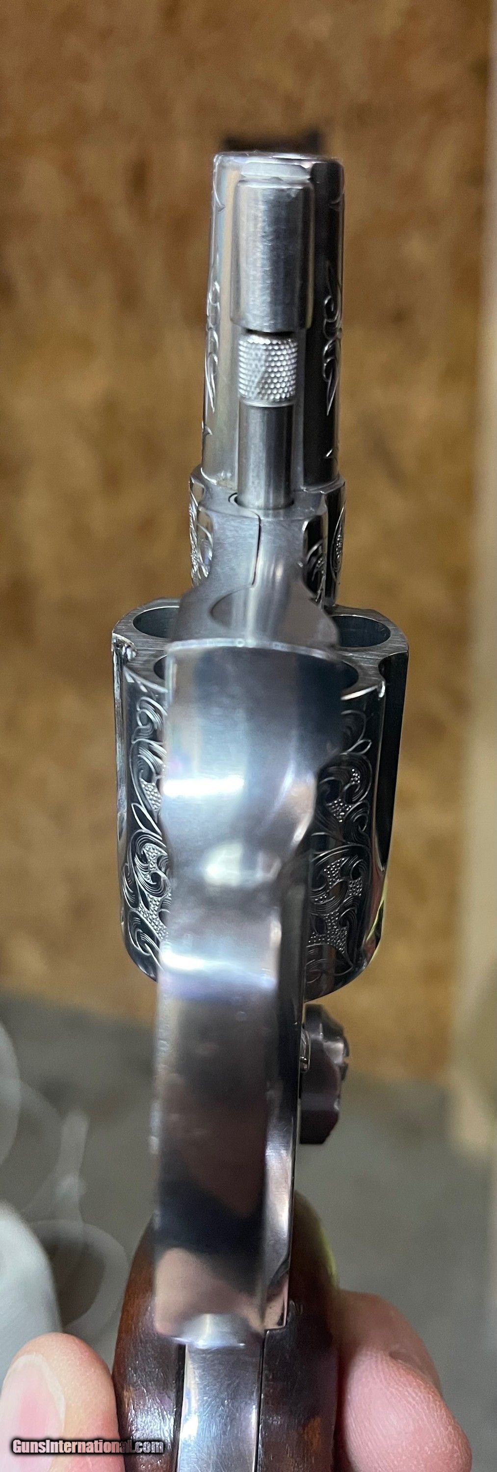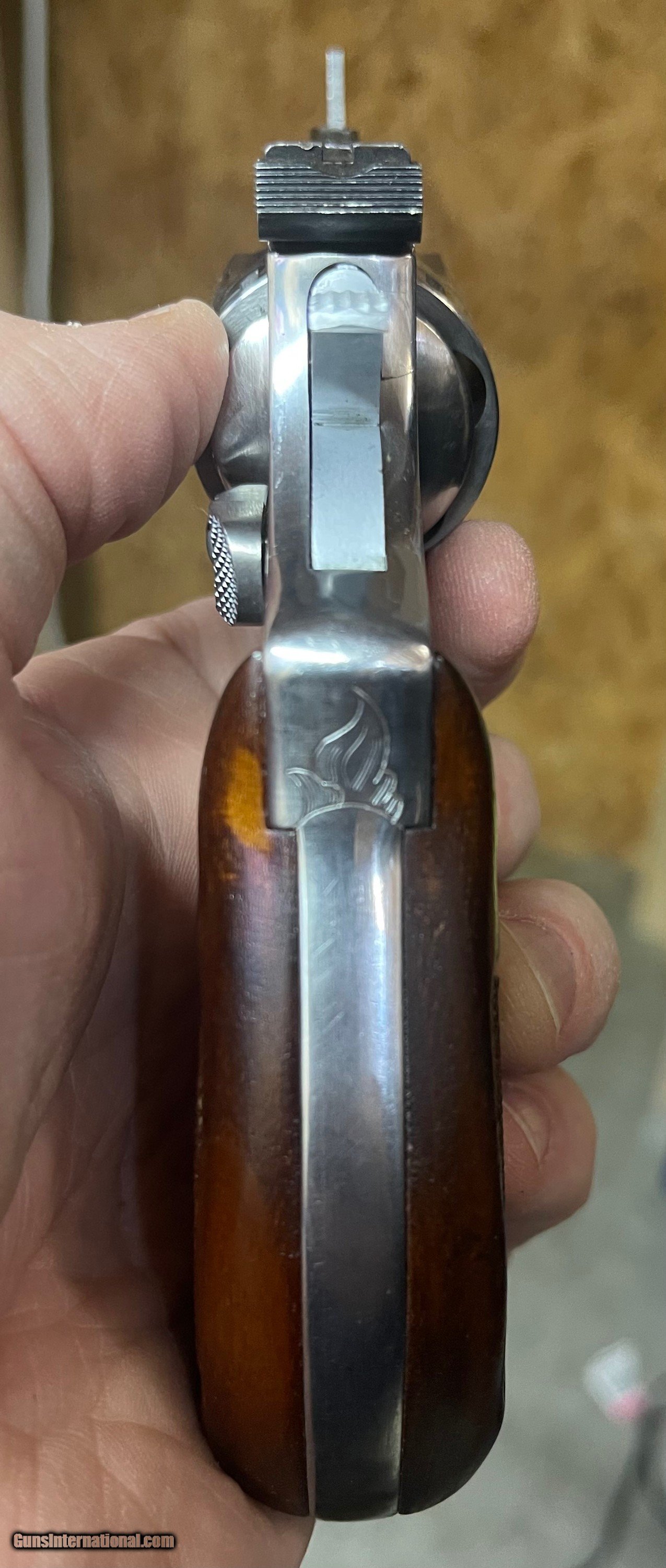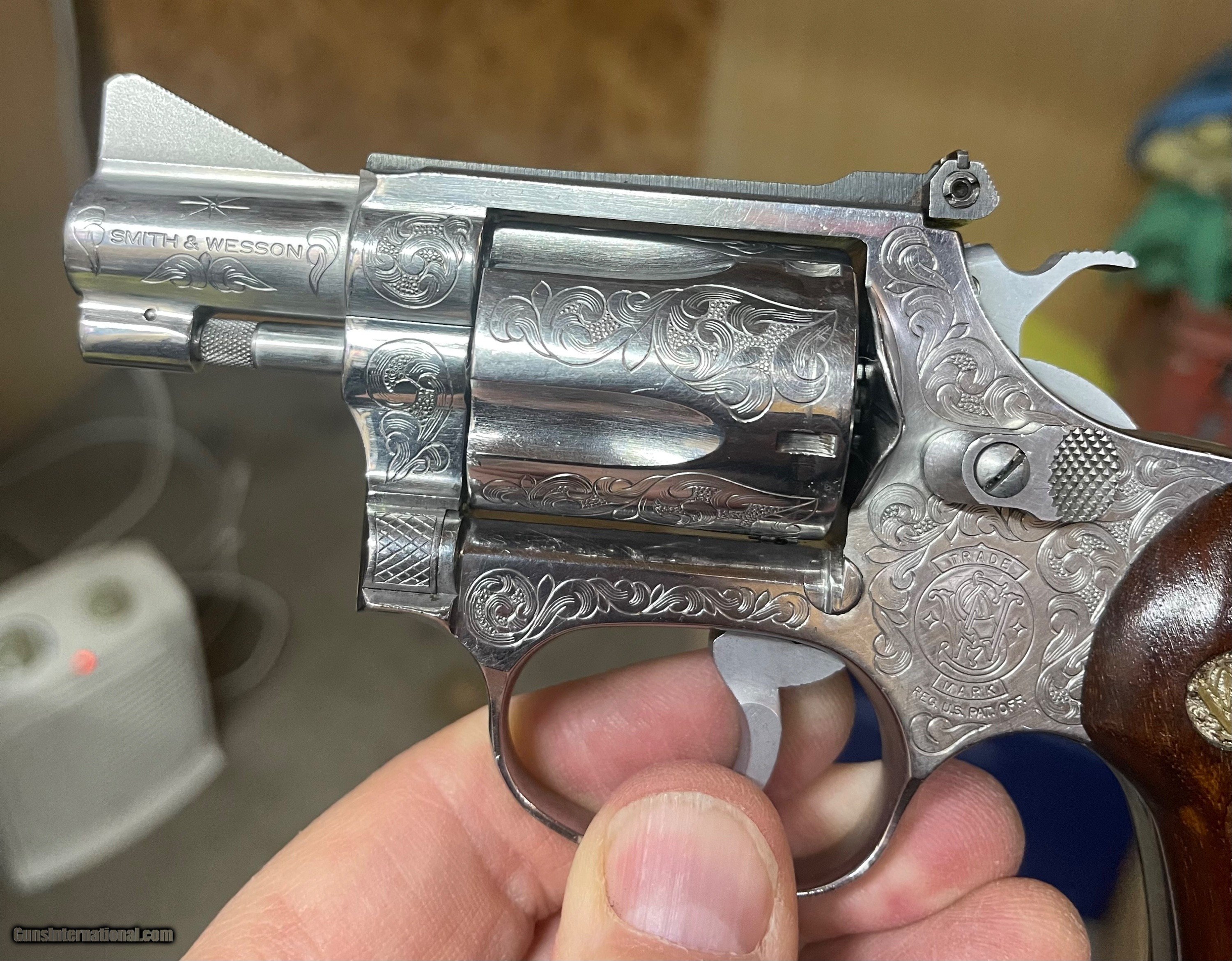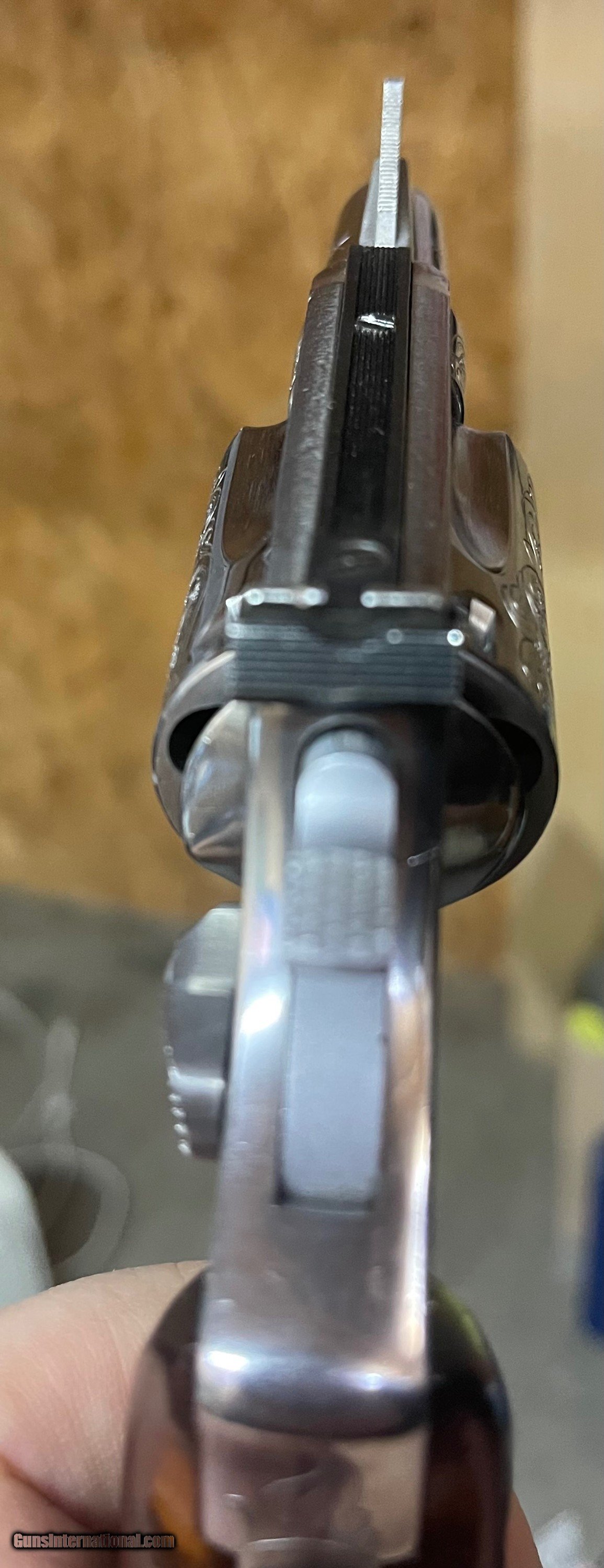 Description: Another incredible engraved model 60, and this one is a target model! Rare being a target, even more so with factory engraving. I estimate the engraving at 50-60%. Adjustable target sights, 1 7/8ths inch barrel, and wood round butt grips. Non original one piece box. One minor scrape on the trigger guard (see pics). Please email with questions. Shipping and insurance included. Cards add 3% SOLD Manufacturer: Smith and Wesson Model: 60-1 Barrel Length: 1 7/8ths Condition: Used Metal Condition: Excellent Wood Condition: Excellent Bore Condition: Excellent Finish: Stainless Sights: Target Engraving: Yes Item Location: 37075 |