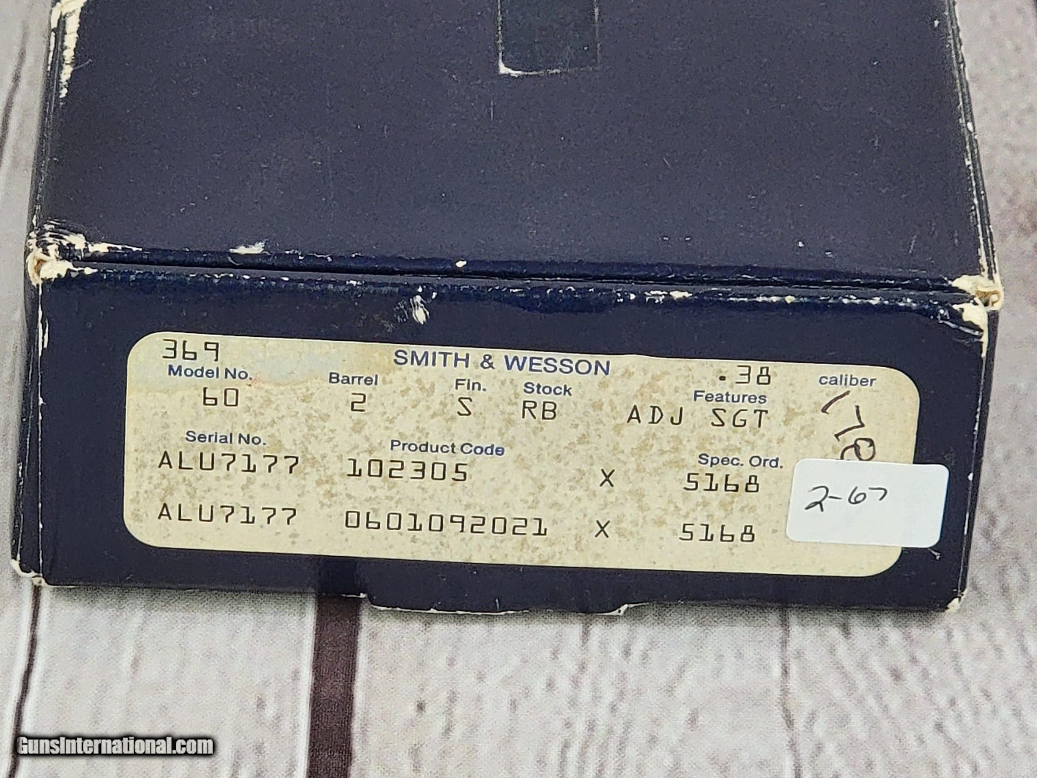 Description: Guns Listing ID: 531129 Smith & Wesson Rare \"Ashland\" Model 60-1 Chief‚‚s Special 1 of only 660 1985 Smith & Wesson Model 60-1 5-shot 38 Special Chief’s Special “Ashland” Series Revolver. One of only 660 produced. This is one of the ultra rare “Ashland” series guns that feature a tall \"Shark‚‚s Fin\" front sight and fully adjustable rear sight. The “Ashland” guns were a limited production run made in 1985 for the Ashland Shooters Supply Co. The unique front and rear sights distinguish this series from regular production Model 60s. This particular example is absolutely beautiful and would rate 99% if not for several light scratches on the non-medallion side of the frame (see photos for close-ups of that area). Although introduced over 50 years ago, the Model 60 is still one of the most popular self-defense firearms ever made and this is one of the rarest of those produced. Comes complete in original factory box and includes manual and all other factory paperwork. Brand: Smith & Wesson Model: 60-1 \"Ashland\" series Chief‚‚s Special Caliber: .38 Special Barrel: 2\" Capacity: 5 Shot Sights: High \"Shark‚‚s Fin\" front sight, adjustable rear sight Grip: Checkered Walnut Serial Number: ALU SOLD Manufacturer: SMITH & WESSON Model: 60-1 Ashland Shooting Supply Caliber Info: 38 SPECIAL Condition: Used - Non-Certified Barrels: 2 BARREL Finish: STAINLESS |