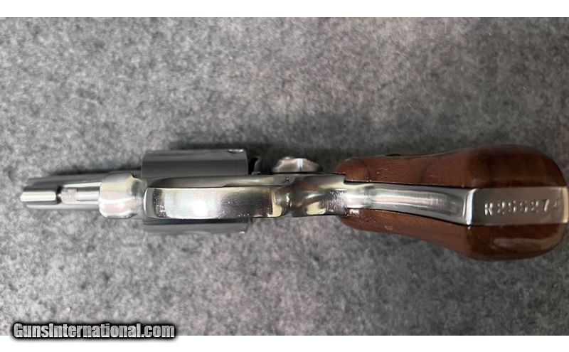 Description: This SA/DA stainless steel revolver is a Smith & Wesson Chiefs Special Model 60 chambered in .38 S&W Special (1979 - 1980). It has a fixed, 1/10-inch serrated ramp front sight, integral groove square notch rear sight, checkered hammer, serrated trigger, and round butt. The stainless steel finish is in very good condition with only light observable handling wear to the frame proper. The checkered S&W emblem walnut banana grips are in very fine condition, and showing much of the original high gloss finish. The bore is bright and shiny with excellent rifling. This revolver comes with the original box (including original sales receipt), oil paper, cleaning brush, stubby screwdriver, Instructions for Use manual, and a host of other paperwork. (See photo) .38 S&W Special SOLD Chambers: 5 round cylinder Metal Condition: Stainless steel finish is in very good condition with only light observable handling wear to the frame proper. Wood Condition: "The checkered S&W emblem walnut banana grips are in very fine condition, and showing much of the original high gloss finish. Bore Condition: Bright and shiny with excellent rifling Barrels: 2 inch barrel Triggers: SA/DA Serrated trigger Stock Dimensions: 6 inches overall length Butt Pad: S&W emblem checkered banana wood grips Weight: 1 lb 4 oz Sights: "Fixed serrated ramp front sight, integrated groove notch rear sight Item Location: Wichita, KS |