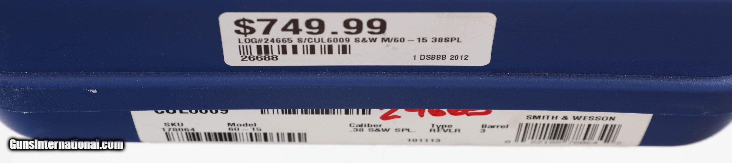SOLD Handgun Caliber: .38 Special Manufacturer: SMITH & WESSON Model: 60-15 Serial Number: CUL60?? Barrel Length: 3 Condition: EXCELLENT |