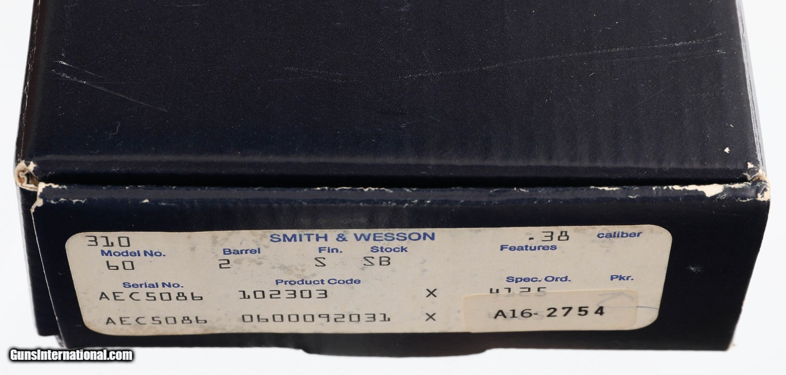 SOLD Handgun Caliber: .38 Special Manufacturer: SMITH & WESSON Model: 60 Serial Number: AEC50?? Barrel Length: 1 7/8 Condition: EXCELLENT |