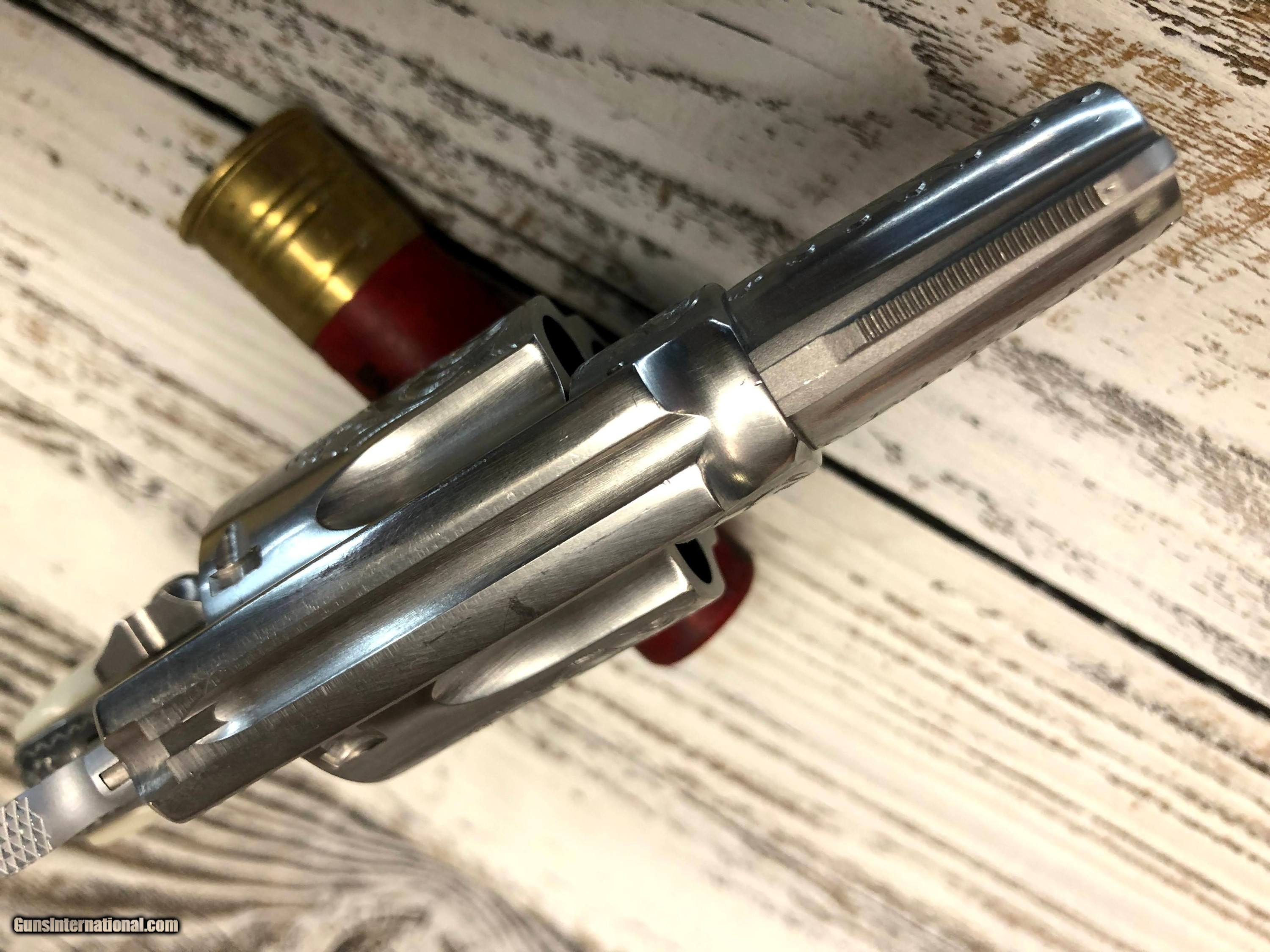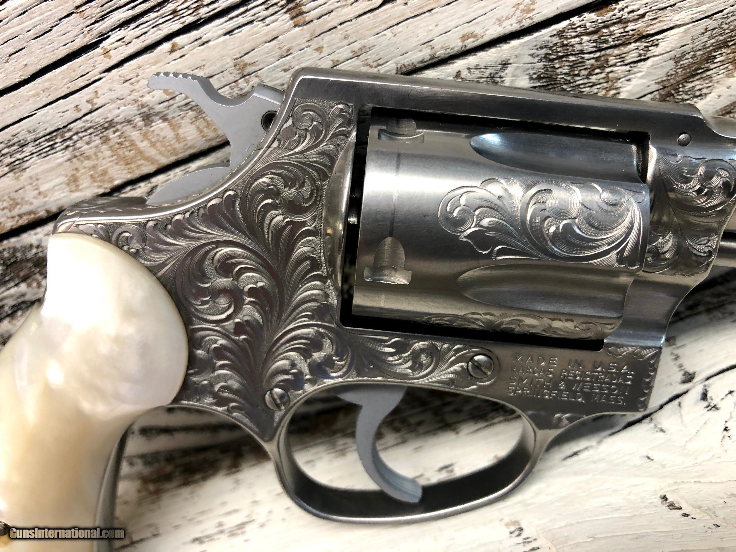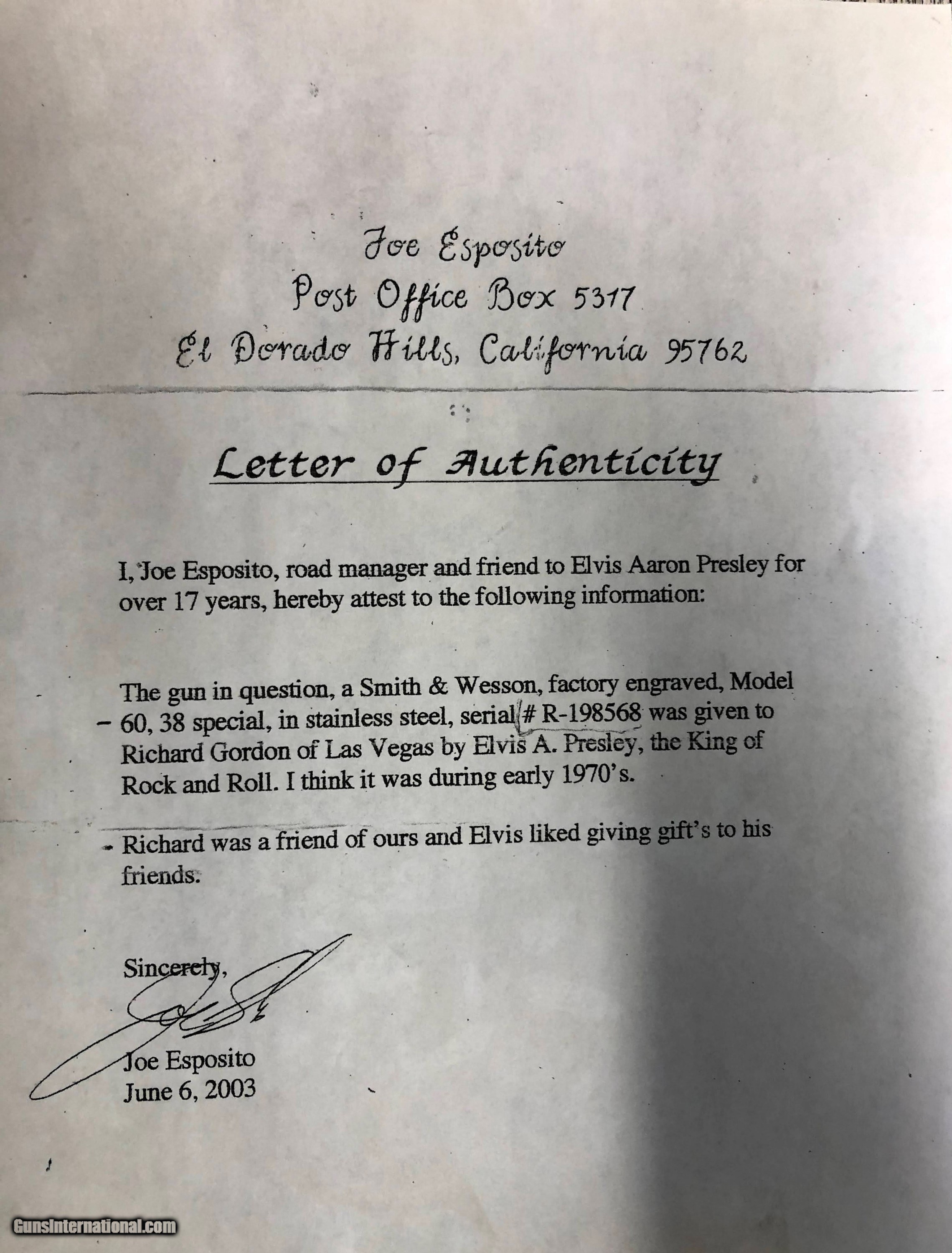 Description: As New condition Smith & Wesson Model 60 in .38 Special which is Factory Engraved and was given as a gift by The King to a friend. Elvis Presley owned this gun and then gifted this gun to his friend Richard Gordon and is attested by his road manager Joe Esposito in the letter in the pictures. Please feel free to call for more details and paperwork,this is a genuine story Gun. Gun is stainless with genuine Mother of Pearl grips. SOLD Handgun Caliber: .38 Special Manufacturer: Smith & Wesson Model: 60 Condition: as new Metal Condition: as new Bore Condition: As New Stock: Mother of Pearl Engraving: factory |