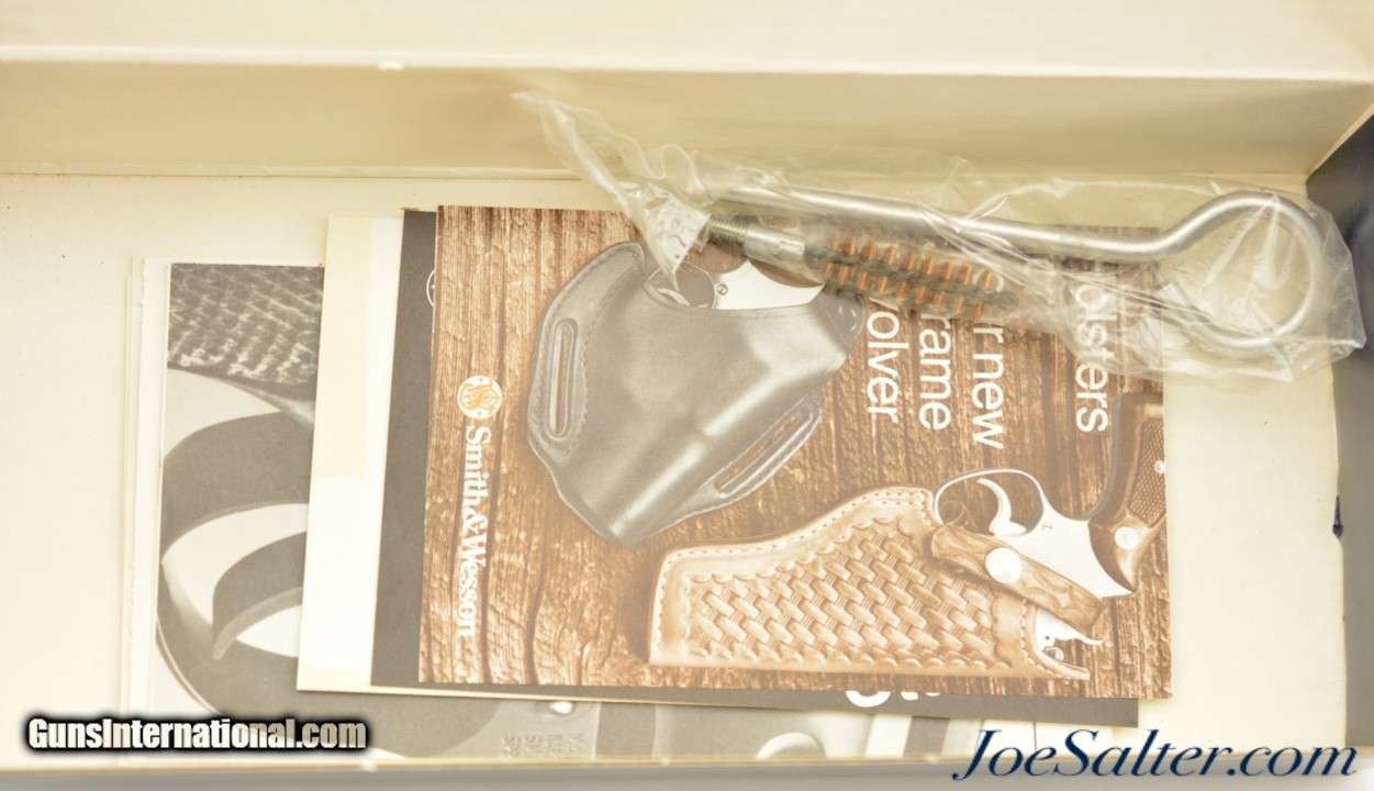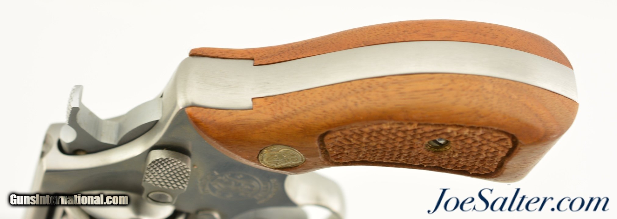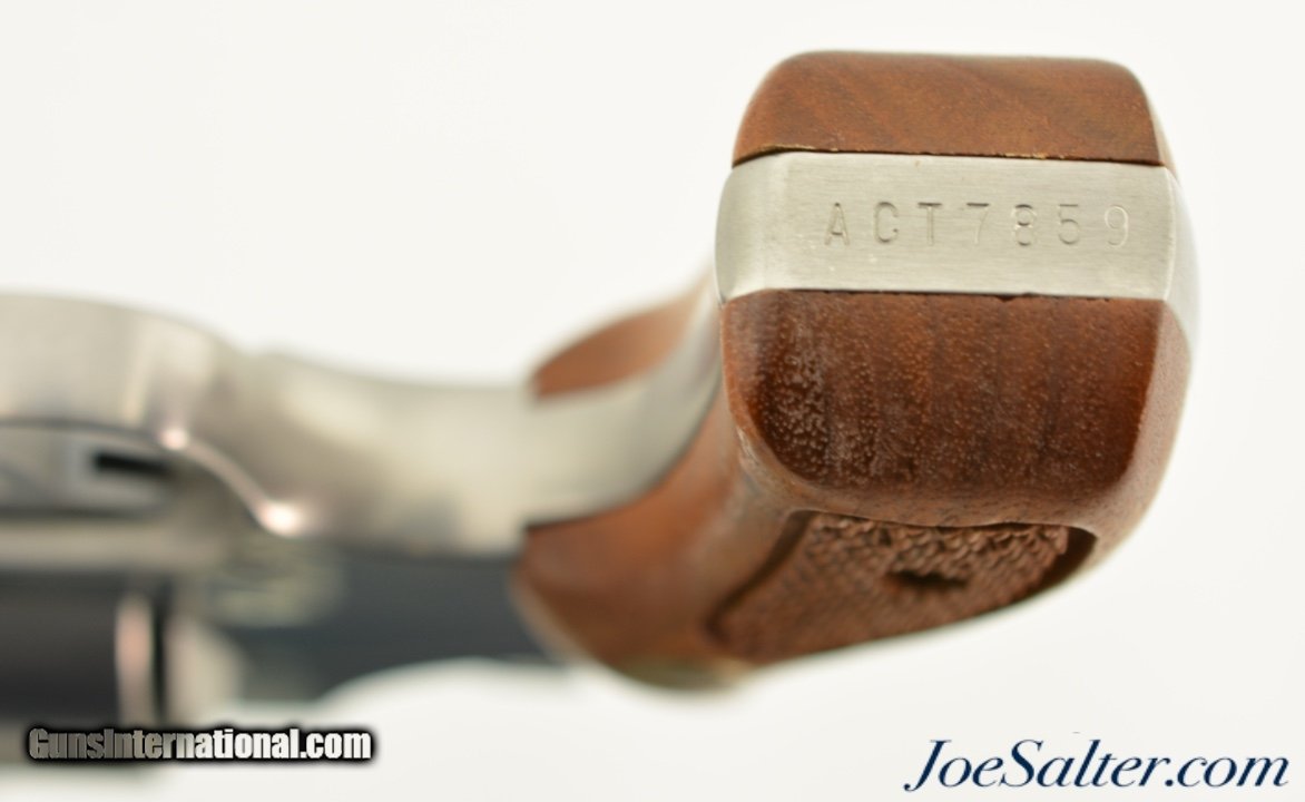 Description: Serial #ACT7859, .38 Special, 1 7/8 inch barrel with a bright, excellent bore. This is the Smith & Wesson model 60 Chiefs Special revolver. In excellent condition the revolver is like new in the original box. The stainless steel surfaces rate excellent with 99% plus of the original finish remaining and showing only light handling marks. The smooth combat trigger and service hammer retain full hard chrome finish. The checkered walnut factory round butt Magna grips with silver S&W medallions rate excellent. The functioning of this fine J-frame revolver is excellent with correct timing and lockup. It comes in the original factory box that is correctly end labeled and numbered to the gun, cleaning kit, manual and paperwork. The Chiefs Specials were well regarded by law enforcement and civilians alike. An excellent Chiefs Special! SOLD |