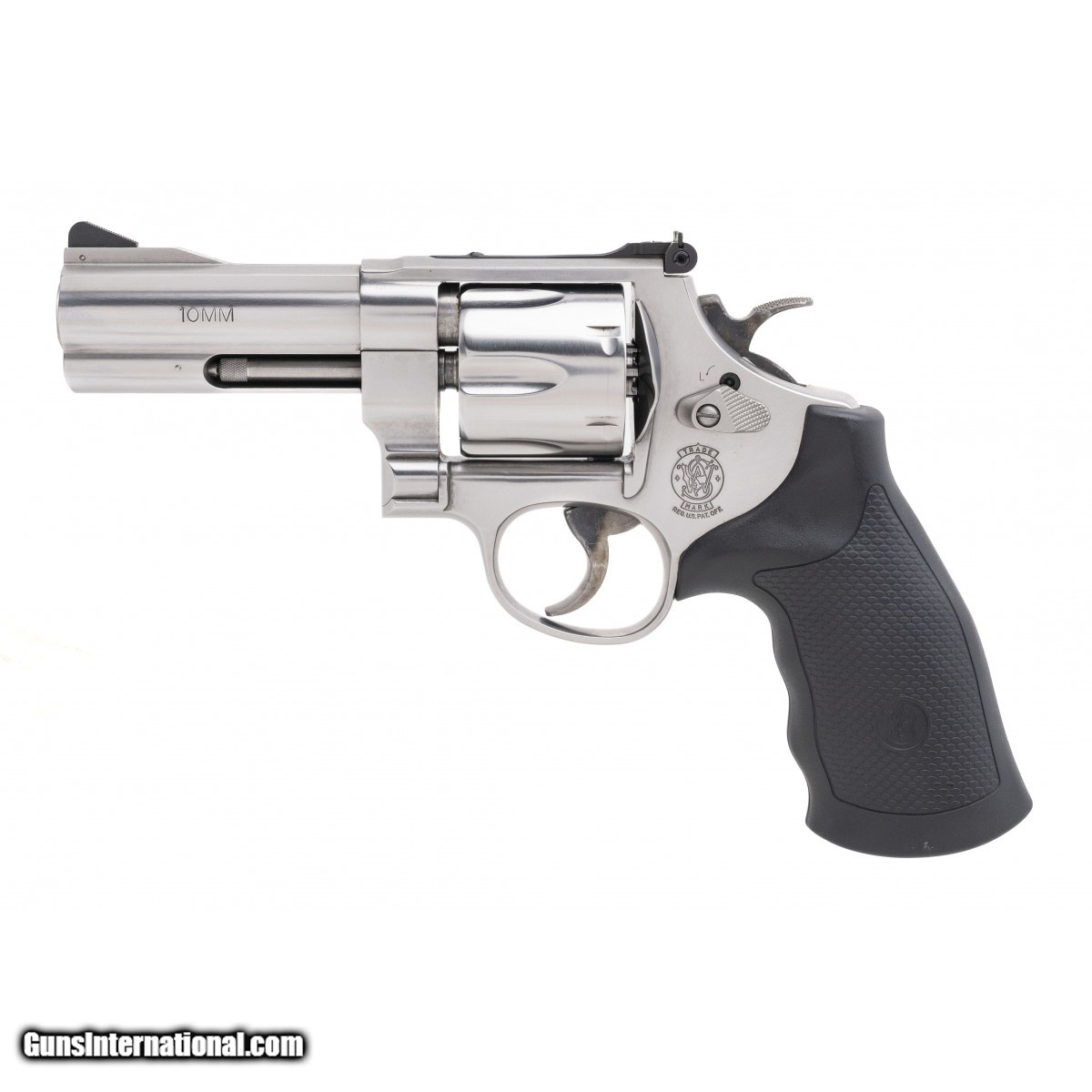SN: DMY4519. Current production 10mm with a 4"" barrel. Stainless steel revolver made to use moon clips. Has been polished bright and looks great. Excellent condition with box.