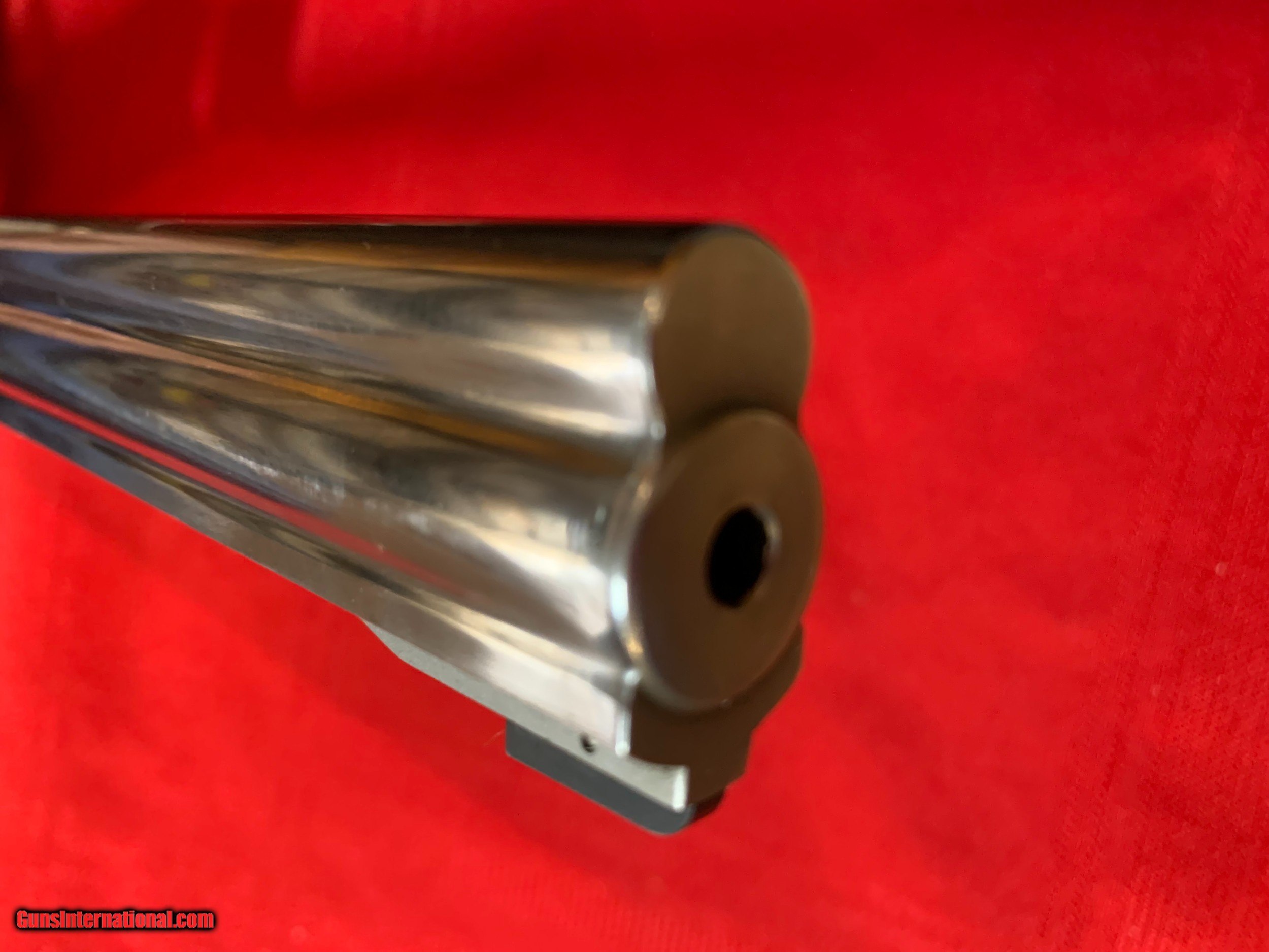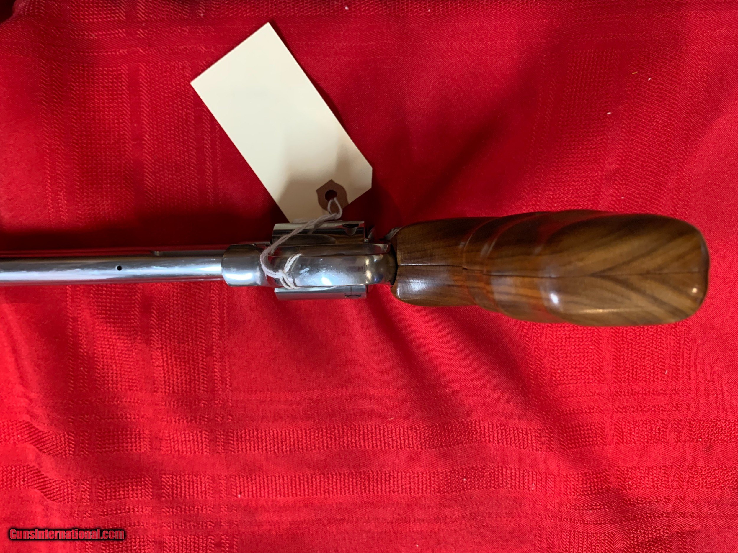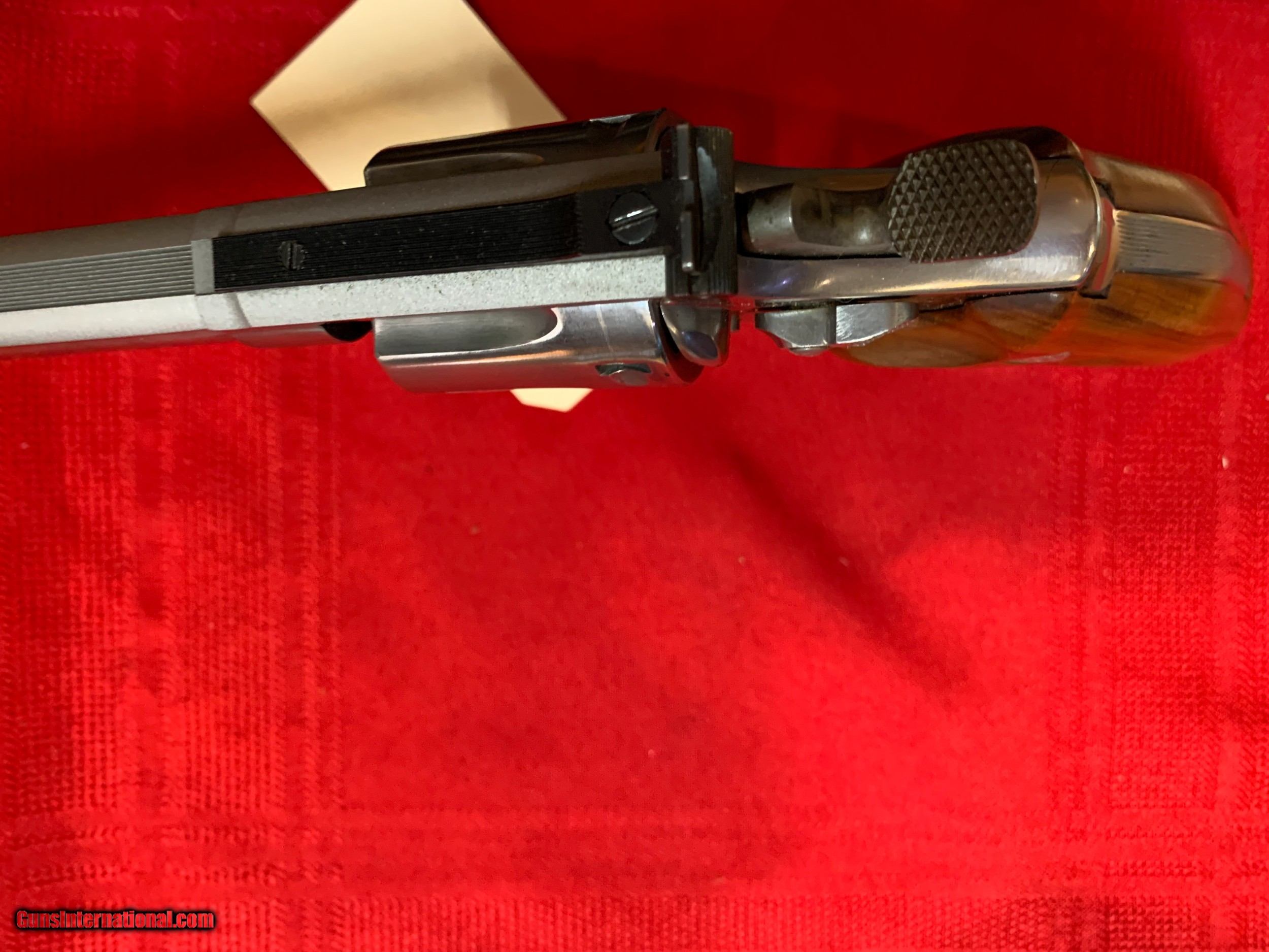 Description: Stainless steel 22 LR revolver. 8 3/8". 6 shot. Target hammer, trigger, sights. Finger groove target grips. Box is correct for gun BUT not correct serial number. Box has all paper work. SOLD Handgun Caliber: .22 Long Rifle |