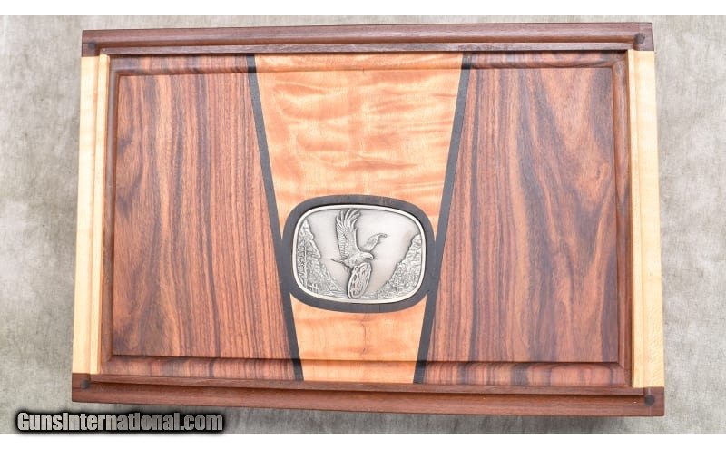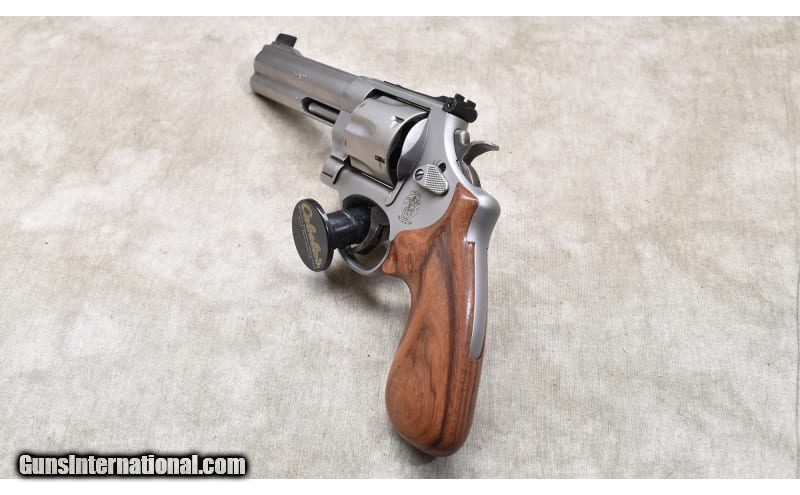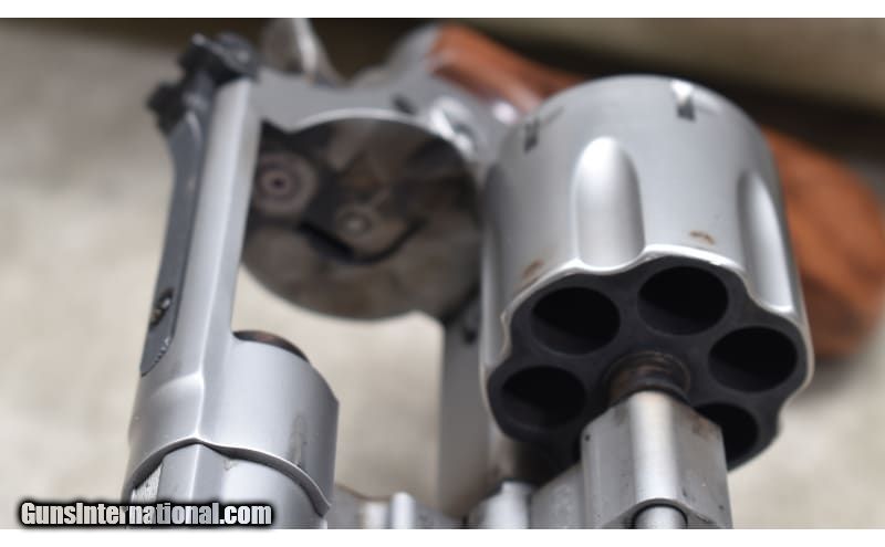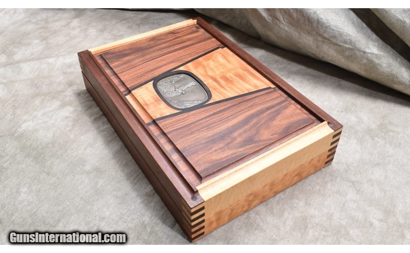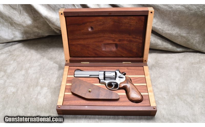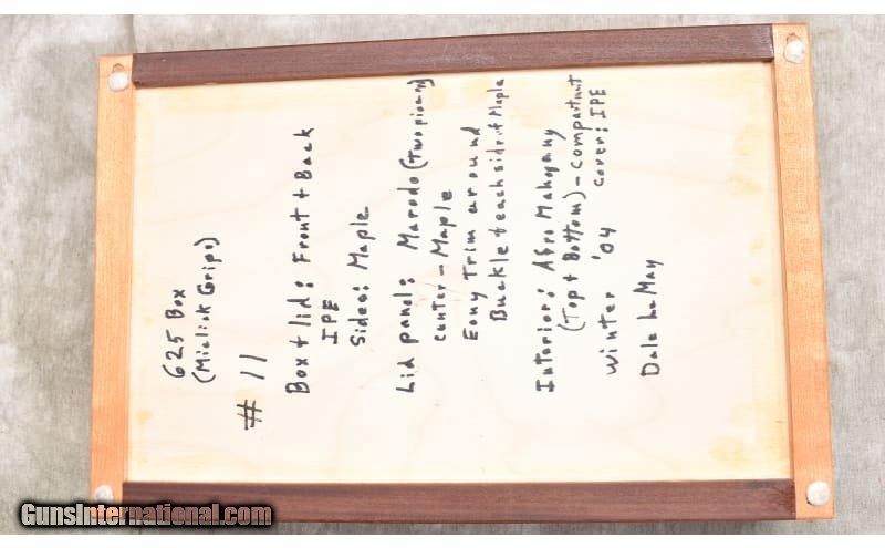Description: Nice little 5-inch stainless steel revolver with target sights, and chambered in .45 ACP. The grips are smooth and very rounded. It comes with a hand-crafted wooden display box. The full Bill-of-materials is written on the back. .45 ACP SOLD Chambers: 6 Metal Condition: Good to very good. Powder residue on cylinder and muzzle. There is a bit of a turn line. Wood Condition: Very good. Bore Condition: Shiny but a bit dark. Rifling is good. Barrels: 5-inch Triggers: Factory double and single action trigger. Butt Pad: Walnut. Weight: 42 oz. Sights: Patridge and square notch Item Location: Rogers |