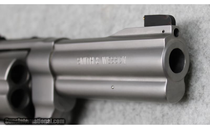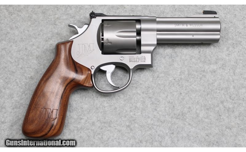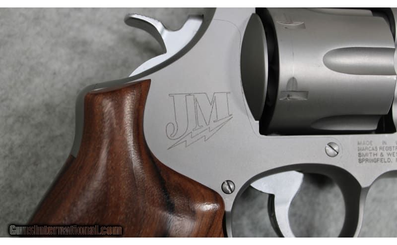 Description: This Smith & Wesson model 625-8 revolver is chambered in .45 ACP. This gun comes with its original blue hard plastic Smith & Wesson case. It features wooden grips with an engraving of the letters JM in honor of shooting legend Jerry Miculek. The same "JM" lightning bolt logo is stamped on the right side of the guns frame. .45 ACP SOLD Metal Condition: Very Good with Minor Handling Marks Wood Condition: Very Good with Minor Handling Marks Bore Condition: Bright and Clear with Good Rifling Barrels: 4 Inch Triggers: Wide grooved "speed trigger Butt Pad: Wood grips with JM lightning bolt logo Weight: 2 lb 9 oz Sights: Adjustable rear/ Gold bead partridge front sight Item Location: Fort Worth, TX |