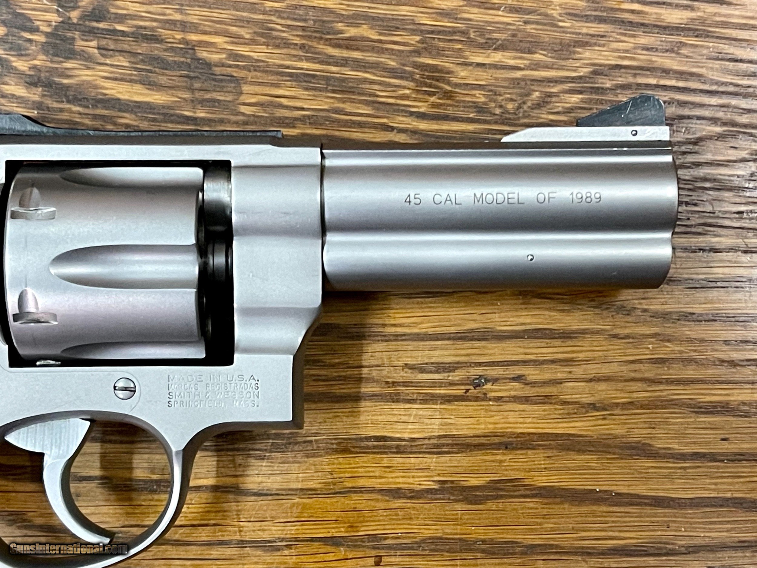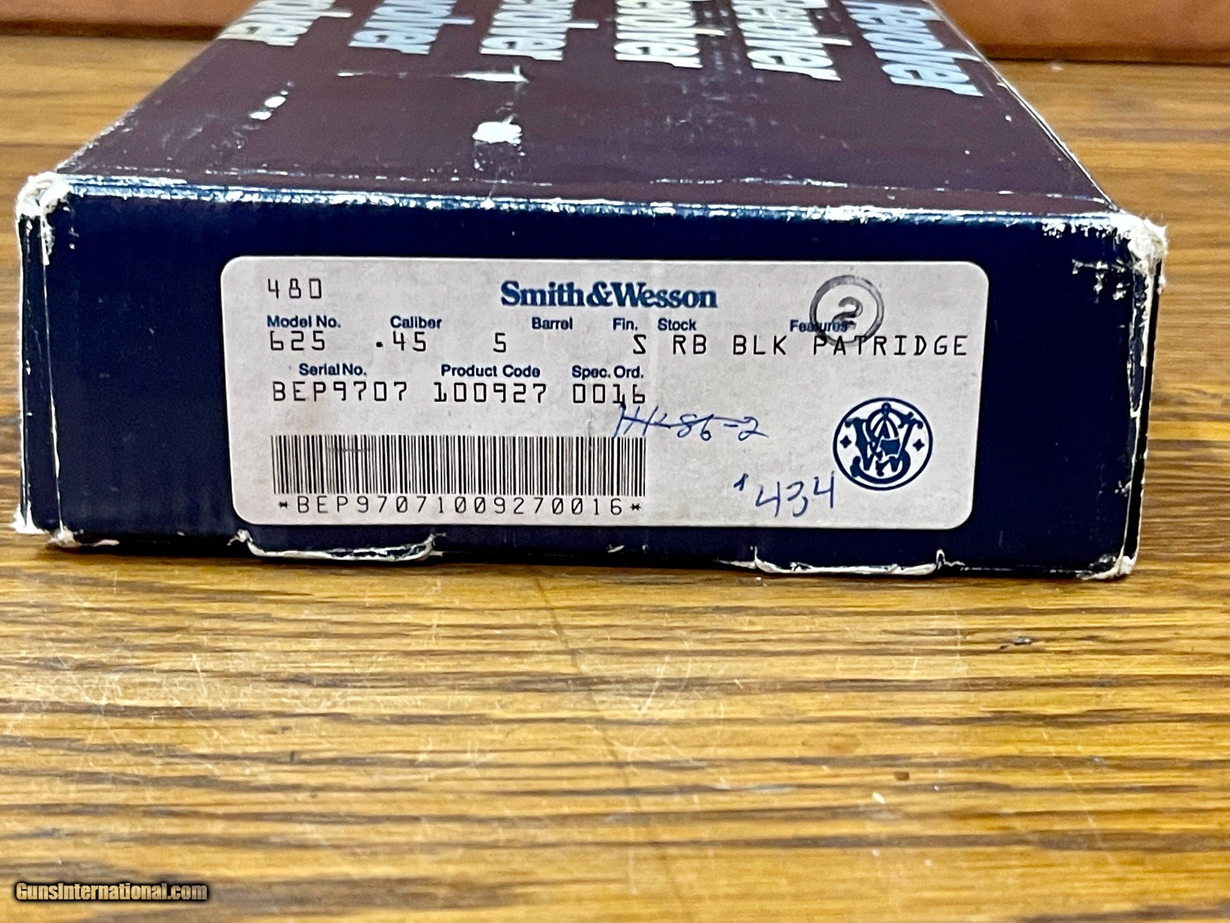 Description: Smith & Wesson Model 625-3 4" with additional 5" barrel .45 ACP This pistol is in almost unfired condition and comes as pictured with the 4" barrel as well as an additional 5" barrel, giving you great flexibility. Highly desirable "model of 1989" version. The 4" barrel is ported. Also incuded are the original box and paperwork. Sourced from the collection of a well known local historian and collector, this weapon has been well maintained and cared for. ****WE ARE ALWAYS BUYING AND ARE VERY EXPERIENCED IN ESTATE SALES TOO. LET US KNOW HOW WE CAN HELP!**** PAYMENT: -Payment must be recieved within 10 days of purchase. 3% additional charge for credit card processing. SHIPPING & HANDLING: -$30 for handguns and $45 for long guns SHIPPING FIREARMS: -Firearms shipped to FFL dealer only -We will ship upon receipt of payment and signed legible copy of dealer's FFL via Fax, Mail or E-mail. SALES TAX: -Florida residents add 7.5% sales tax. PRODUCT: -We operate a gun shop which means that every item is for sale in our store and it may have already been sold when you contact us. NEW GUNS: -On new Firearms we may use file photos instead of the actual gun. CONTACT: -Contact me with any and all questions. We want you to be happy with your purchase. PHONE #: (904) 271-5270 STORE HOURS: Mon-Fri: 11p-6pm Sat: 9a-3p BUYER: -It is Buyer's responsibility to ensure that the weapon is LEGAL to own in your city/state. SOLD Manufacturer: Smith and Wesson |