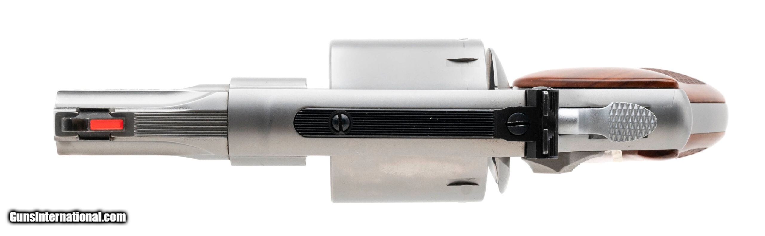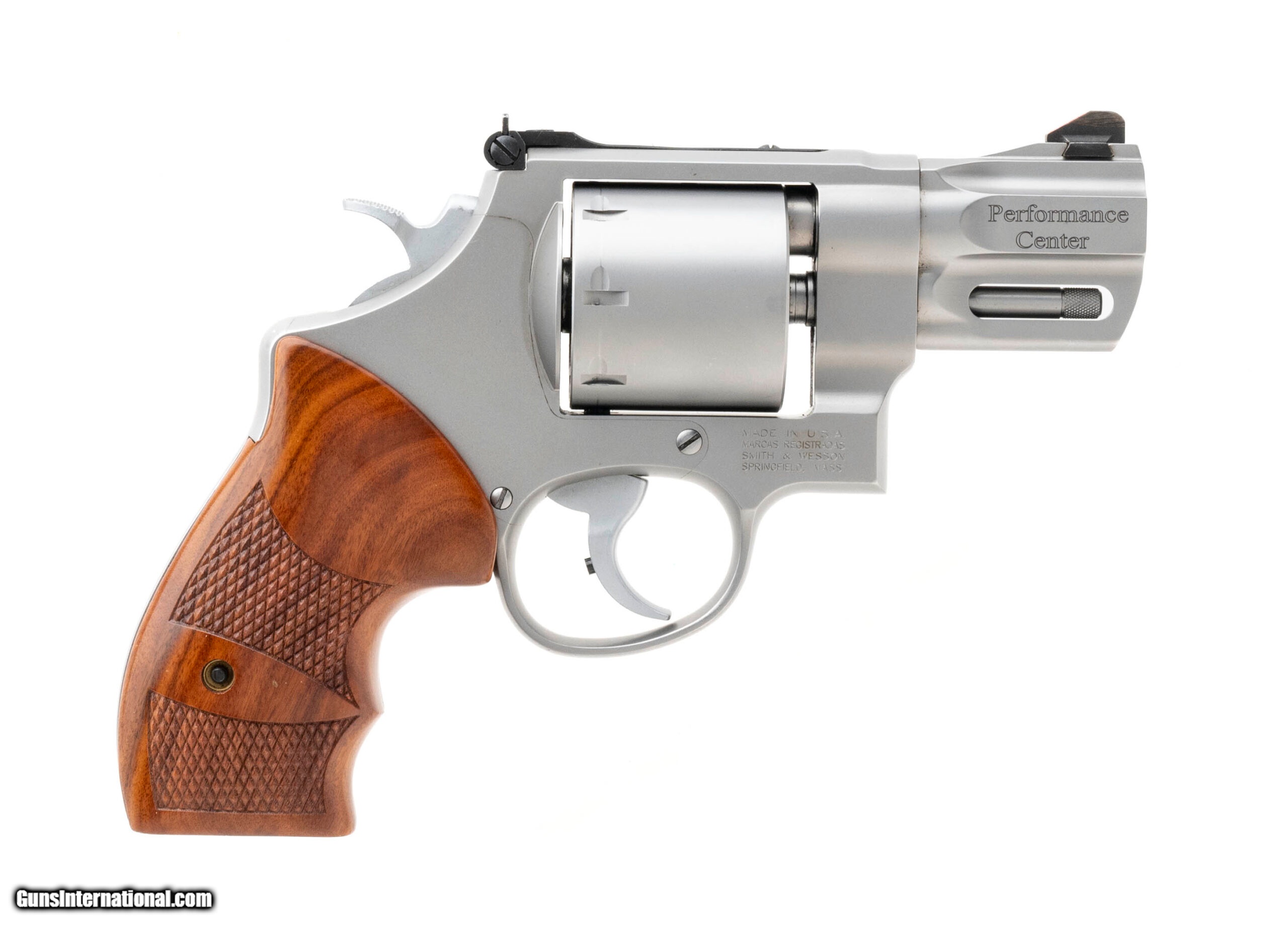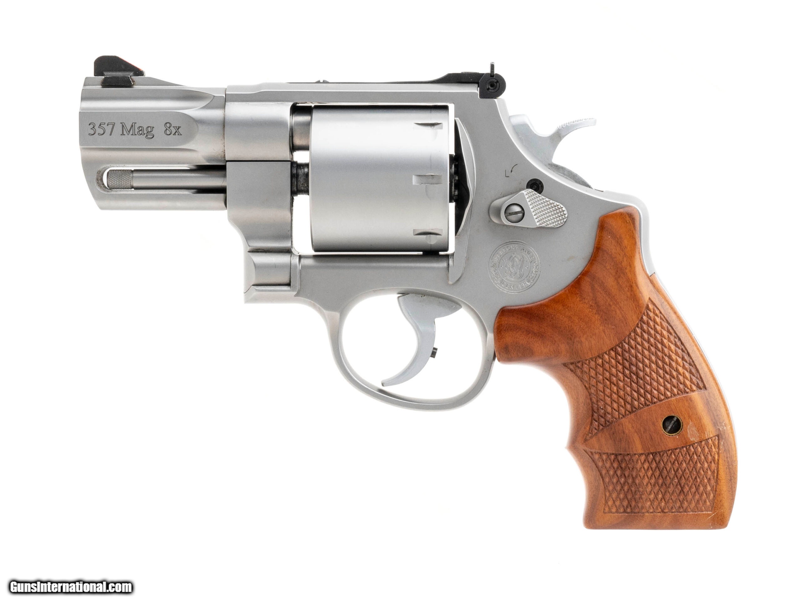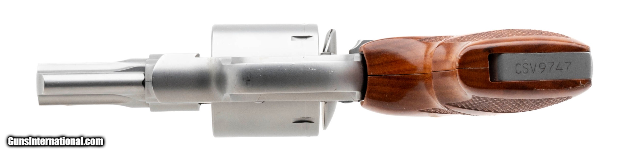 Description: "SN: CSV9747. Modern production .357 mag with a 2.75" barrel. Performance Center stainless steel snub nose revolver with wooden boot grips and unfluted cylinder. Excellent condition overall. SOLD |