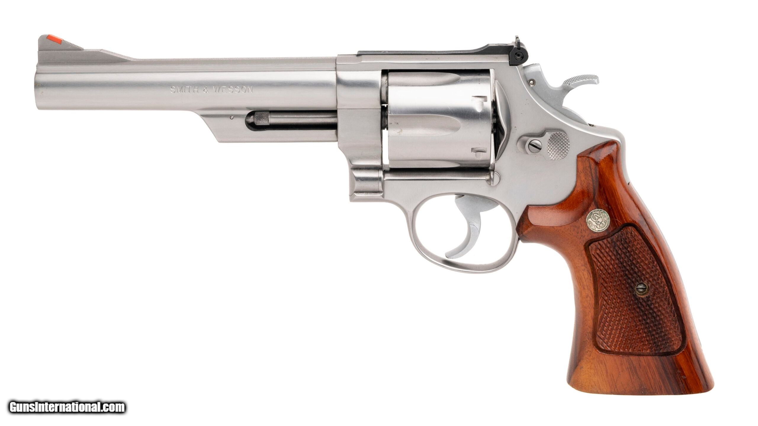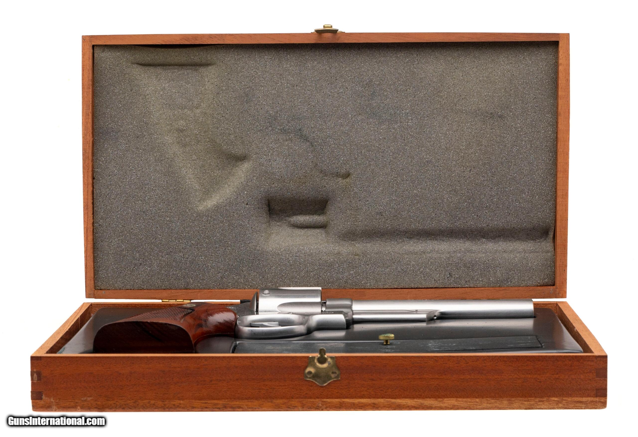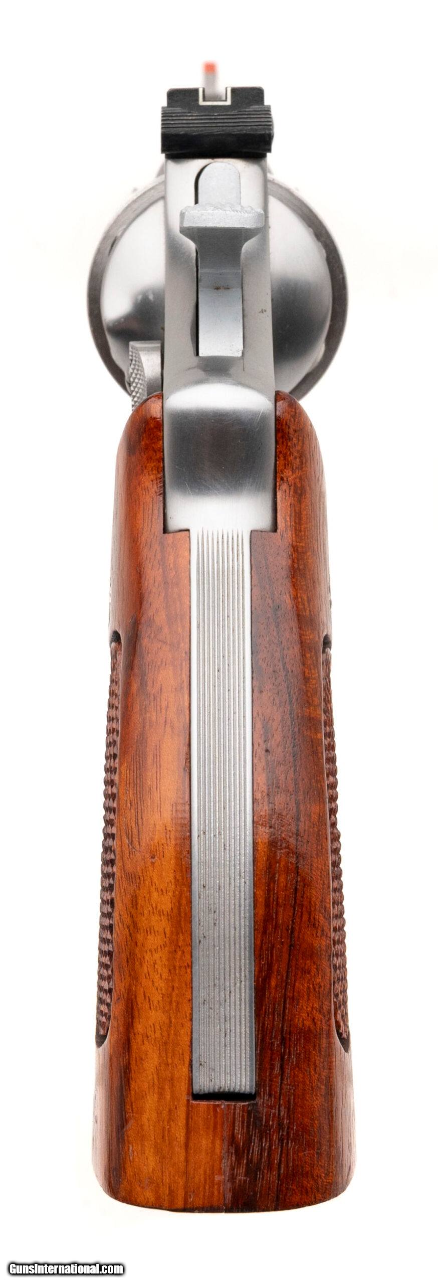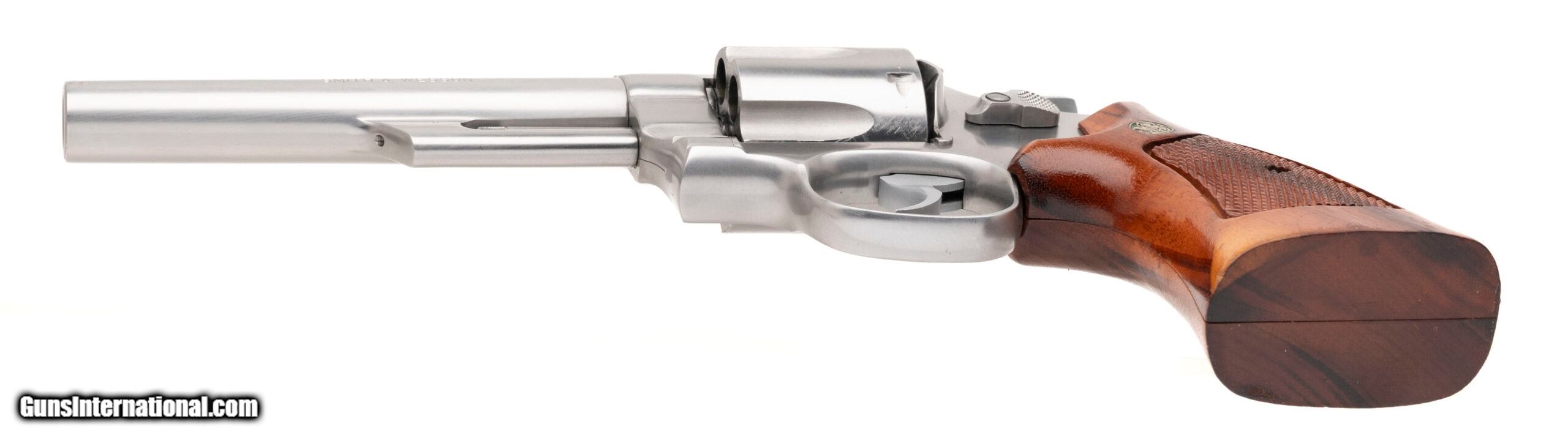 Description: "SN: AEA2420. Made circa 1980’s. S&W 44 magnum stainless steel double action N frame revolver with a 6" barrel and original checkered walnut target grips in very good overall condition. Comes with S&W wood box with fitted plastic insert. Price: $1,495.00 Contact Seller |