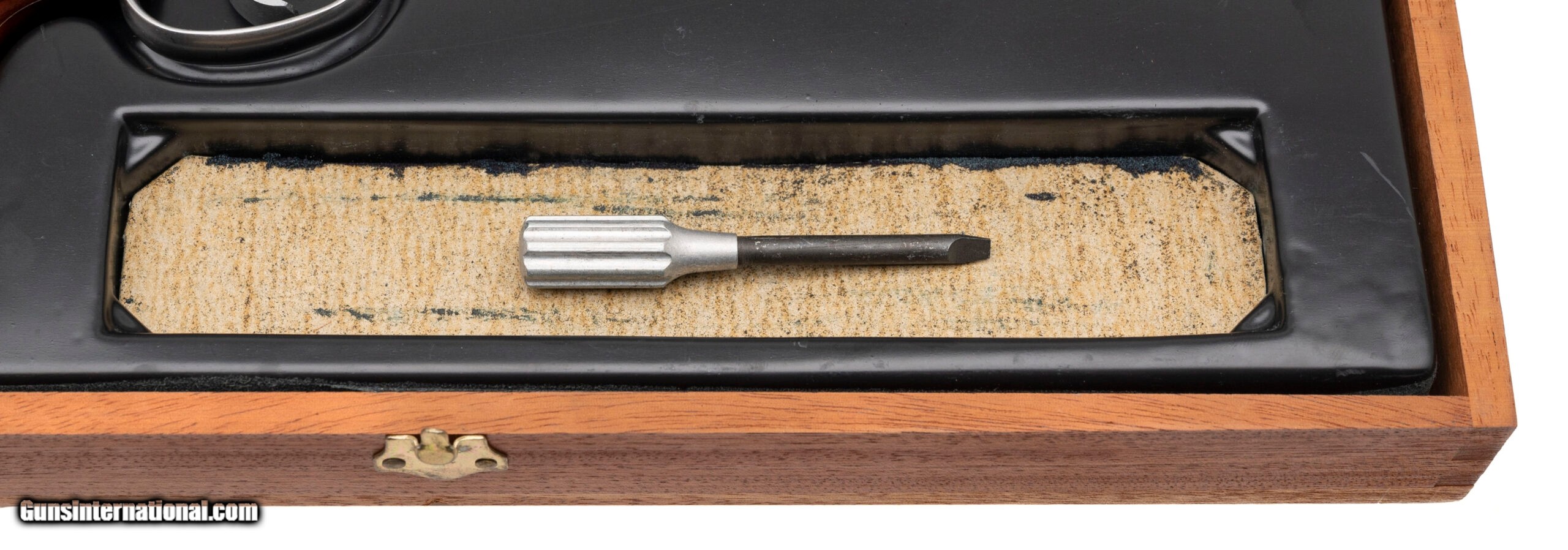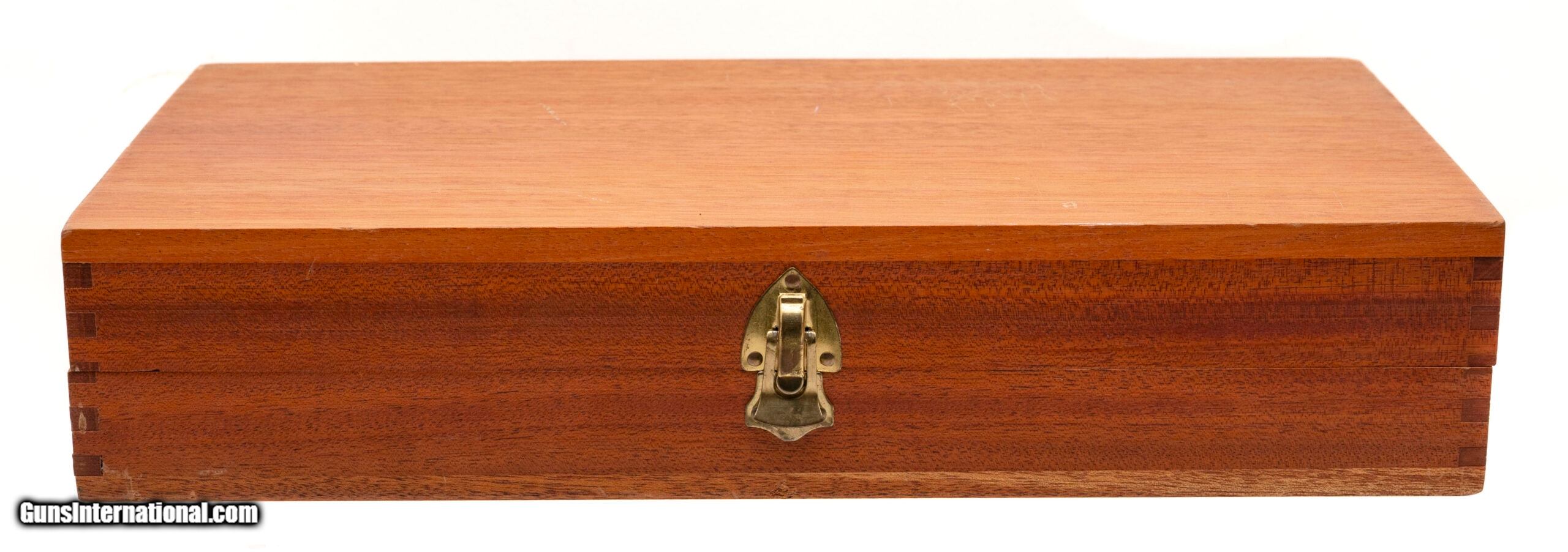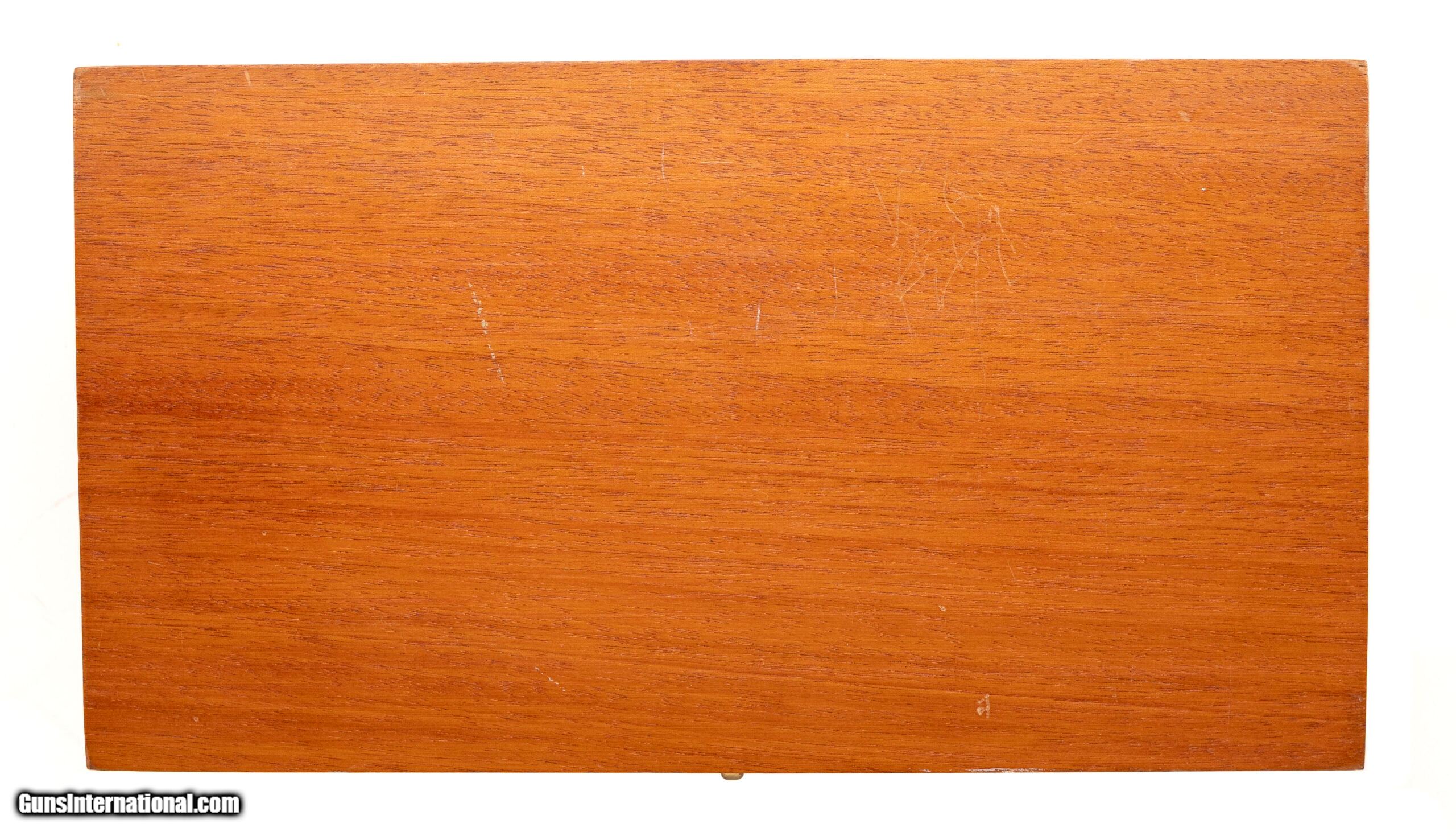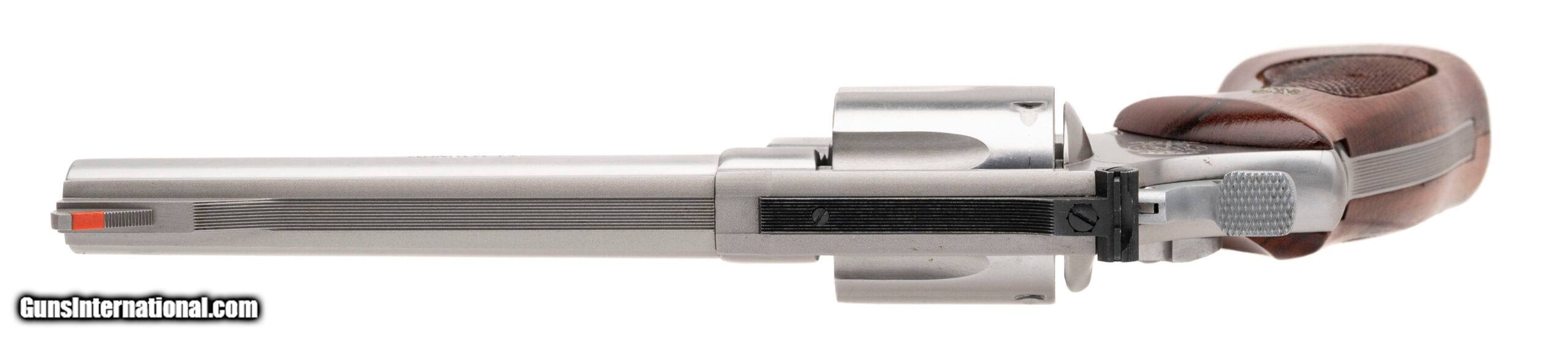 Description: "SN: AEA2420. Made circa 1980’s. S&W 44 magnum stainless steel double action N frame revolver with a 6" barrel and original checkered walnut target grips in very good overall condition. Comes with S&W wood box with fitted plastic insert. Price: $1,495.00 Contact Seller |