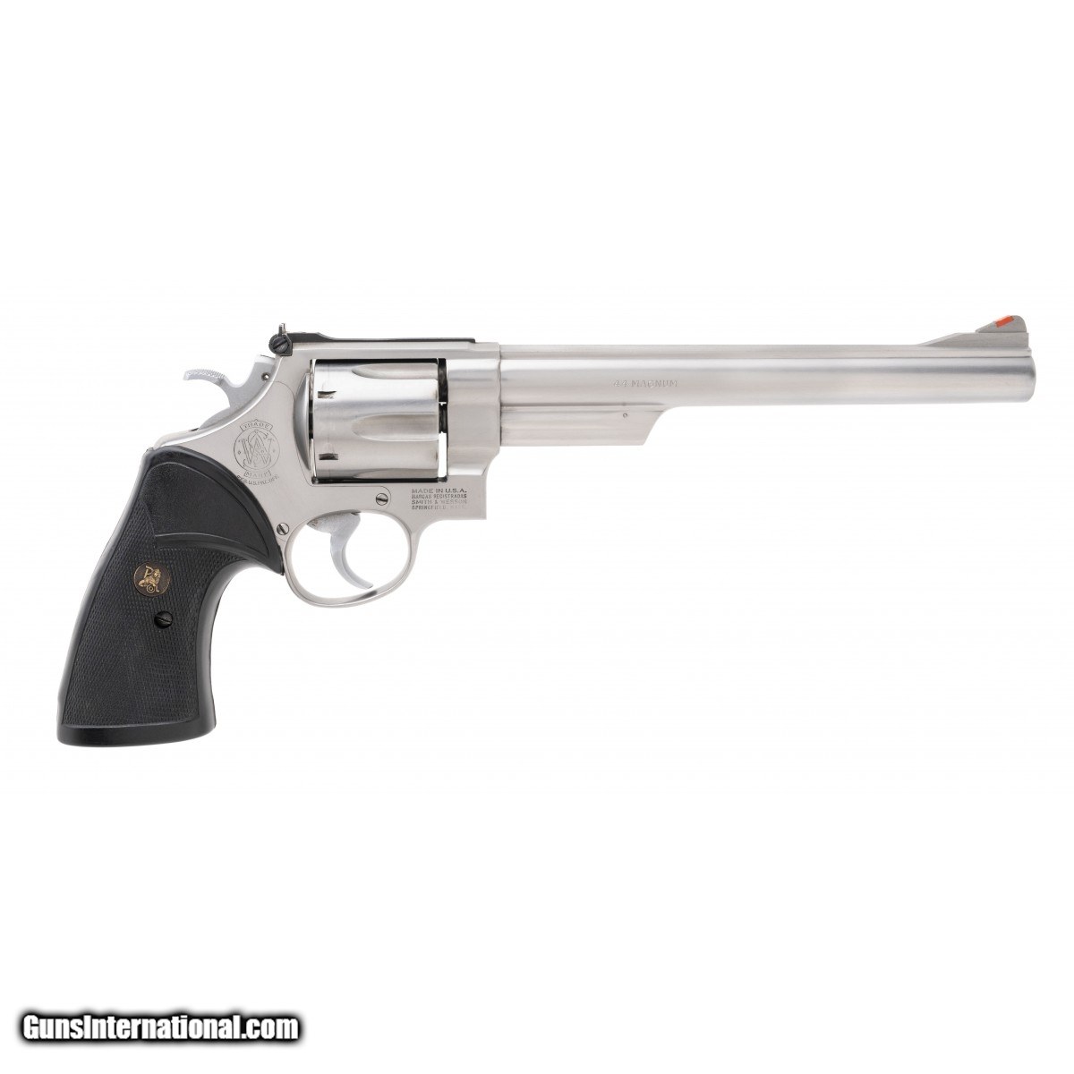 SN: AEA2358. Made circa 1980s. .44 Magnum with a 8.375"" barrel. Bore is in excellent condition. S&W double action stainless revolver. Metal is in very good condition with light muzzle wear. Grips are in excellent condition. Overall condition is excellent.