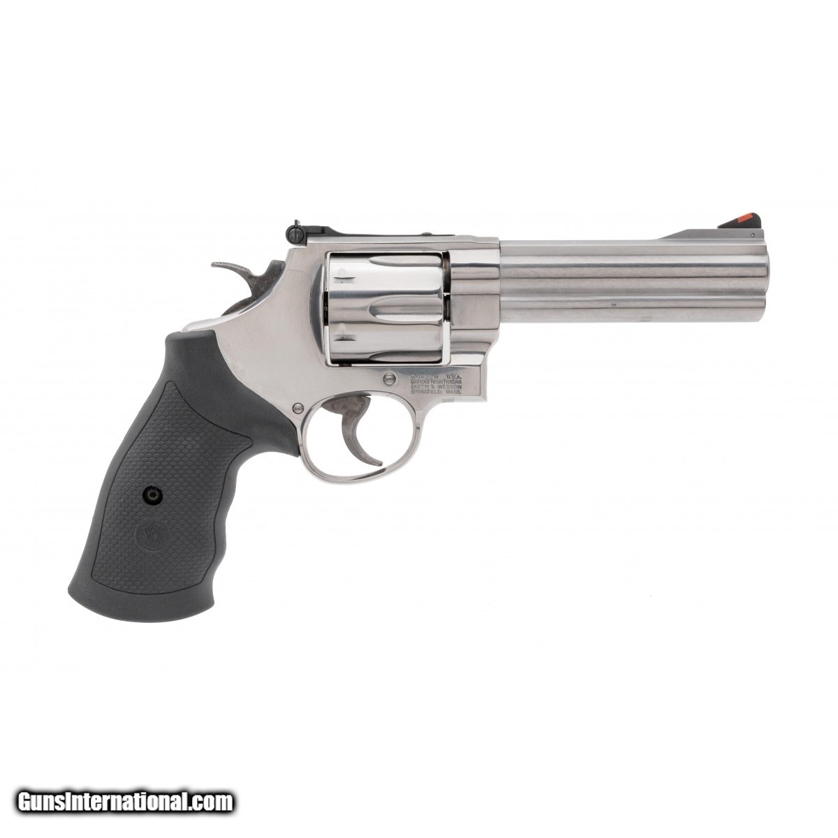 Description: " SN:DNW4362. Modern production, .44 Magnum with a 5"" barrel. bore is in excellent condition. N-frame revolver with rubber grips, stainless steel frame, red ramp front sight and swingout cylinder. Overall condition is excellent. Comes with box. SOLD |