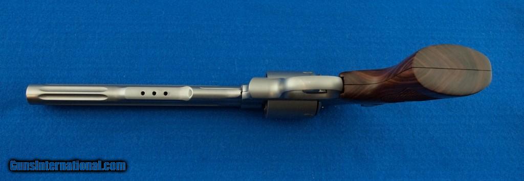 Description: S&W 629-8 Performance Center, Wbox, .44 MAG, 8 3/8" fluted bbl, bright shiny bore, good rifling, Stainless Steel finish, adjustable white outline rear sight, red fiber optic blade front sight, drilled and tapped for your favorite optic, serrated backstrap, and very nice S&W checkered wood grips with medallions. This revolver is in excellent condition. Add 3% for Credit Card Shipping $25.00 SOLD |