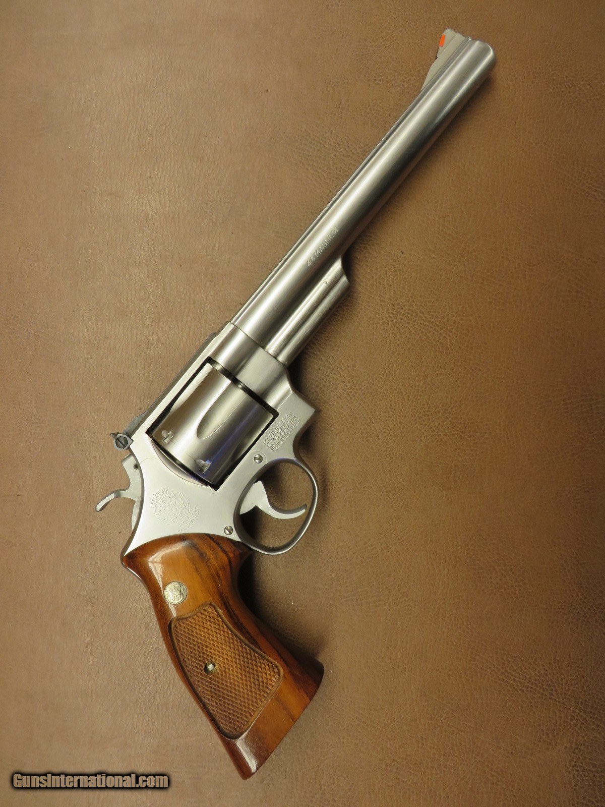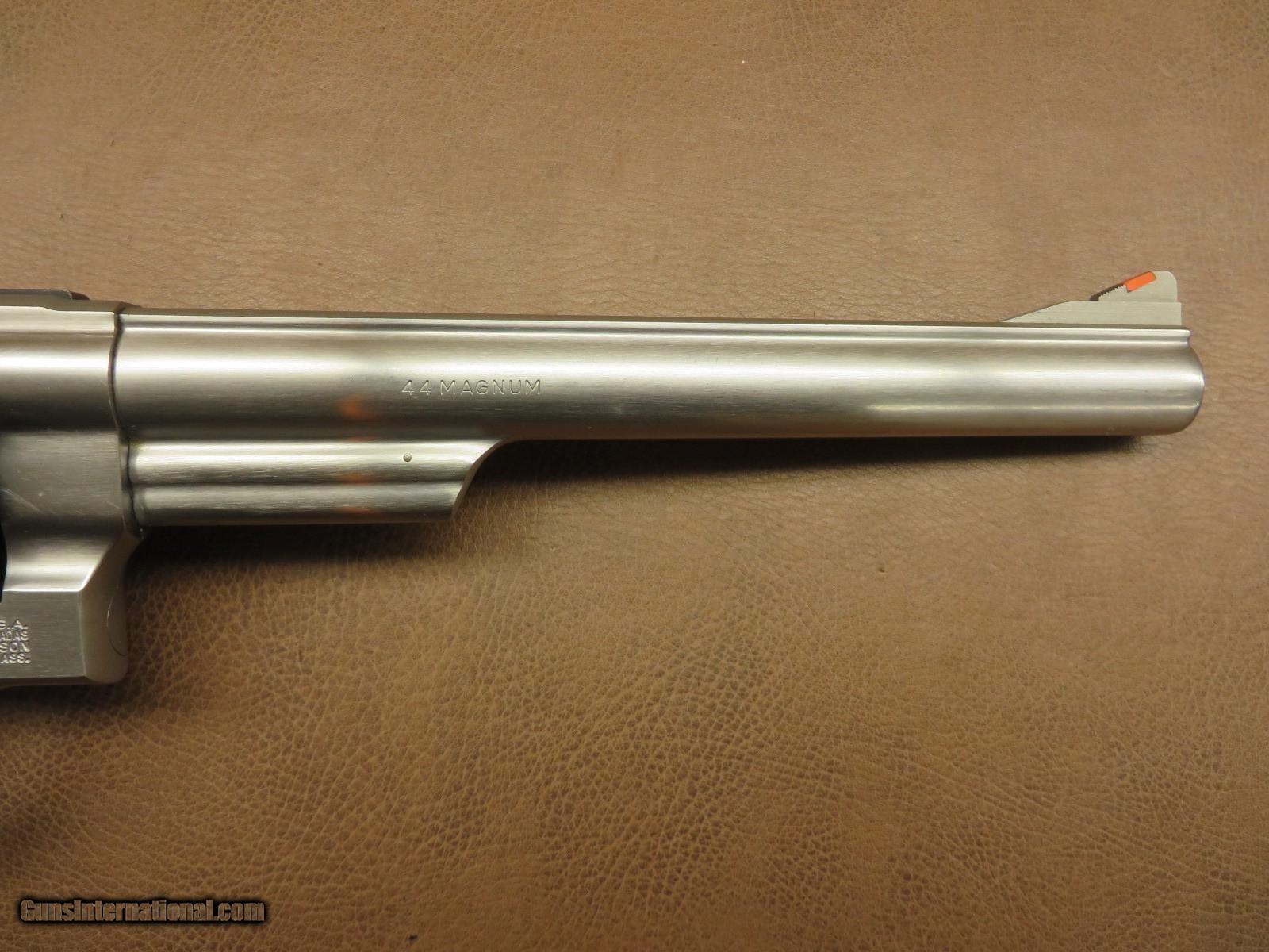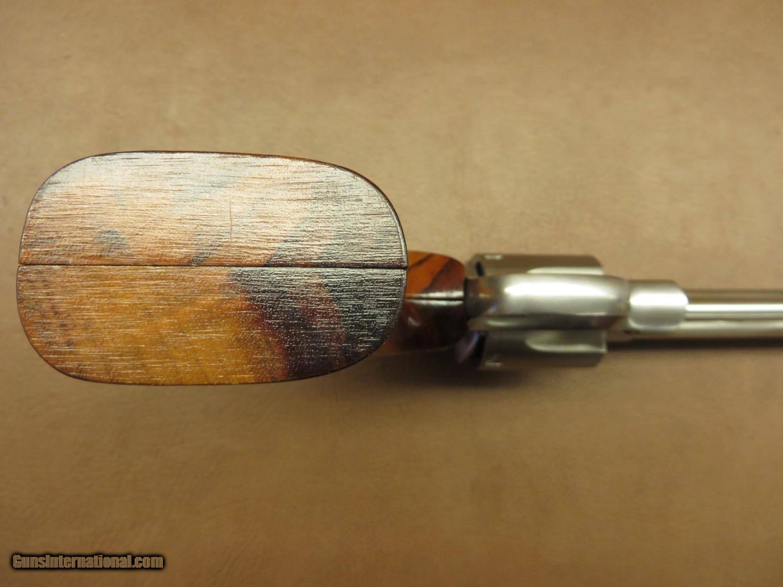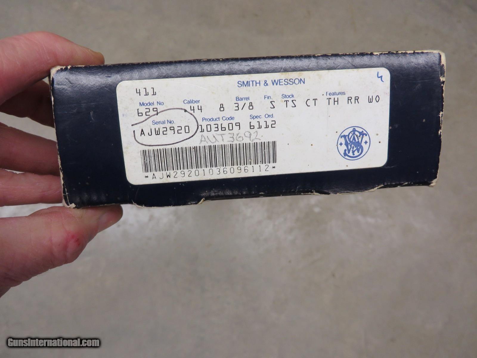 Description: .44 Magnum has 8 3/8 inch barrel with red ramp front sight and white outline adjustable rear. All stainless steel with checkered wood Target grips. Serial number AUT3xxx. Excellent condition in 629 box with papers but box is not numbered to this gun. SOLD Handgun Caliber: .44 Remington Magnum |