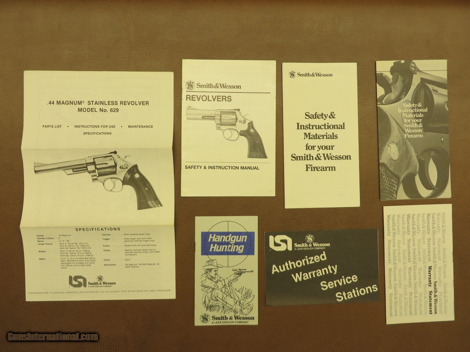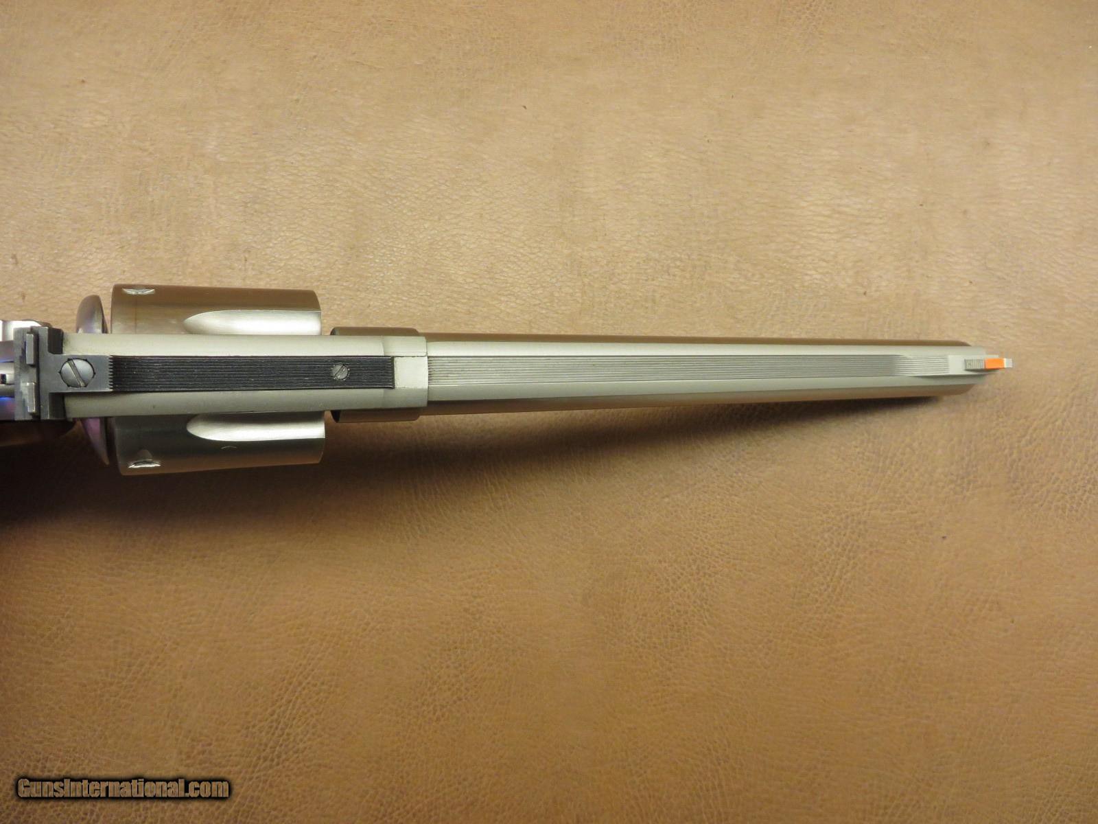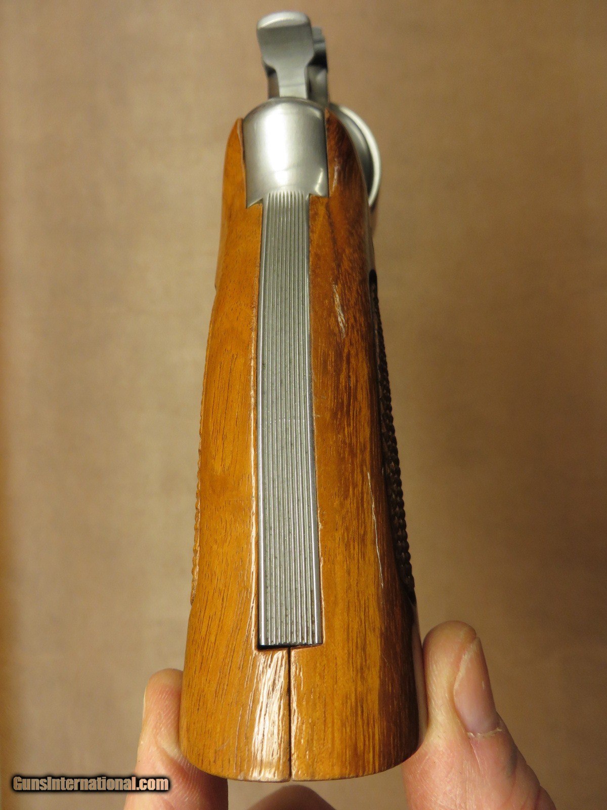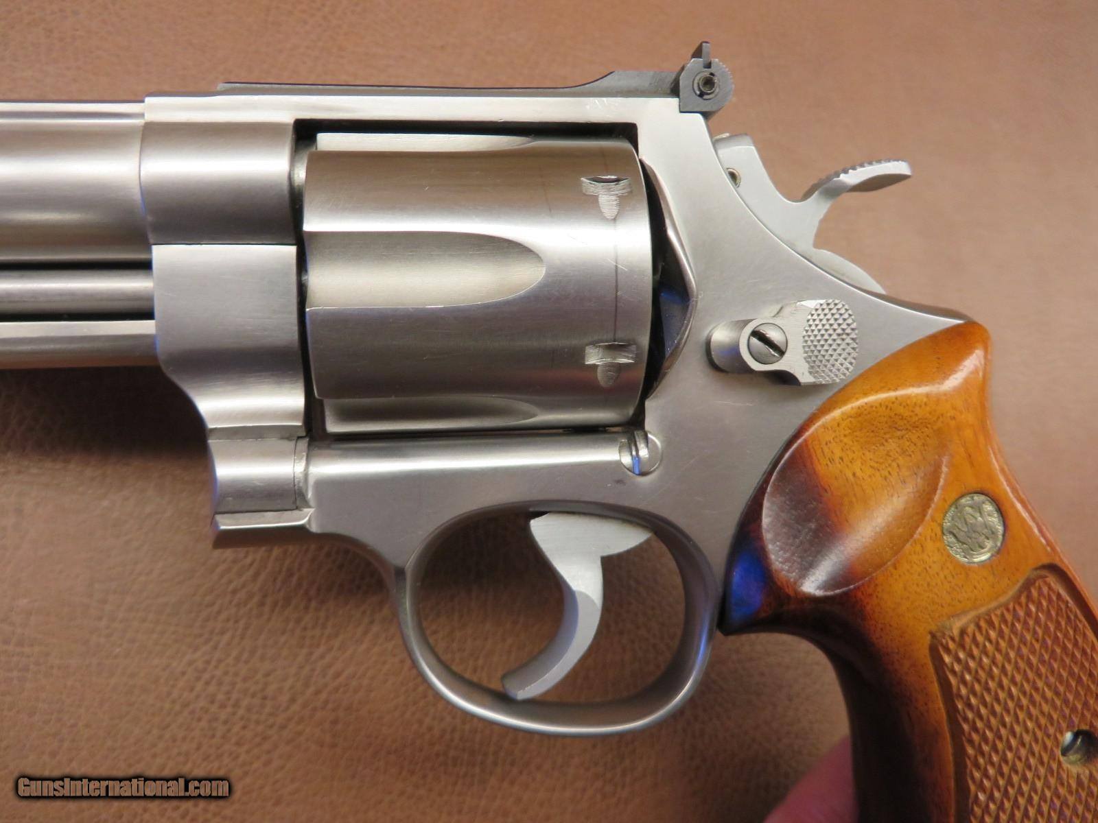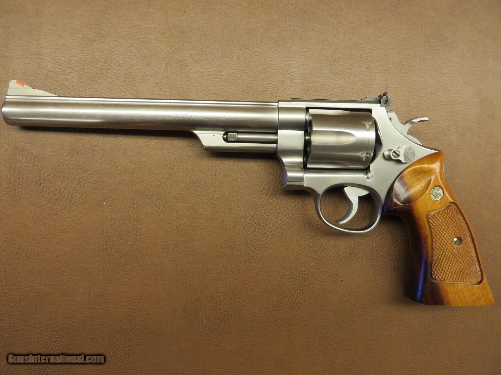 Description: .44 Magnum has 8 3/8 inch barrel with red ramp front sight and white outline adjustable rear. All stainless steel with checkered wood Target grips. Serial number AUT3xxx. Excellent condition in 629 box with papers but box is not numbered to this gun. SOLD Handgun Caliber: .44 Remington Magnum |
