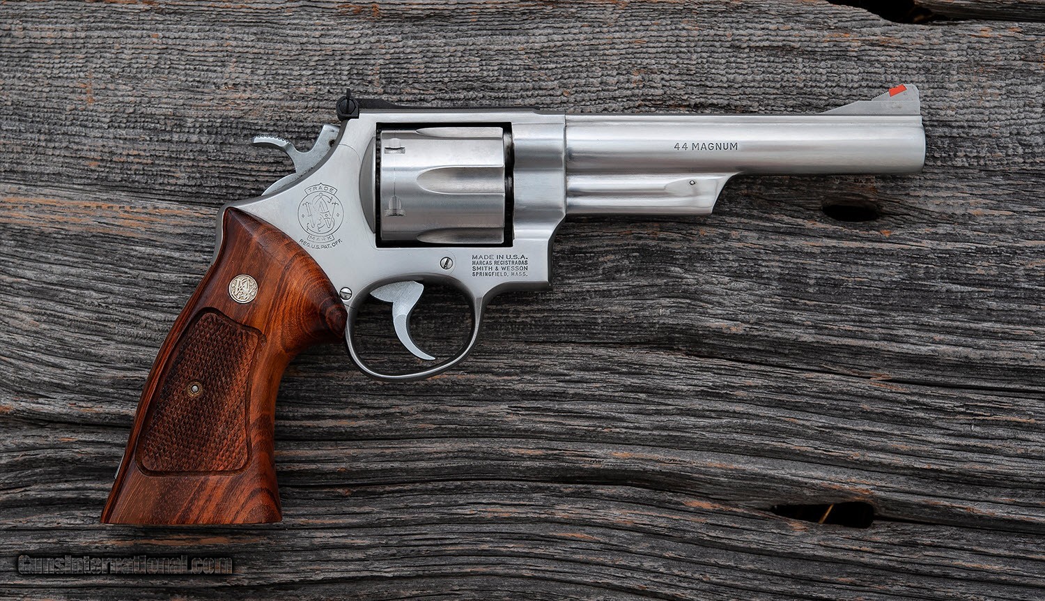 Description: Smith & Wesson - 629-1 - 44 MAG - Item Number: SMIADF8516 Barrel length: 6 Finish: Stainless Lop: NA Lbs: 3 Ozs: Overall condition: Very Good Stock condition: Very Good Metal condition: Very Good Stock:Original Metal:Original Type of Case: Factory Box Manufactured in: USA Comments: Very clean gun, wide target hammer and trigger, includes factory box, papers, and cleaning kit. HG-31 SOLD |