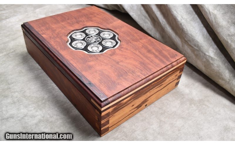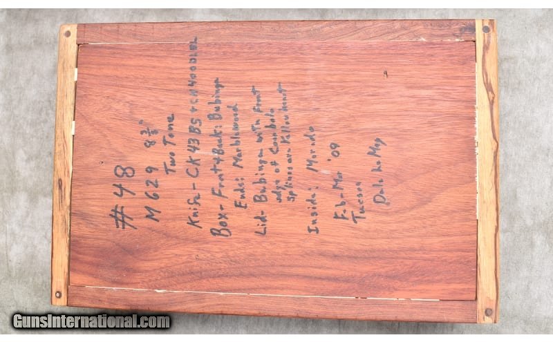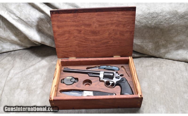 Description: Featuring steel frame "in the white" and blue barrel and cylinder, this one is sure to attract attention. It comes with a hand-crafted wooden display box with bill-of-materials written on the back. .44 Magnum SOLD Chambers: 6 rounds Metal Condition: Excellent. Wood Condition: Excellent. Bore Condition: Shiny and bright with good rifling. Barrels: 8-3/8 inches Triggers: Factory double and single action trigger. Butt Pad: Black rubber Pachmyr Presentation grips. Weight: 52 oz. Sights: "Serrated ramp with red insert, square notch with white outline. Item Location: Rogers |