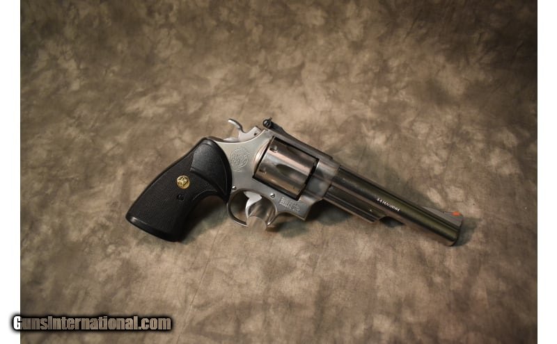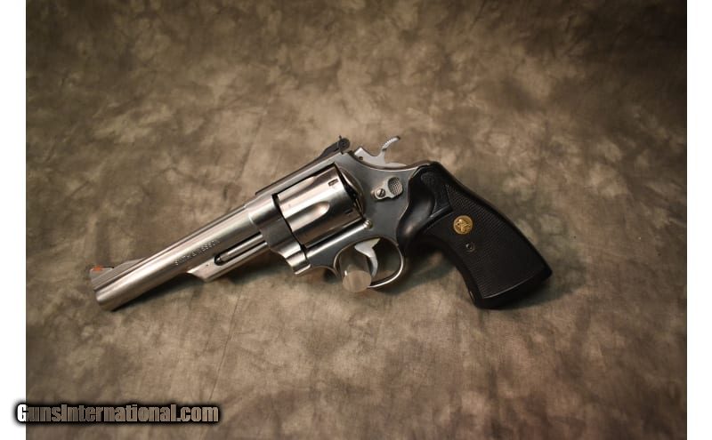 Description: This Smith & Wesson 629-1 comes with plastic checkered grips and adjustable iron sights. The metal is in good condition but shows some signs of use with some minor scuffs throughout, and some surface rust on the face of the cylinder. The grips have also been fairly used, but is overall in good condition. This gun comes as is with no box. .44 Remington Magnum SOLD Chambers: .44 Magnum Metal Condition: Good Bore Condition: Bright Barrels: 6 inch Weight: 2 lbs 10 oz Sights: Iron sights adjustable Item Location: Springfield, MO |