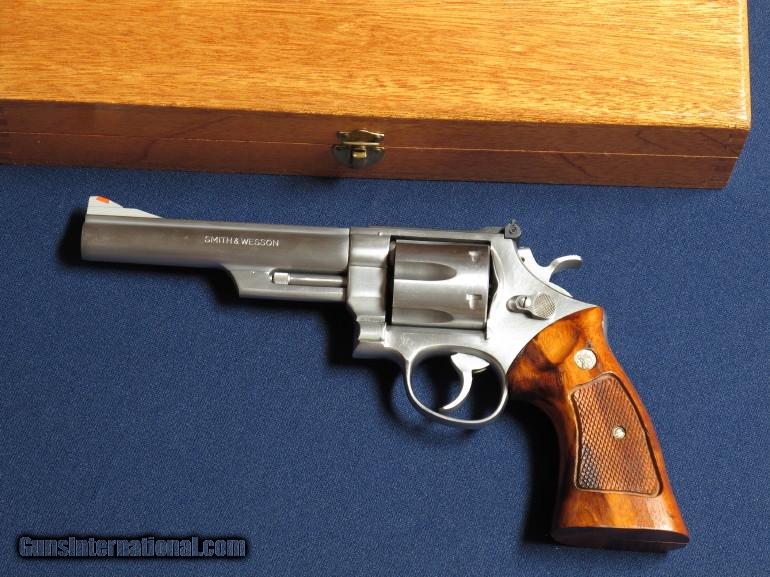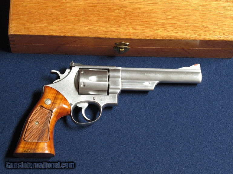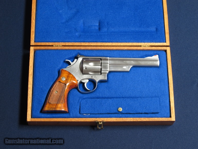 Description: Smith & Wesson 629 44 mag. Stainless. Pinned and recessed. Target hammer, trigger, and grips. Red ramp white outline sights. 98% with case. SOLD |