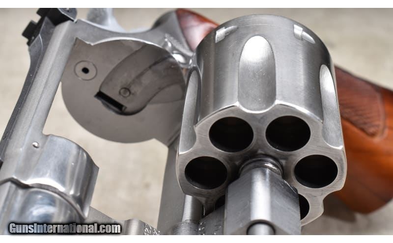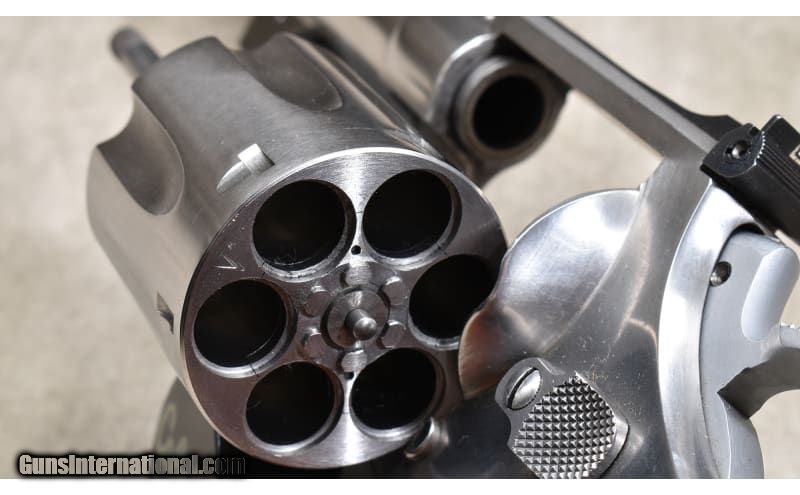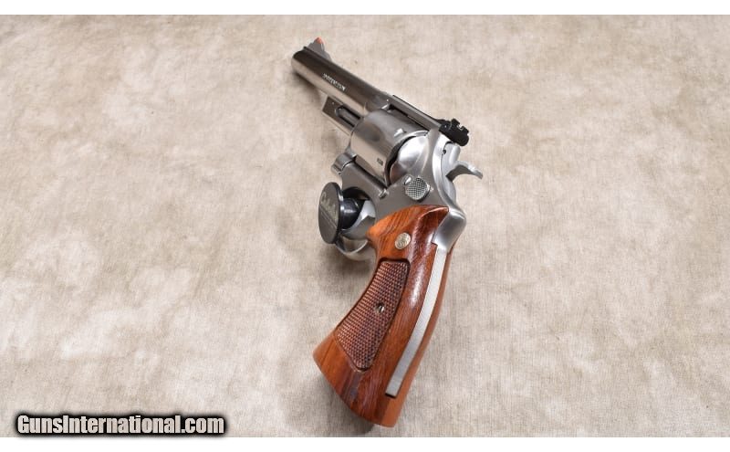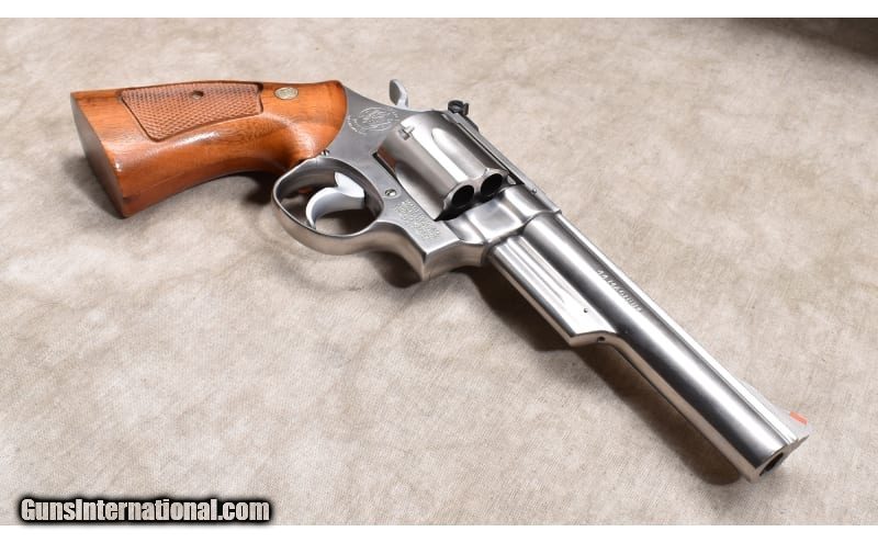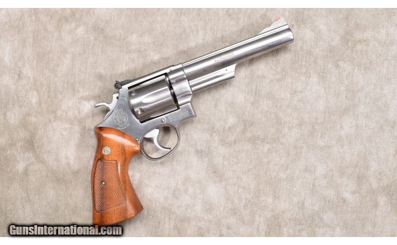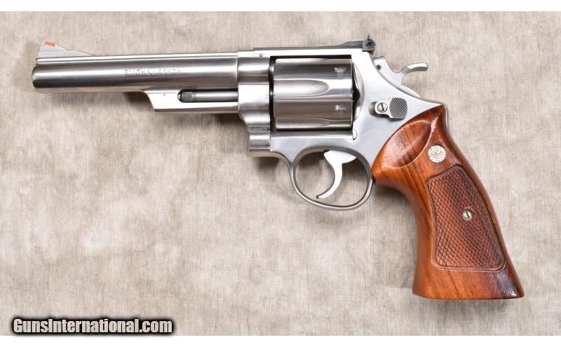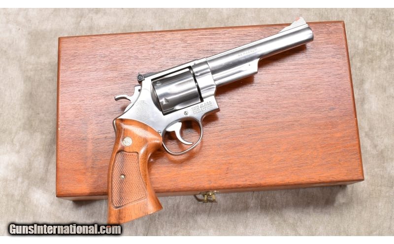Description: Excellent example of the "most powerful handgun in the world," done in stainless steel. The gun does not look fired and there is only a faint turn line. .44 Magnum SOLD Chambers: 6 rounds Metal Condition: Excellent. There is a very faint turn line. Wood Condition: Excellent. Bore Condition: Shiny and bright with good rifling. Barrels: 6-inch Triggers: Factory double and single action trigger. Butt Pad: Checkered walnut with S&W medallions Weight: 47 oz. Sights: Serrated ramp with red insert and adjustable notch open sights. Item Location: Rogers |